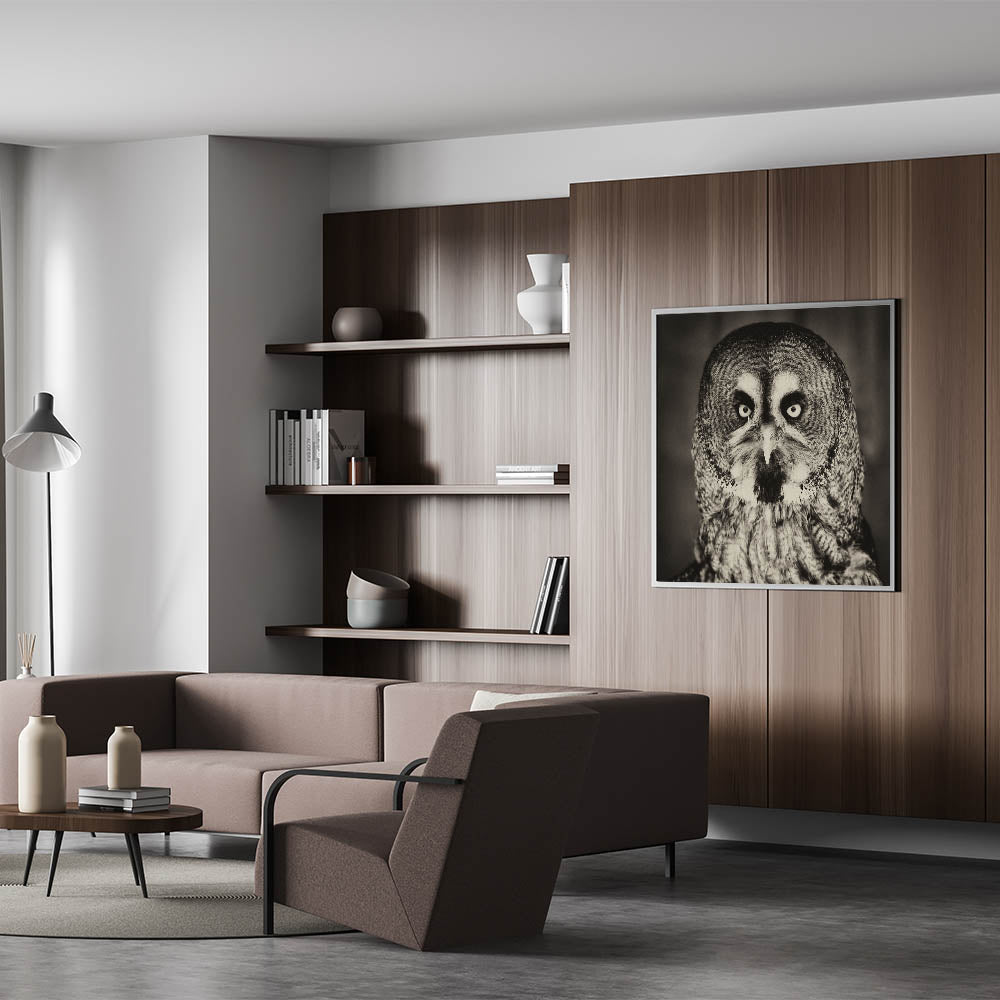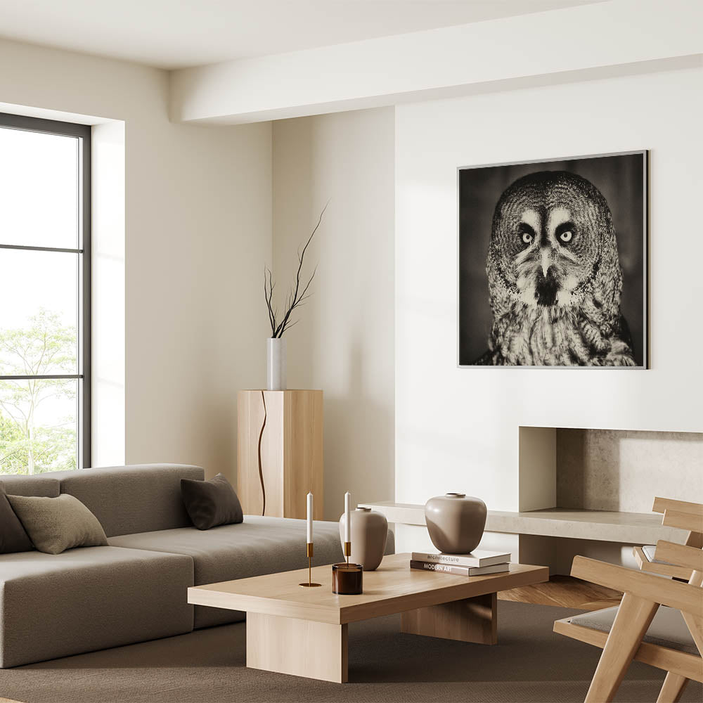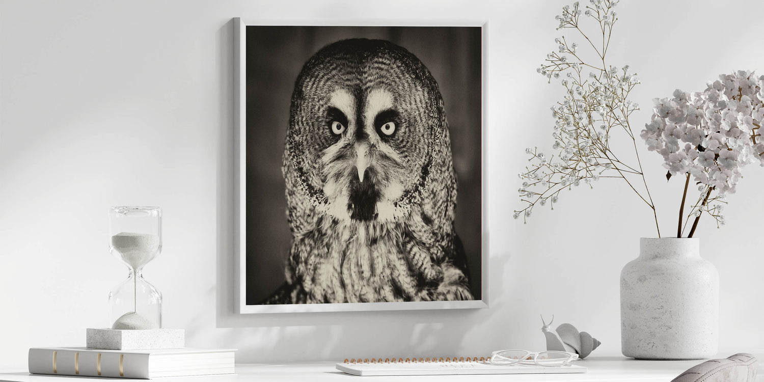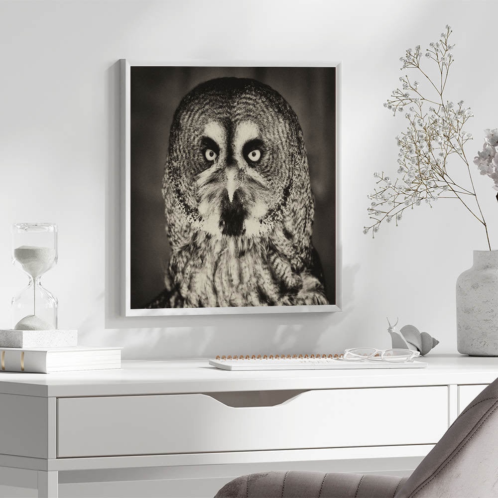 Introduce a touch of vintage elegance to your space with this Striking Owl Wall Art. This captivating black-and-white artwork features a mesmerizing close-up of an owl, its intense gaze drawing you in. The detailed textures of the owl’s feathers combined with the rich contrasts of monochrome tones give this piece a timeless quality. The sepia-like effect adds a vintage charm that blends beautifully with both modern and classic decor.