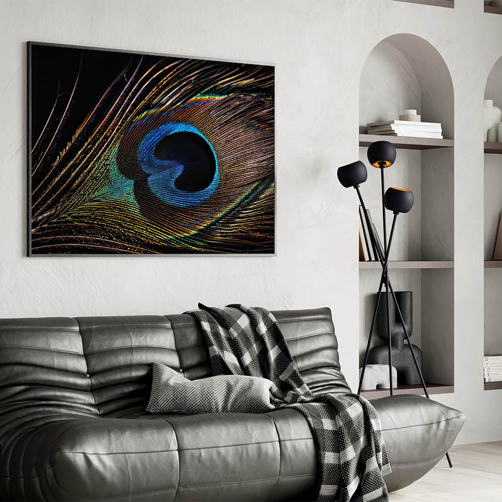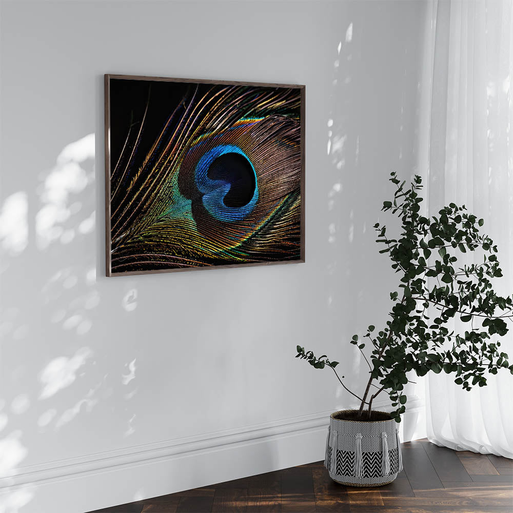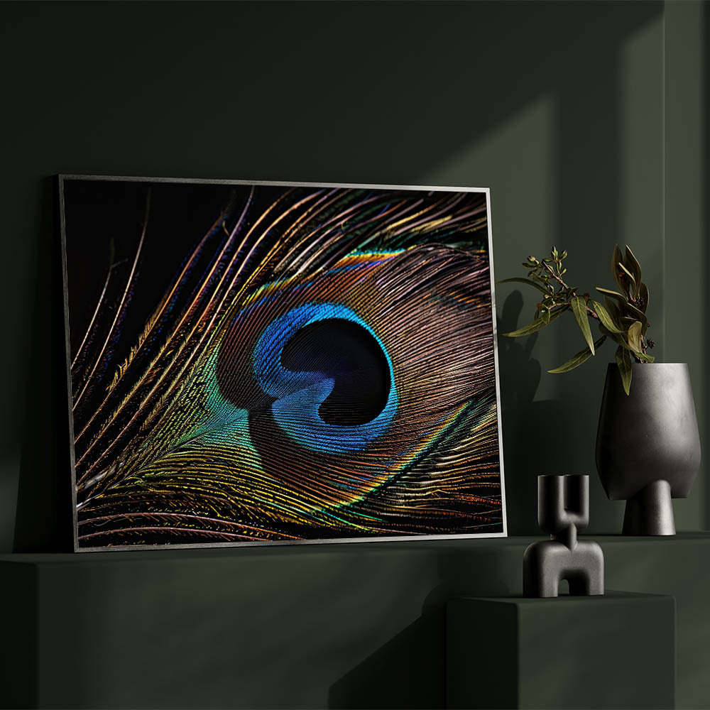 • High-definition print that highlights the fine details and vibrant colors of the peacock feather.