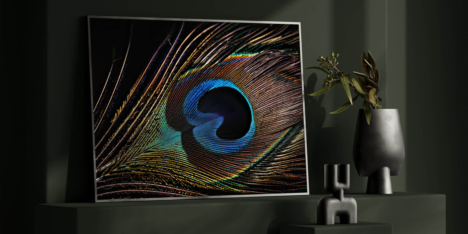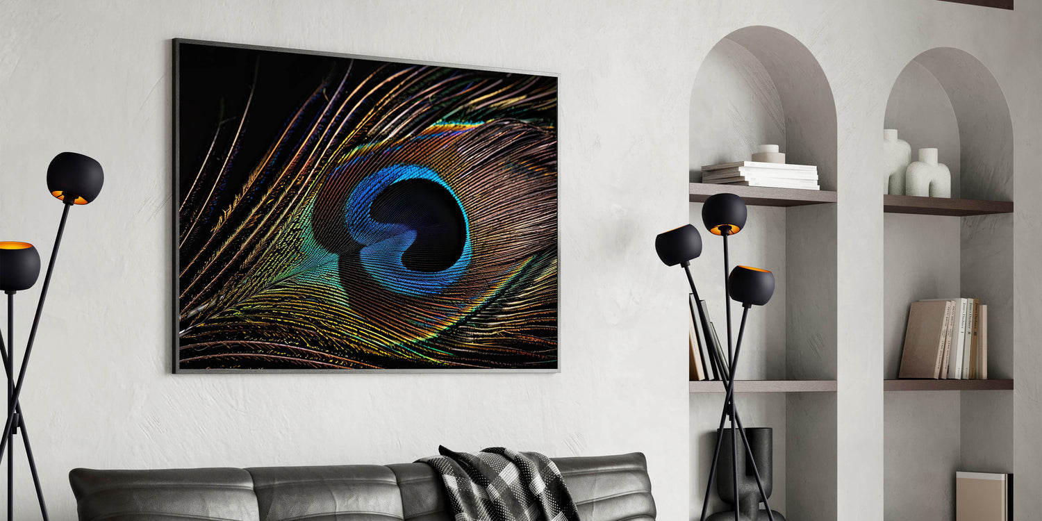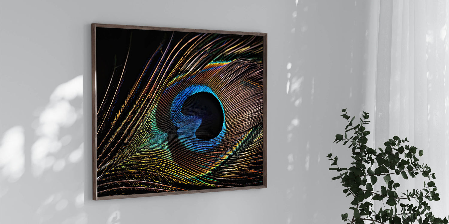 • High-definition print that highlights the fine details and vibrant colors of the peacock feather.