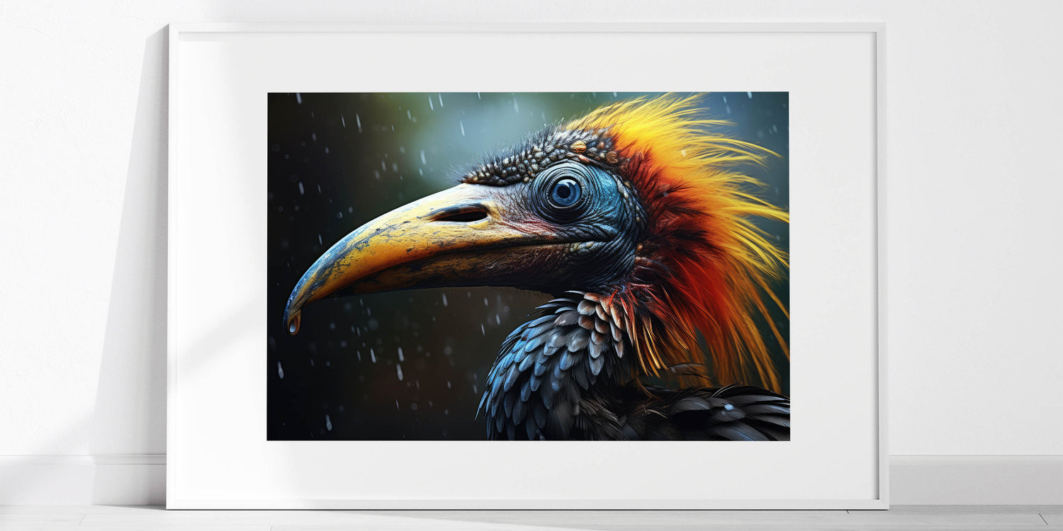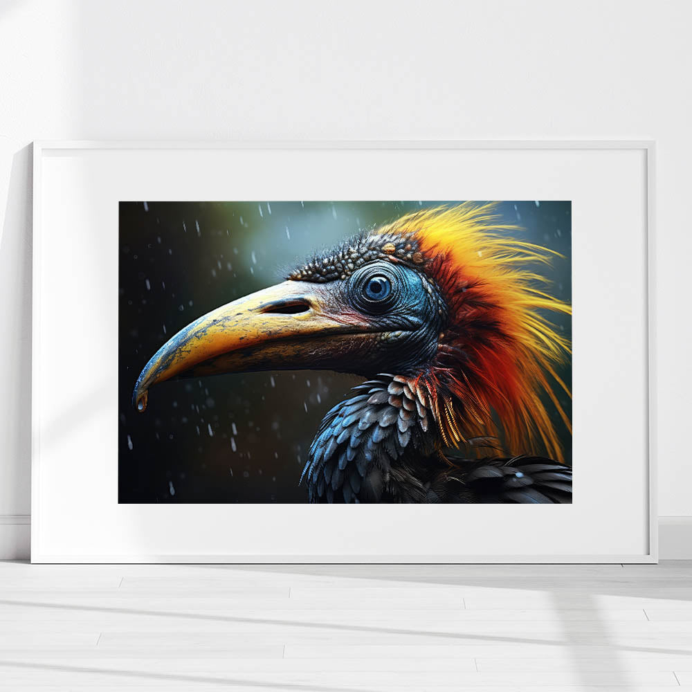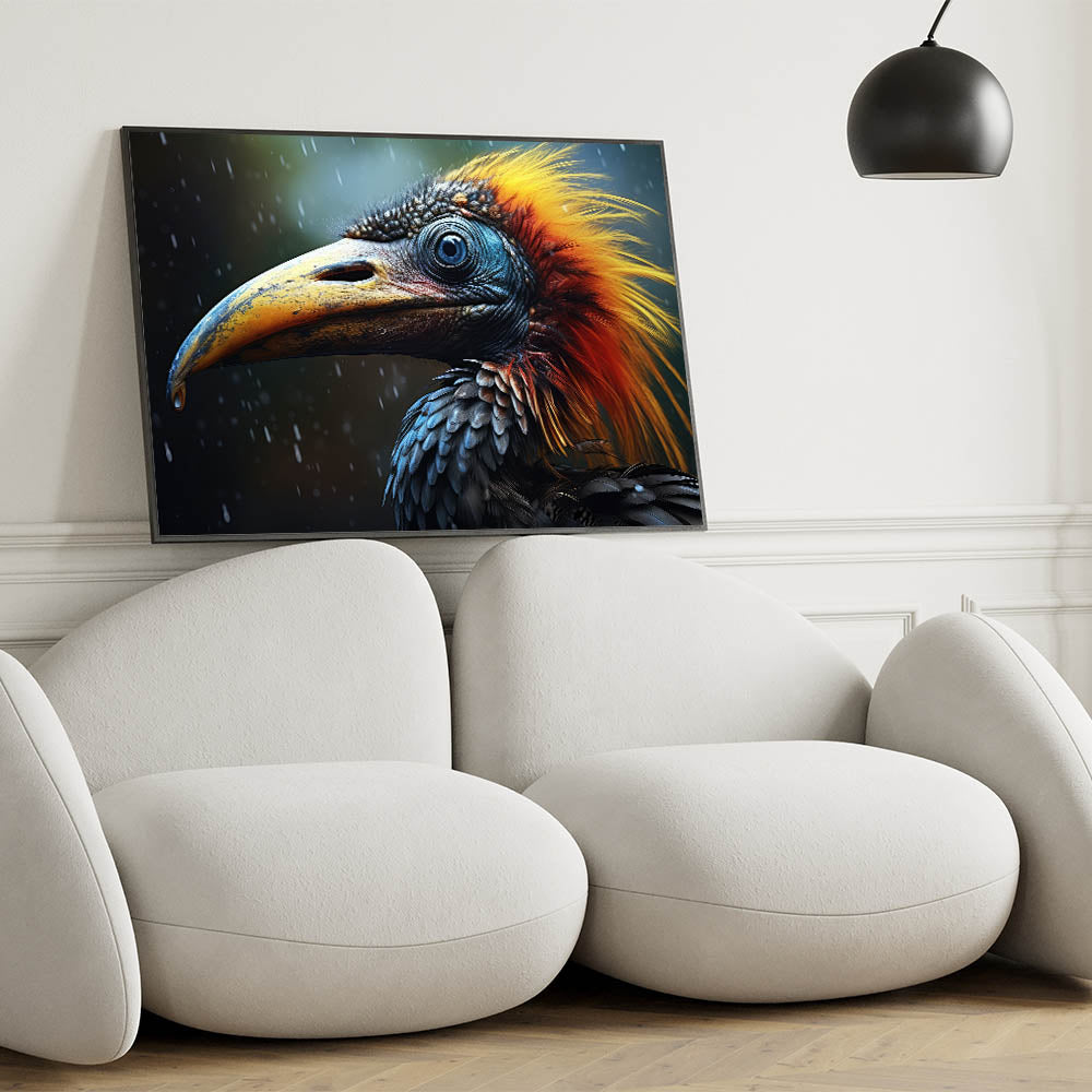 Capture the untamed beauty of the wild with this Dramatic Tropical Bird Wall Art. This stunning artwork features a close-up of a majestic bird, with intricate details that bring out the texture of its feathers and the intensity of its gaze. The vibrant orange and blue tones against a dark, rainy backdrop create a dramatic contrast that will draw the eye and make this piece a focal point in any room.
