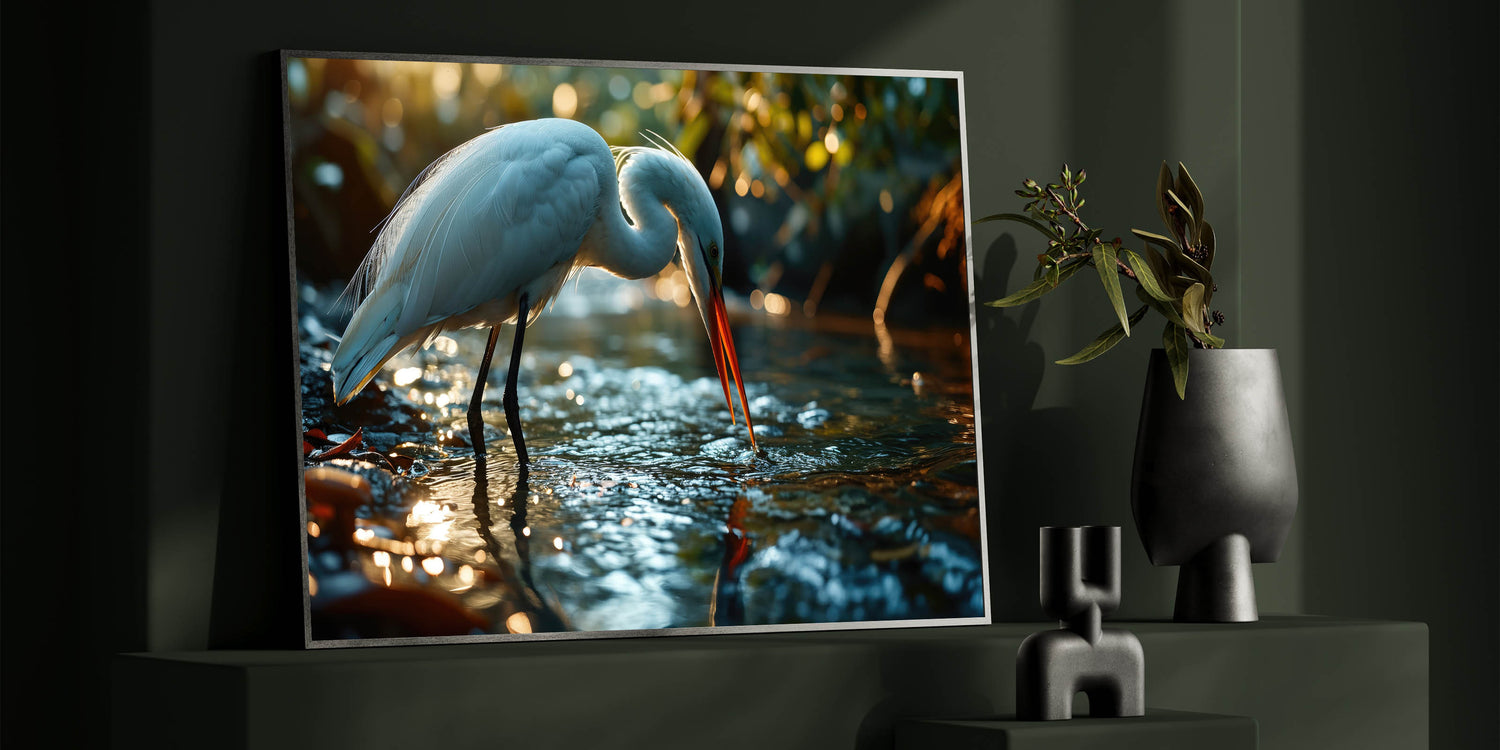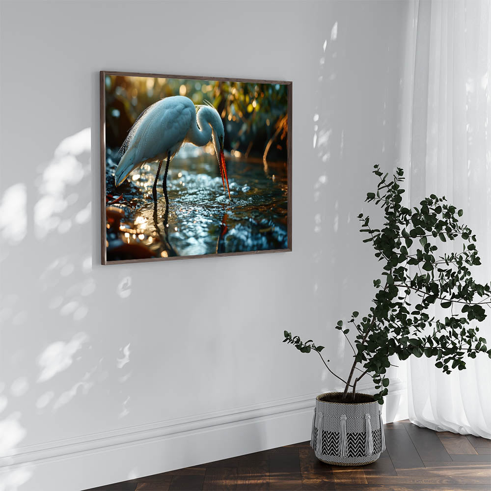 - Vibrant Sunset Tones: The artwork captures the rich oranges, deep blues, and warm golds of a sunset, enhancing the serene beauty of the egret and its surroundings.