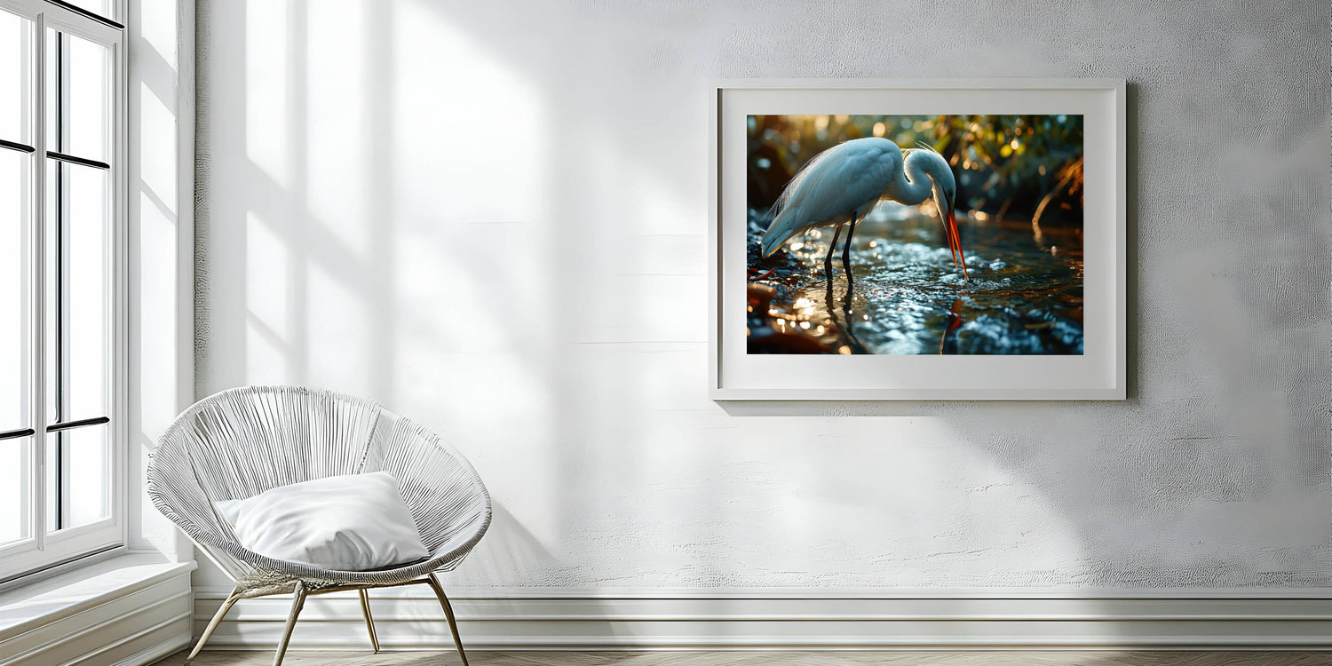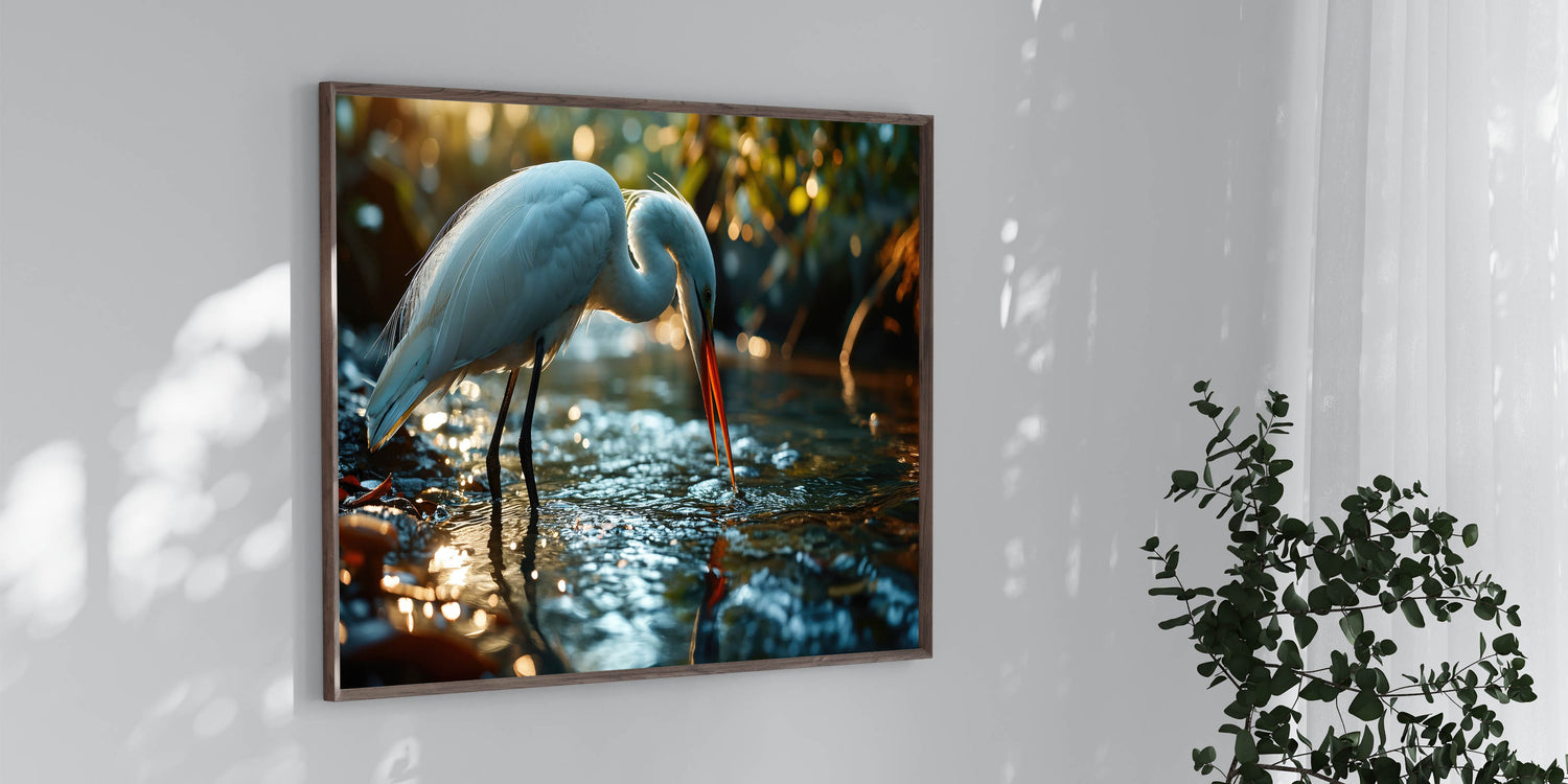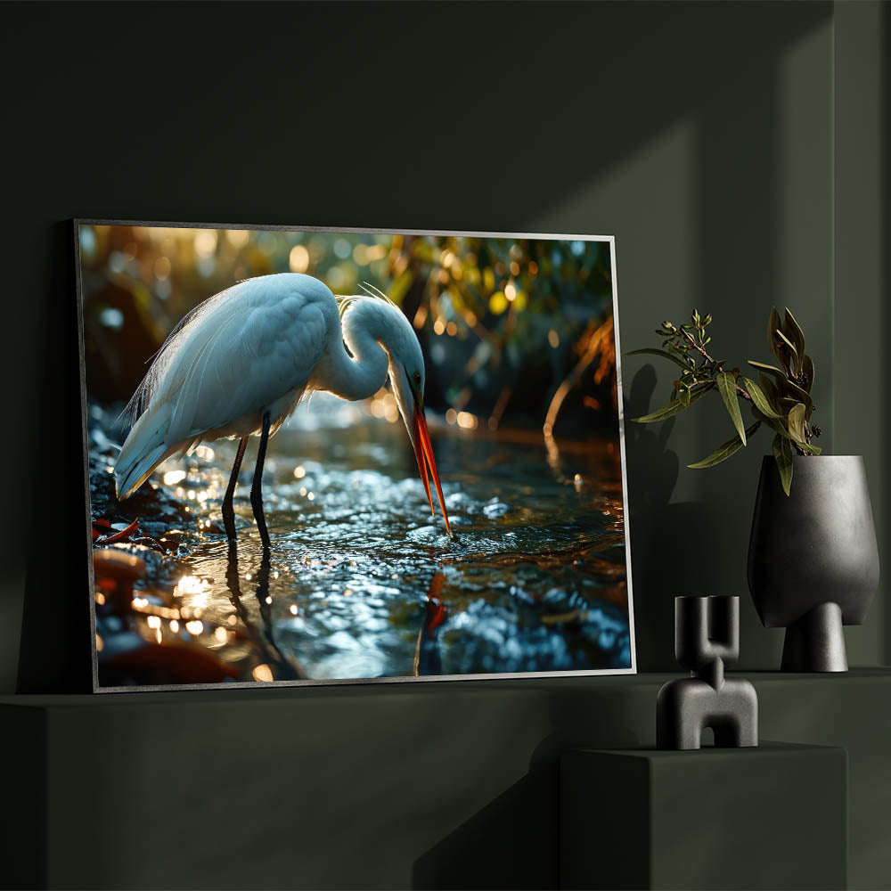 Bring the captivating beauty of nature into your home with this Elegant Egret at Sunset Water Canvas Art. This stunning piece features an egret delicately searching for food in the shallow waters, illuminated by the warm glow of a setting sun. The interplay of light and shadow, combined with the vibrant reflections on the water, creates a mesmerizing scene that will add warmth and elegance to any room.