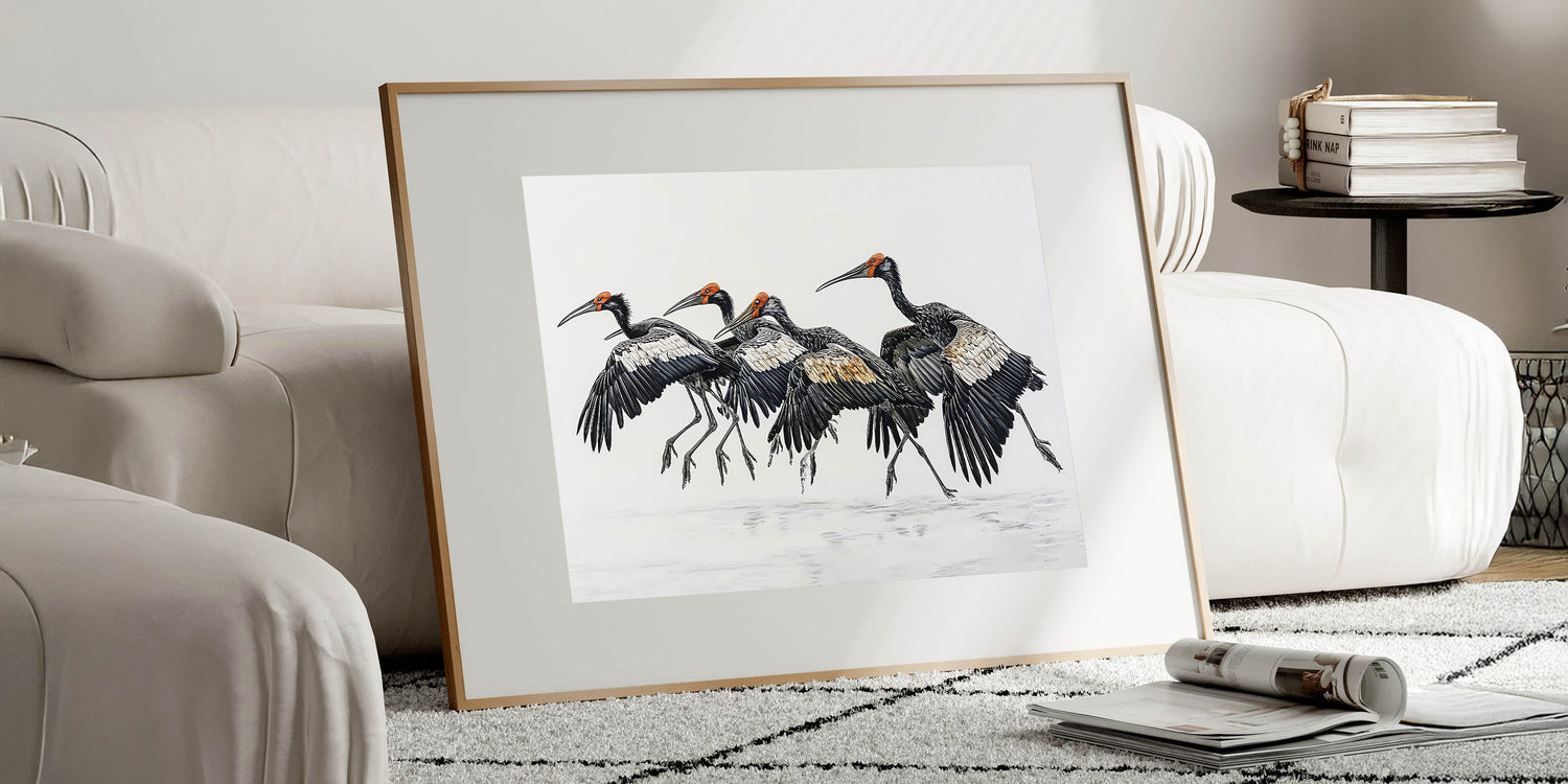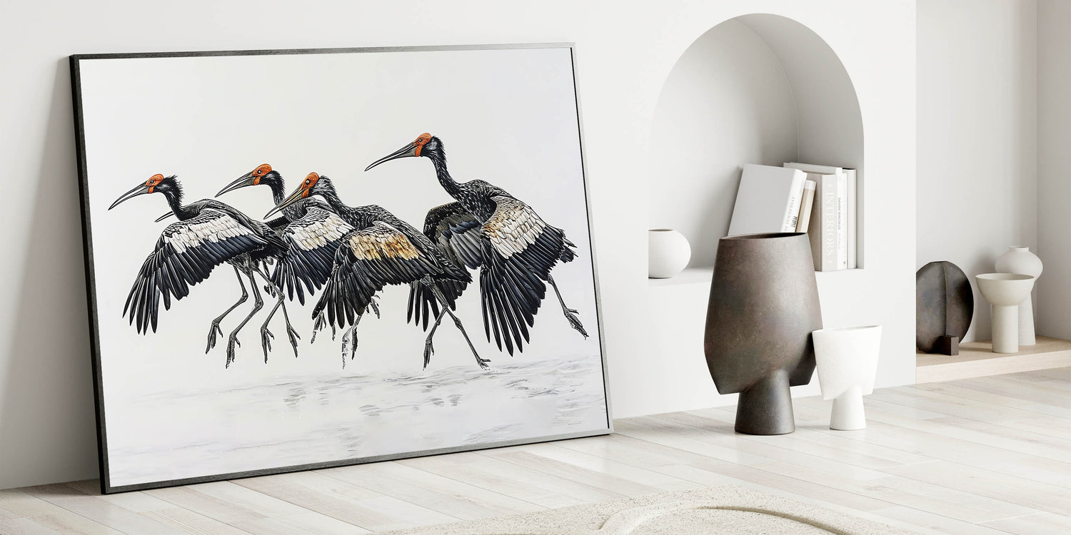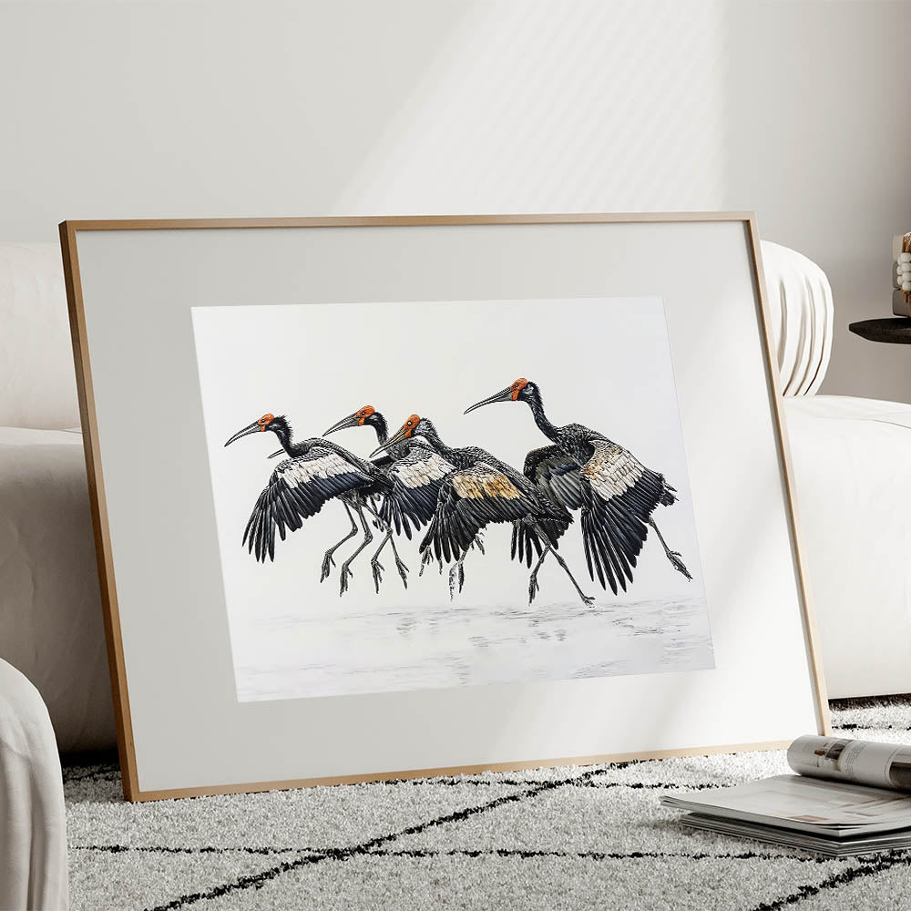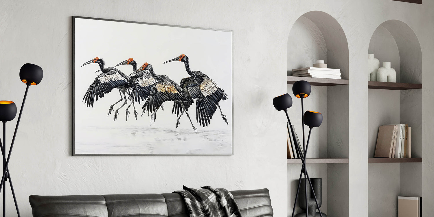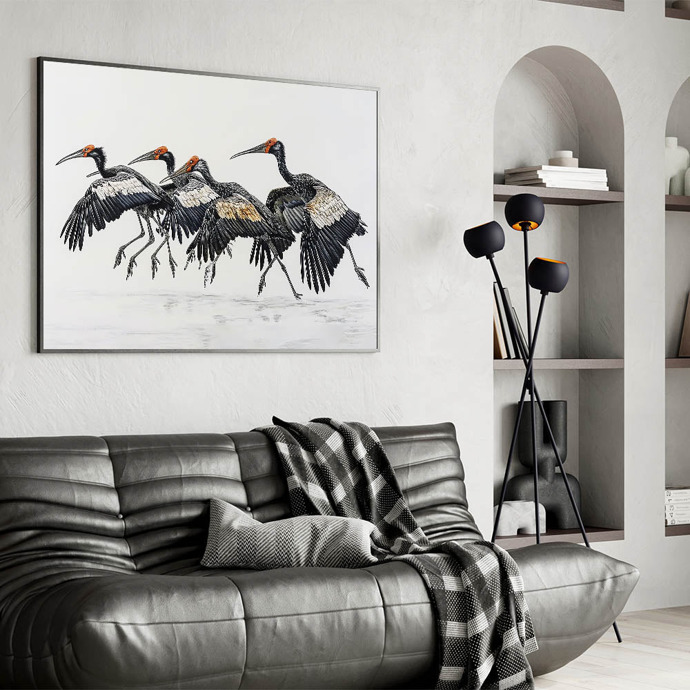 Introduce a touch of elegance and movement into your space with this Elegant Black-and-White Cranes Wall Art. This artwork features a stunning depiction of four cranes in mid-stride, their wings gracefully extended as they dance across the canvas. The monochromatic color scheme with subtle hints of orange and cream on their heads and wings adds a sophisticated and timeless appeal to any decor.