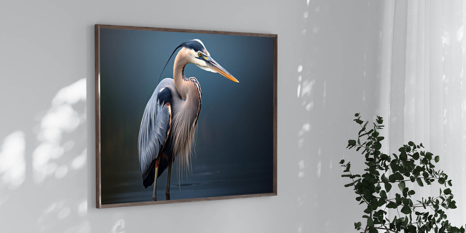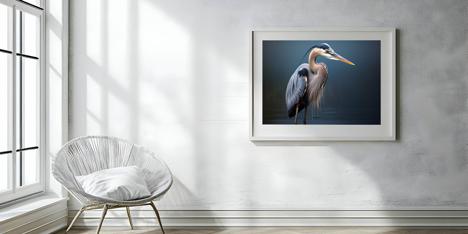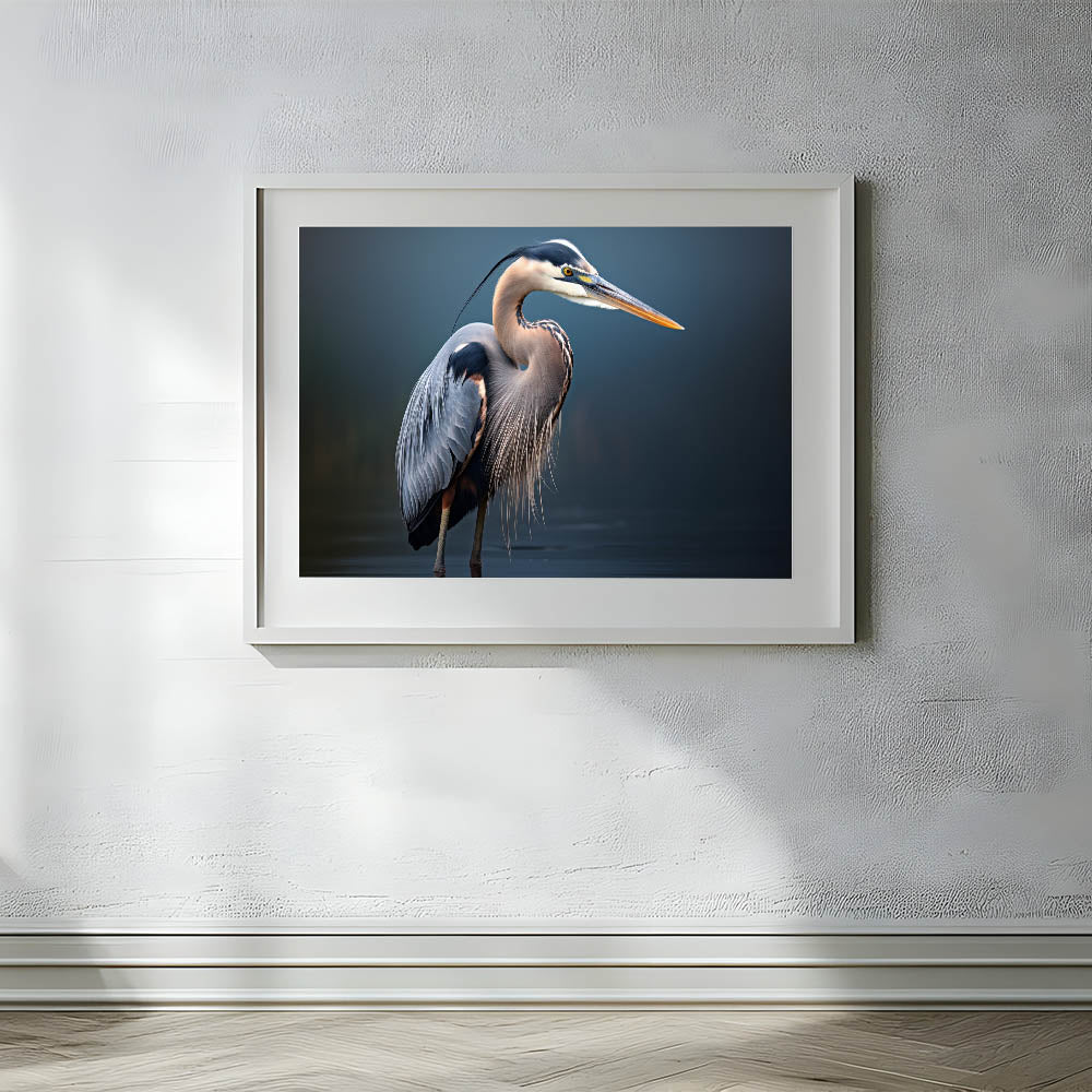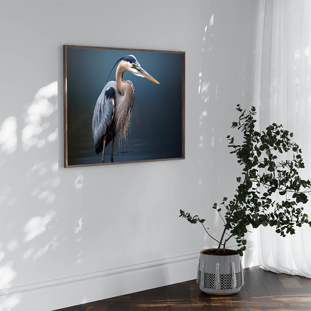 • Rich, Moody Colors: The artwork features a blend of deep blues, greys, and subtle earth tones, enhancing the heron’s graceful presence.