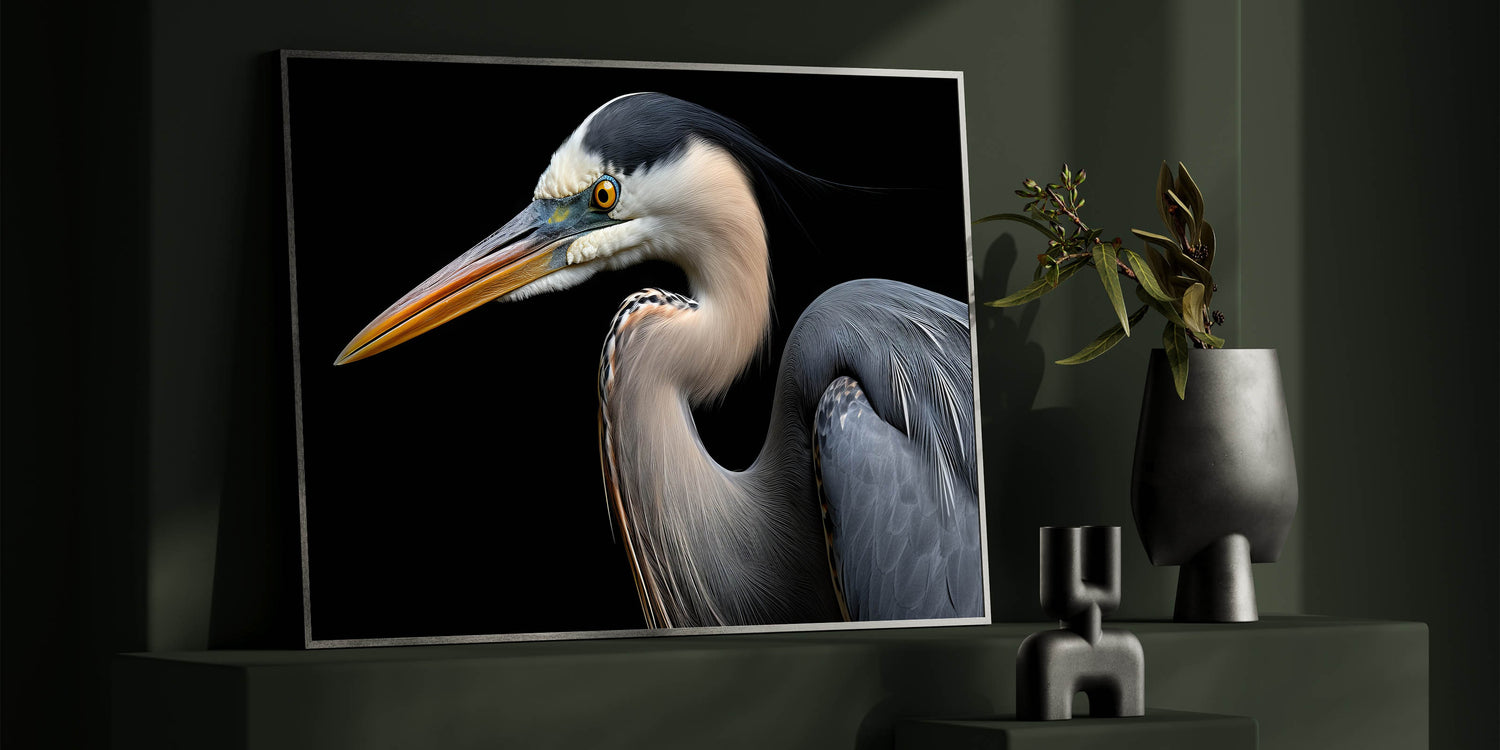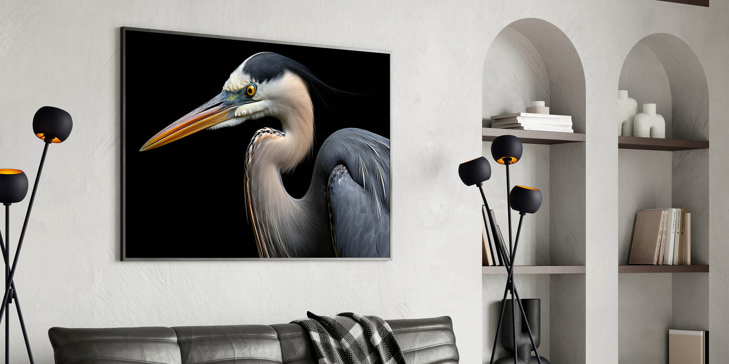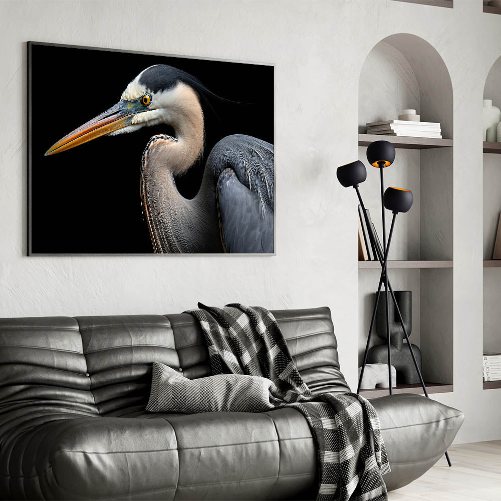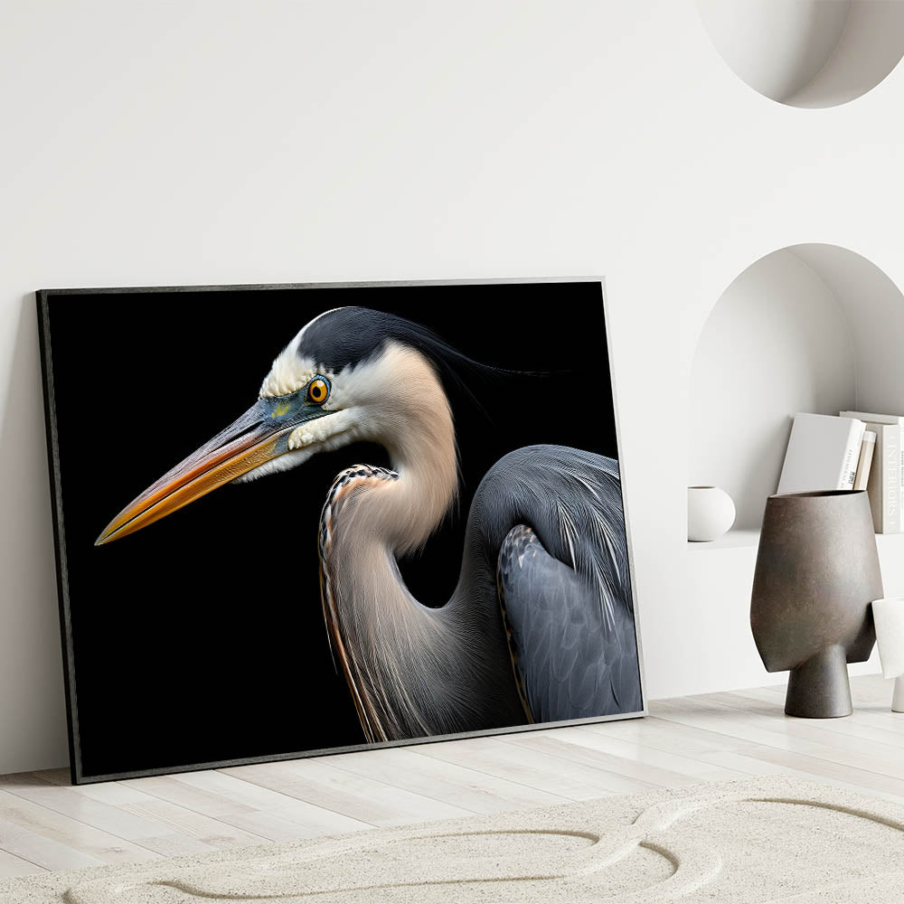 Transform your living space with this Striking Heron Portrait on Black Canvas Art. Whether displayed as a statement piece or part of a curated gallery wall, this artwork will draw attention and admiration. Shop now to bring this elegant and powerful heron art into your collection.