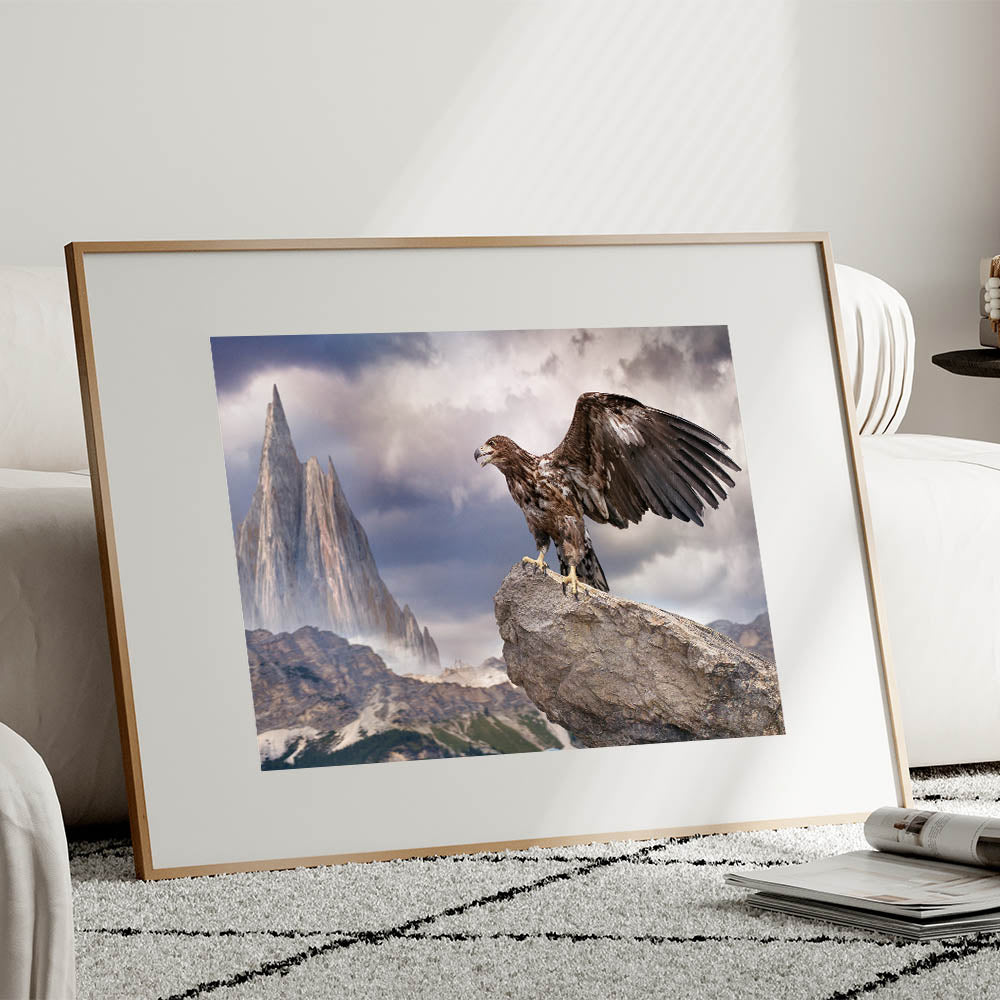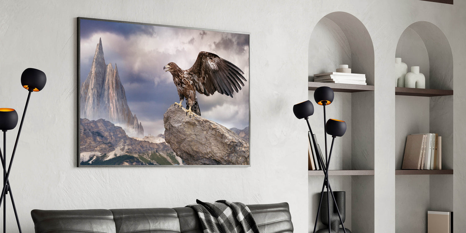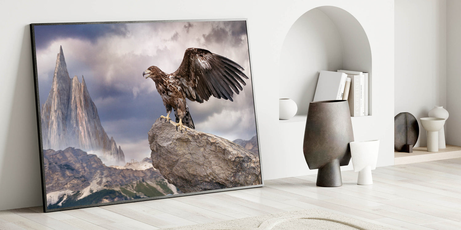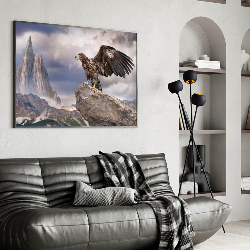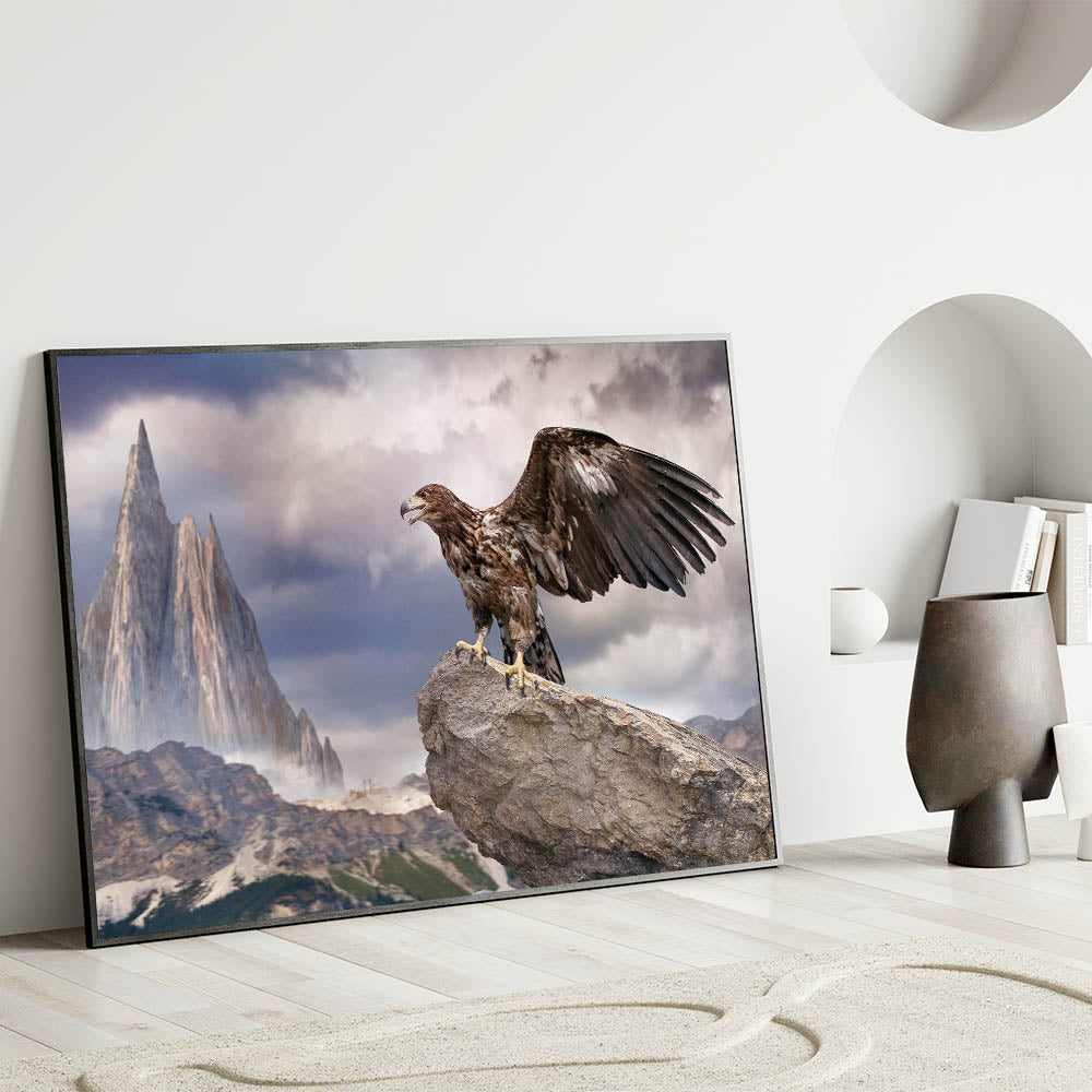 Bring the awe-inspiring majesty of the wild into your home with this Majestic Eagle Wall Art. This breathtaking piece features a powerful eagle perched on a rugged rock, set against a dramatic mountain landscape. The towering peaks and moody sky create a sense of grandeur, while the eagle’s poised stance and outstretched wings capture the essence of freedom and strength. This artwork is a stunning reminder of the raw beauty of nature, making it an impactful addition to any space.
