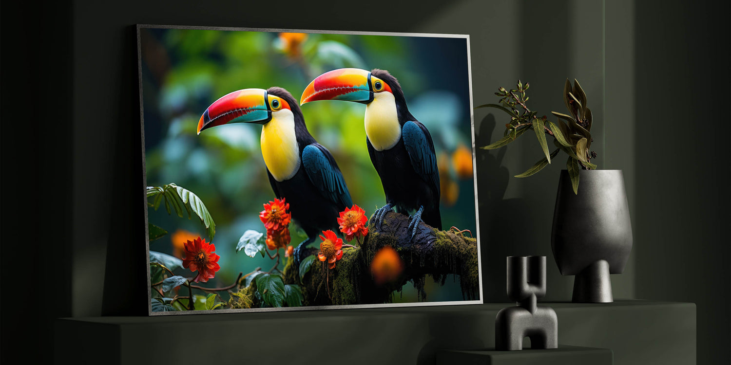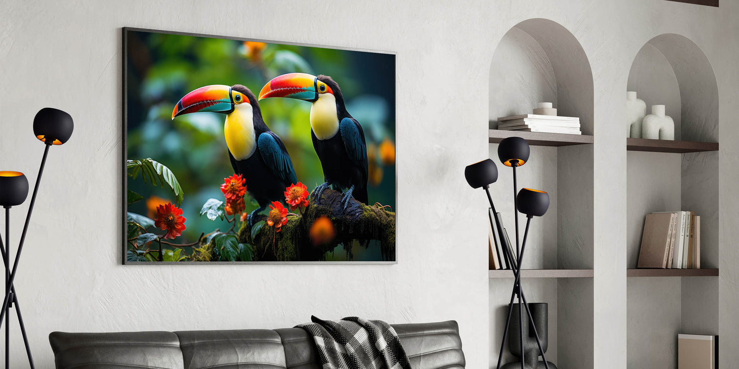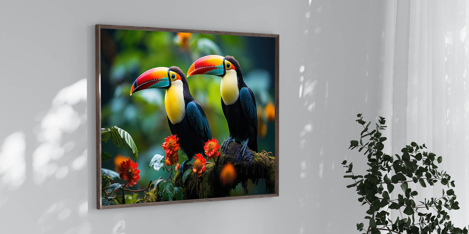 This piece of Tropical Birds artwork is more than just decor; it’s a celebration of the vibrant life of the rainforest. Available in various formats, this toucan art will transform any room into a lively and colorful paradise.