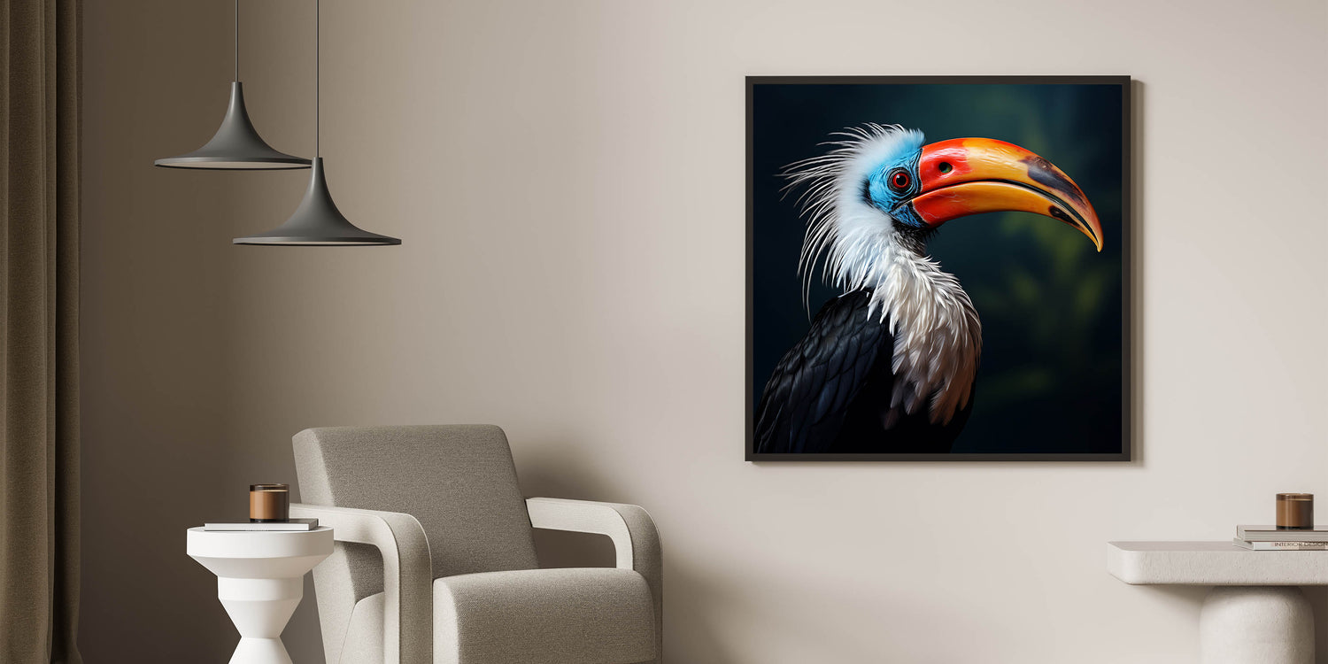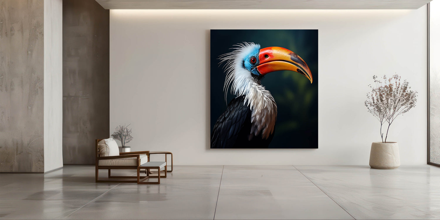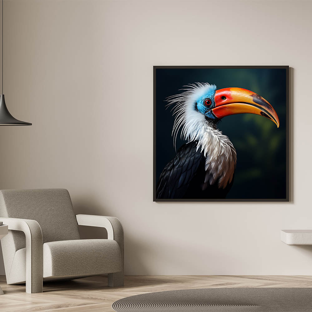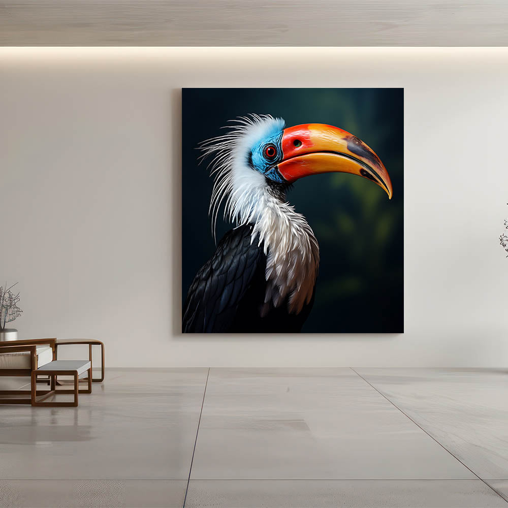 Add a bold statement piece to your home with this Unique Toucan Portrait Wall Art. This artwork captures the striking features of a toucan in stunning detail, showcasing its vibrant beak and striking feather details. The contrast between the bird's vivid colors and the dark, moody background makes this piece a captivating addition to any room, perfect for those who appreciate both the beauty of wildlife and modern art.