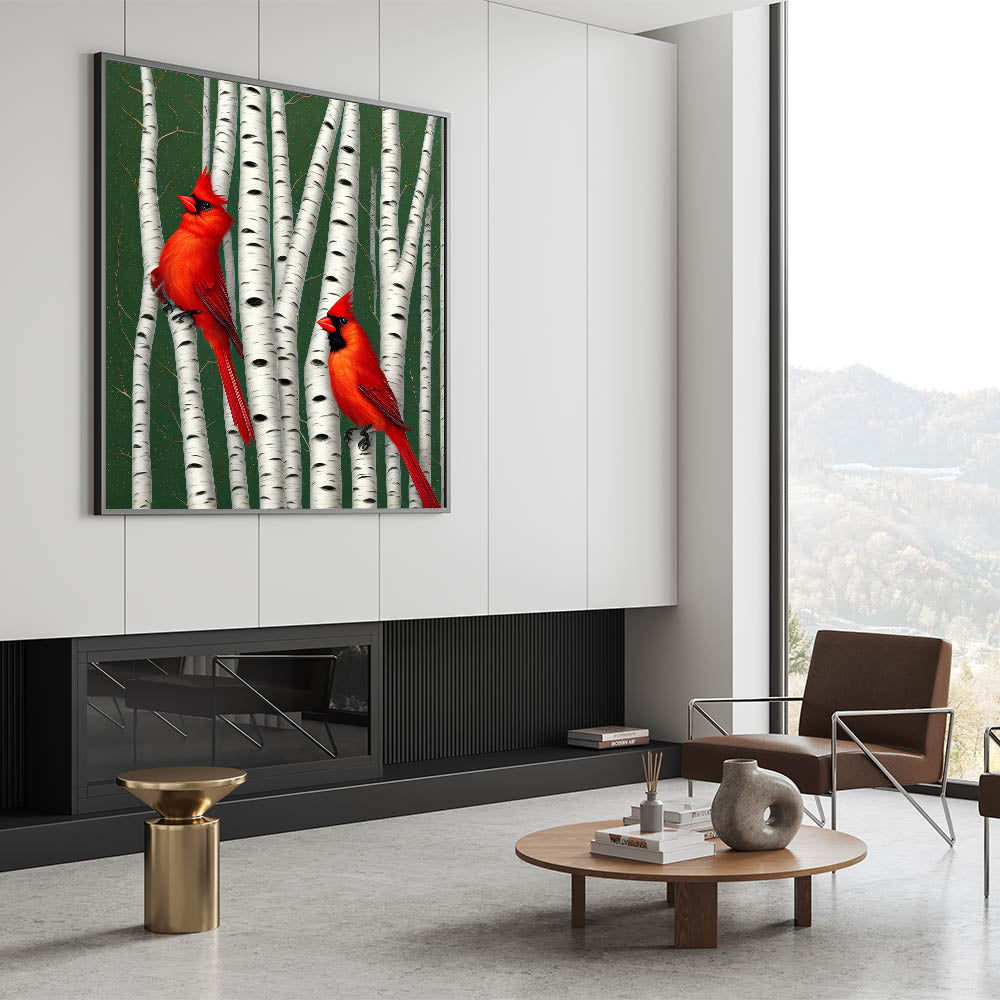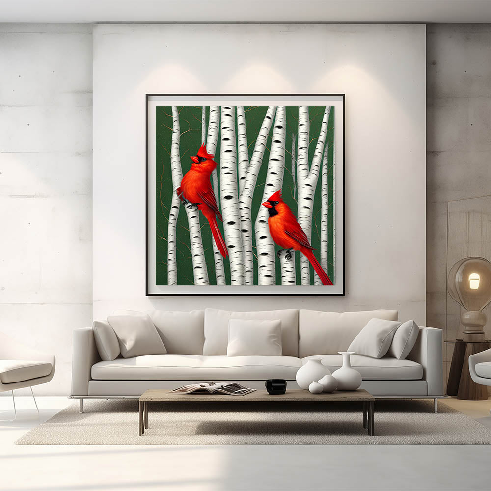 Enhance your space with this stunning Vibrant Cardinal Wall Art featuring two majestic cardinals perched gracefully among birch trees. The vivid red feathers of the cardinals contrast beautifully with the white bark, bringing the elegance of nature right into your home. This piece captures the serene yet striking beauty of these beloved birds in their natural habitat.