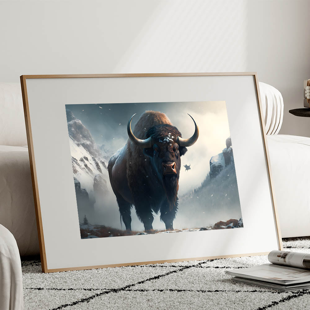 - Majestic Winter Landscape: A high-resolution depiction of a bison in a snowy mountain setting, evoking a sense of tranquility and power.