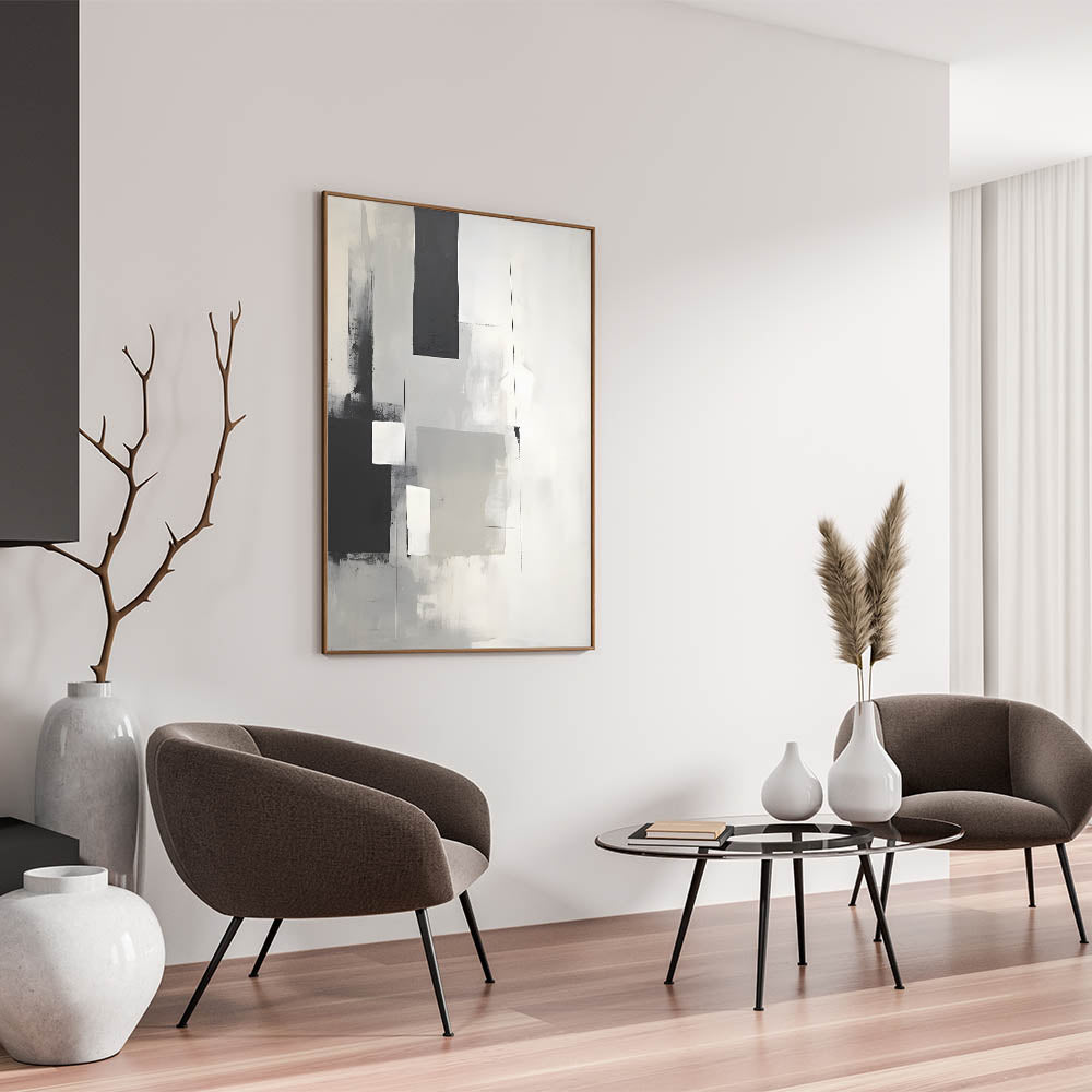 Elevate your space with this abstract black and gray canvas art, showcasing a balanced blend of monochromatic shades in a minimalist composition. The piece features blocks of black, gray, and white with subtle textures and linear details, creating a modern aesthetic that’s perfect for contemporary and industrial interiors. This artwork’s neutral tones and structured forms add sophistication without overwhelming the decor, making it a versatile choice for any room.