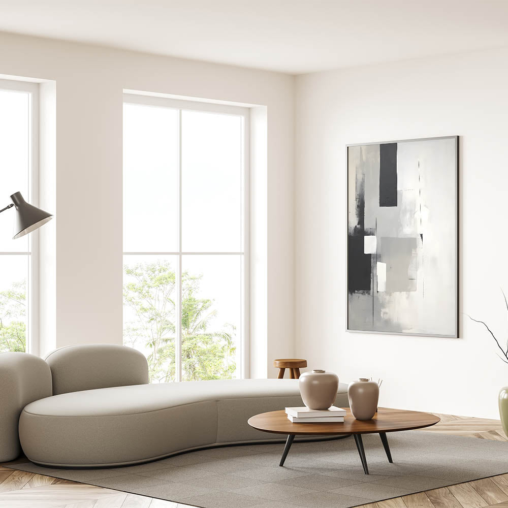 - Sophisticated Monochrome Design: Features a harmonious blend of black, gray, and white blocks.