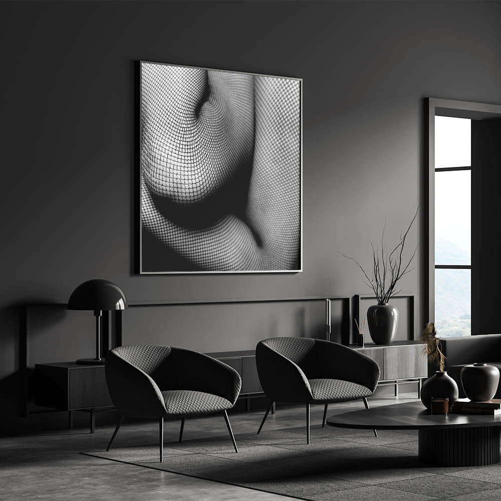 This striking black and white fine art photograph captures the abstract beauty of the human form wrapped in fishnet stockings. The high-contrast monochrome tones emphasize the interplay of curves and geometric lines, creating a mesmerizing and sophisticated visual experience.
