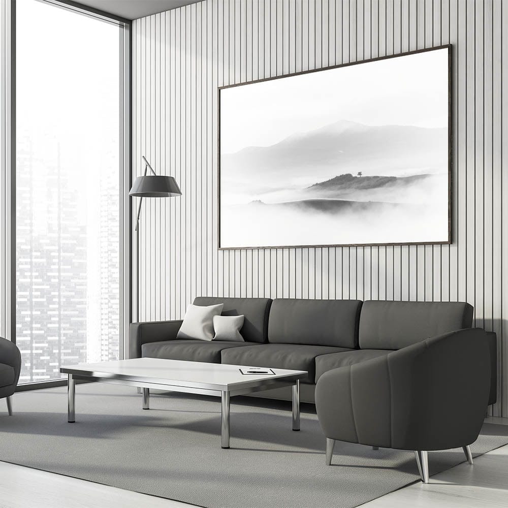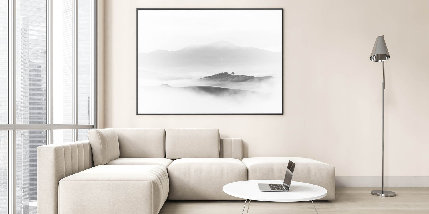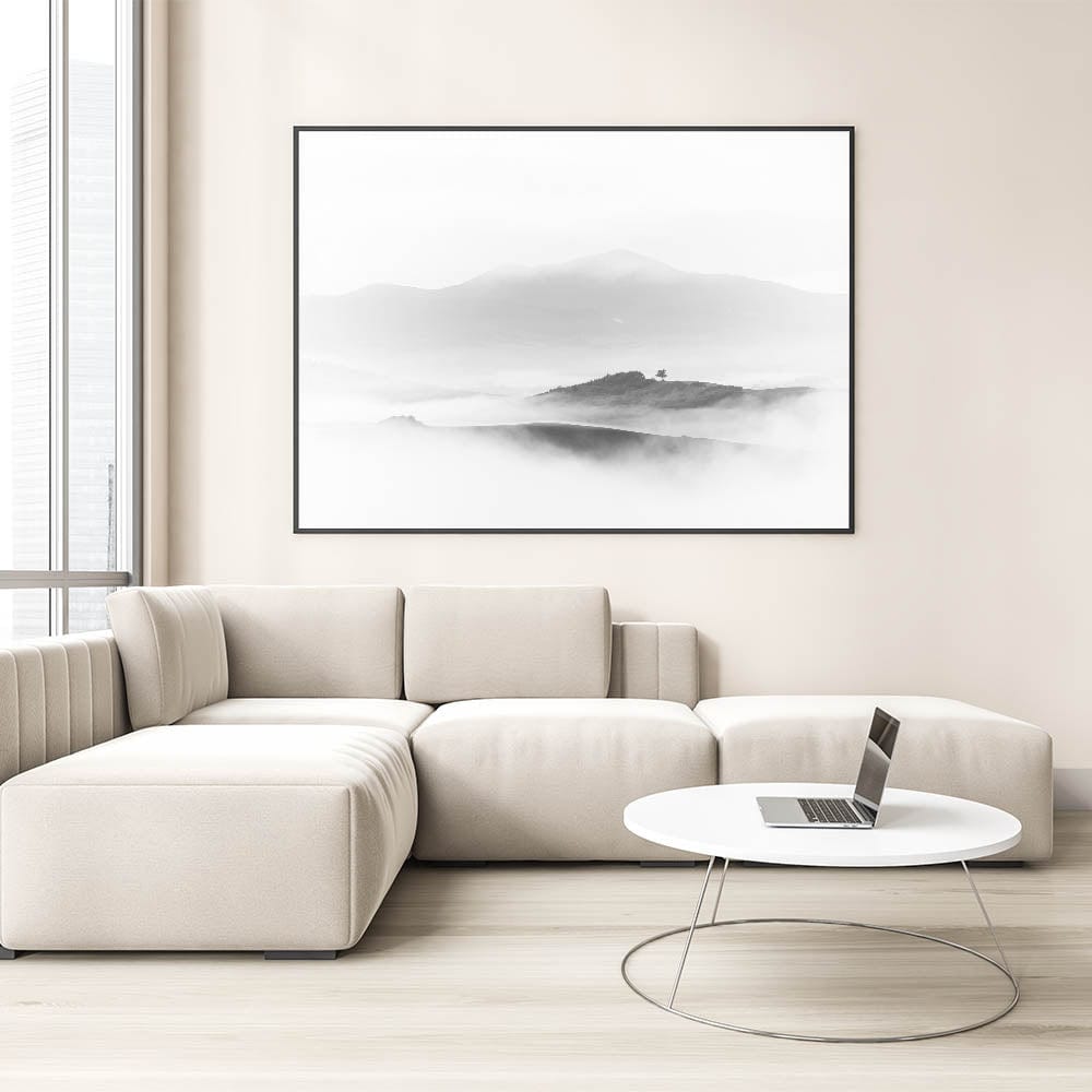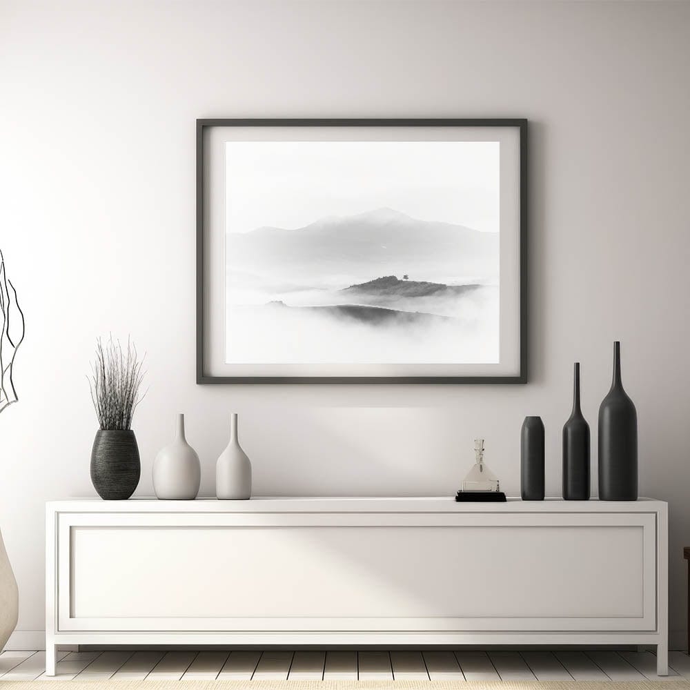 Immerse your space in the serene beauty of this abstract canvas wall art, a minimalist and captivating depiction of a misty landscape in black and white. This modern abstract painting features soft rolling hills enveloped in delicate fog, creating a dreamy and sophisticated ambiance. Perfect for those who appreciate moody modern wall art, this piece offers a timeless aesthetic that complements contemporary, Scandinavian, and industrial interiors.