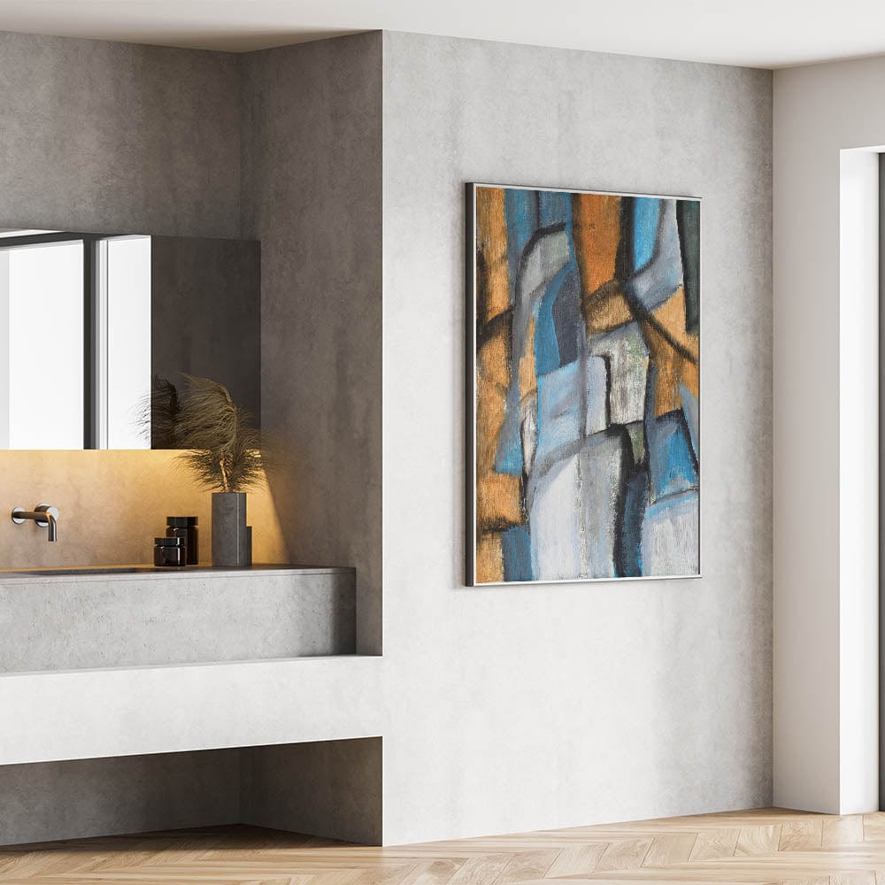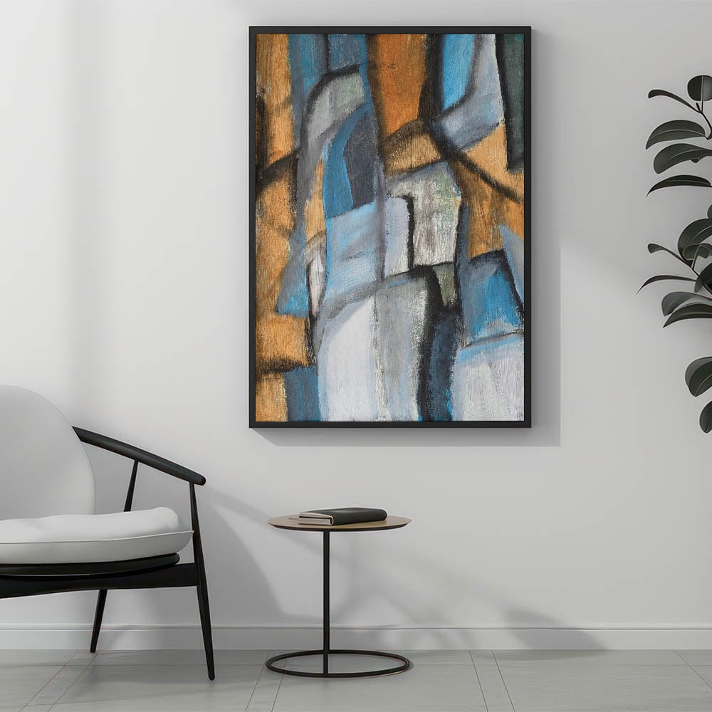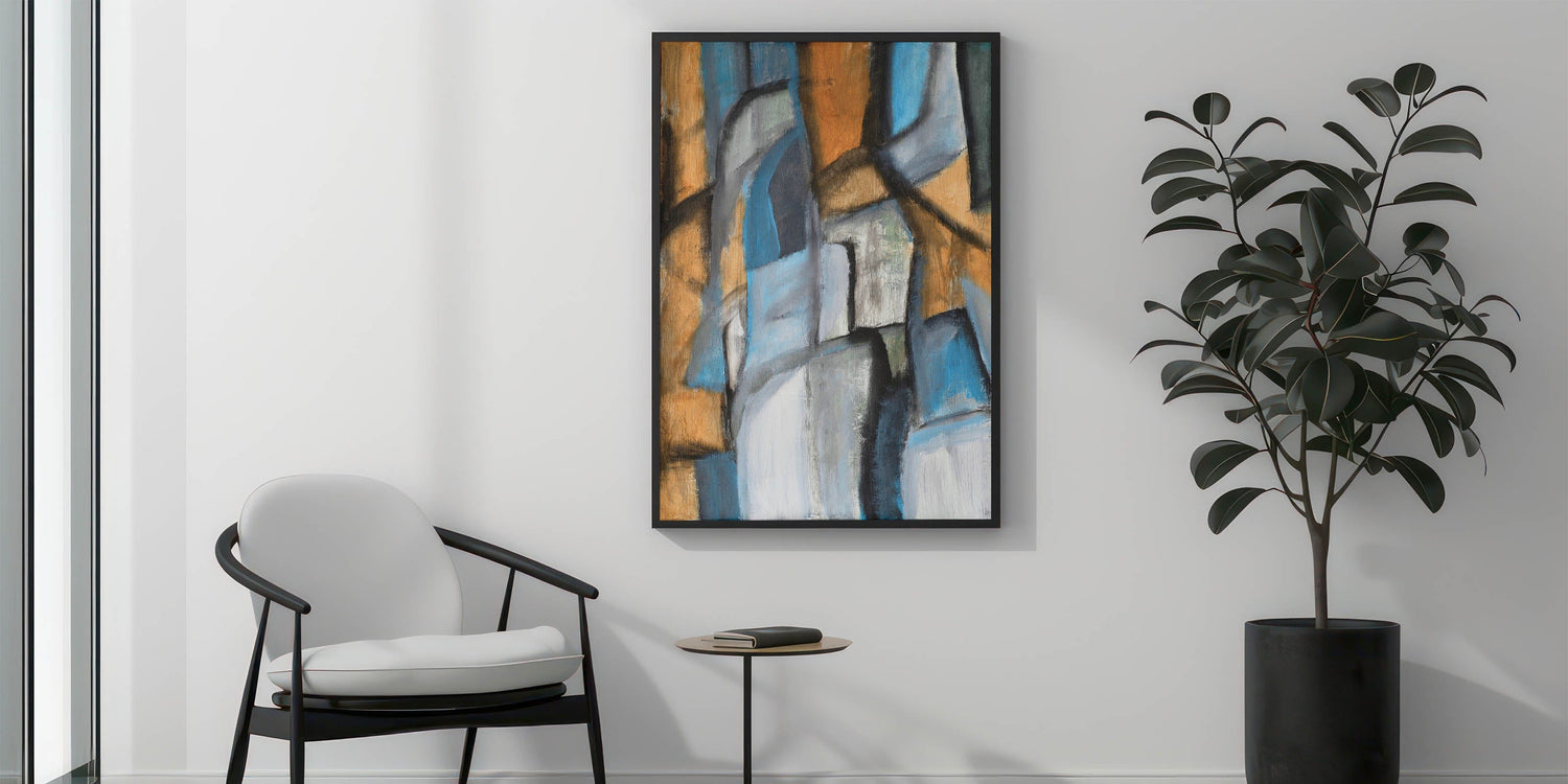 This contemporary abstract art blends structured shapes with expressive movement, creating a refined yet artistic focal point. Whether printed on stretched canvas, framed print, or acrylic glass, this piece complements any modern setting. Elevate your space with this moody and sophisticated artwork today.