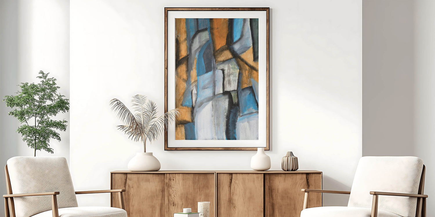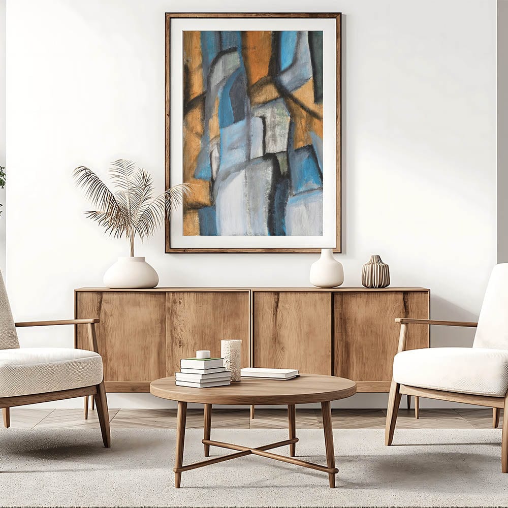 • Unique modern art print featuring blue, gray, and warm neutral hues