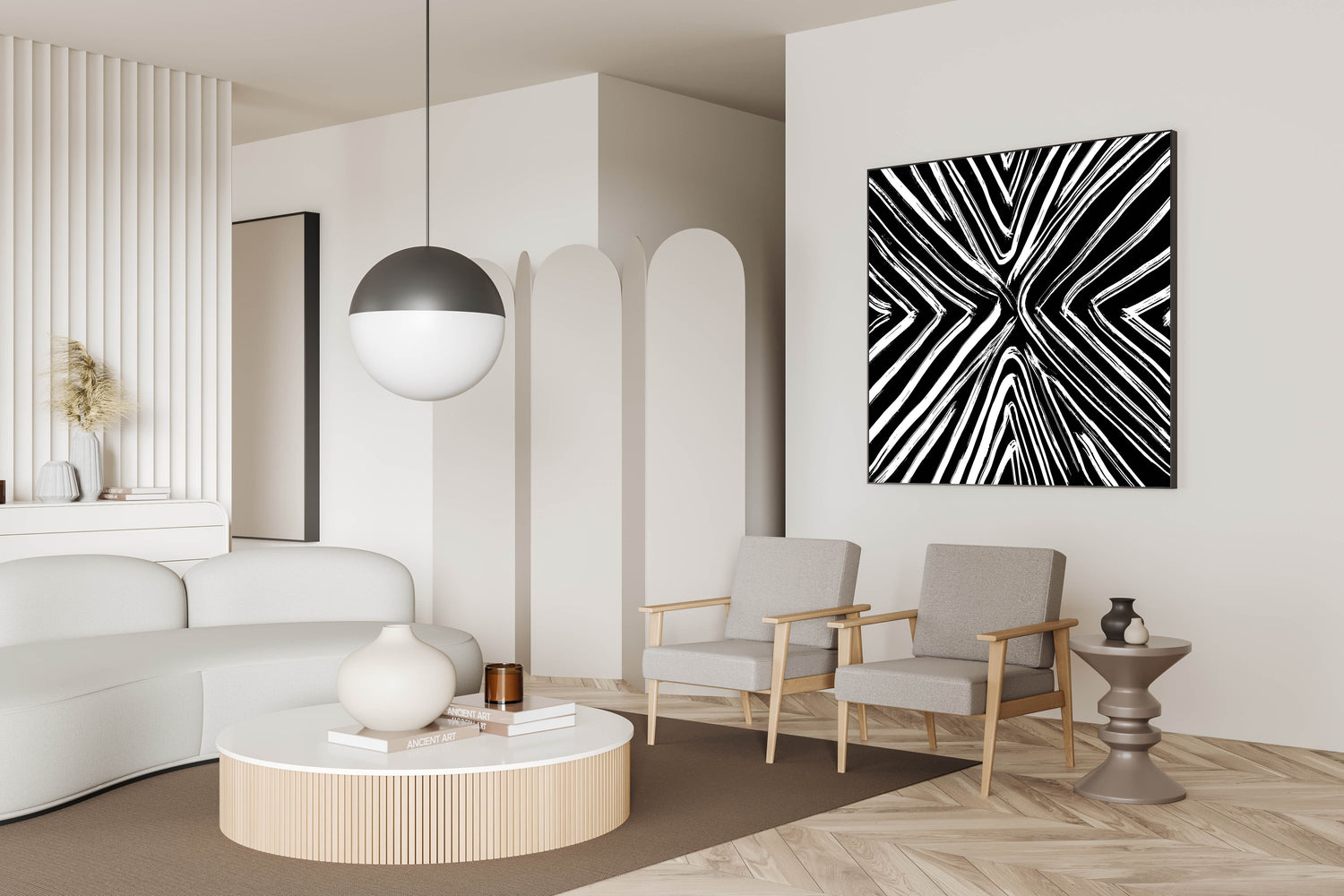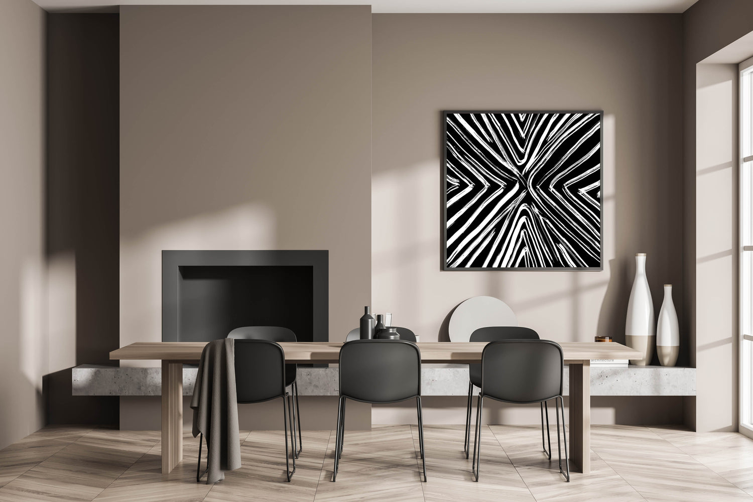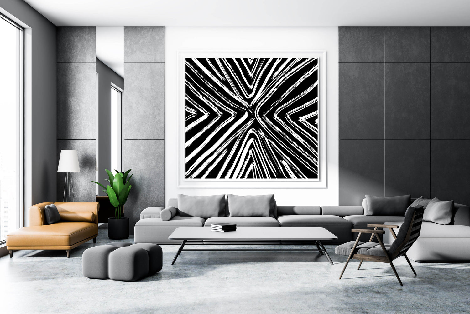 Make a bold statement with this stunning black and white line art piece, featuring dynamic geometric brush strokes. The intricate, flowing lines create a captivating, abstract pattern that exudes energy and sophistication. Perfect for modern, minimalist spaces, this artwork adds a touch of elegance while making a strong visual impact.