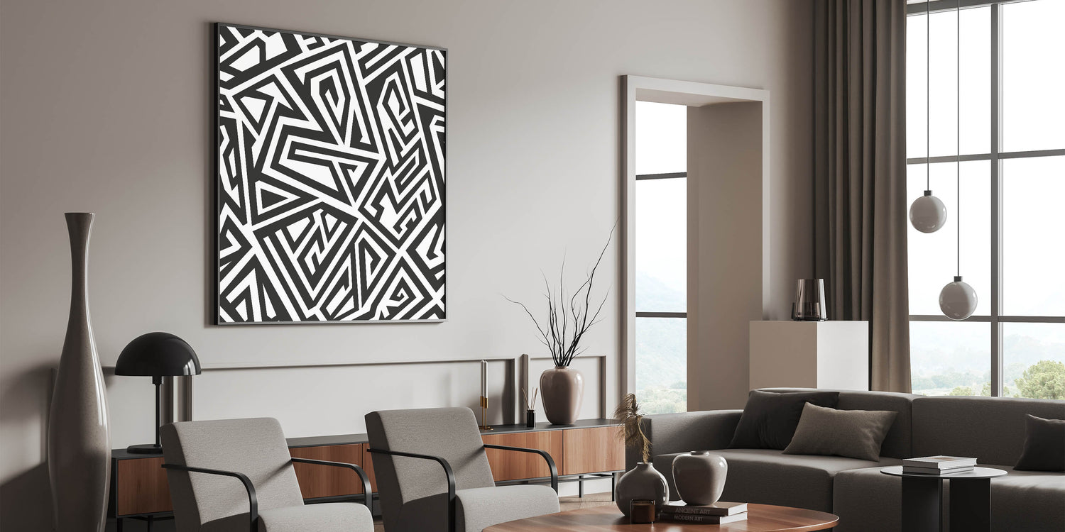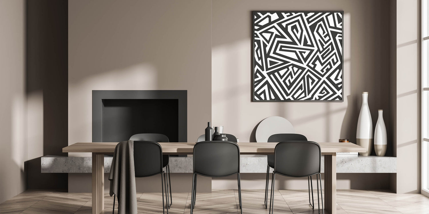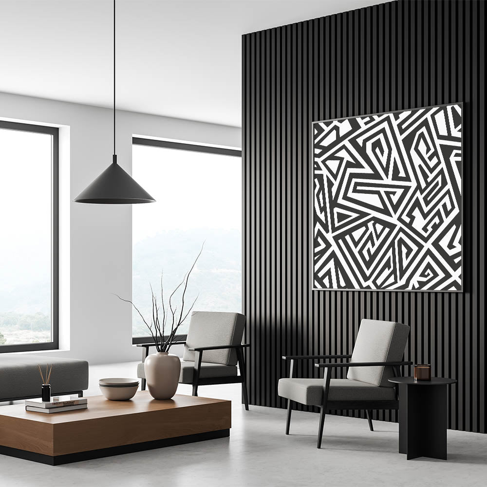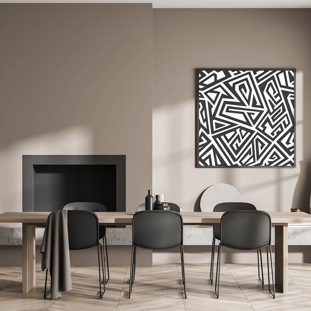 This stunning black and white art piece is more than just a decoration; it's a statement of boldness and modernity. Its unique geometric pattern and artistic monochrome design make it a versatile addition to any decor. Whether you choose a framed canvas or an acrylic glass option, this piece promises to elevate your space with its dynamic and contemporary appeal.