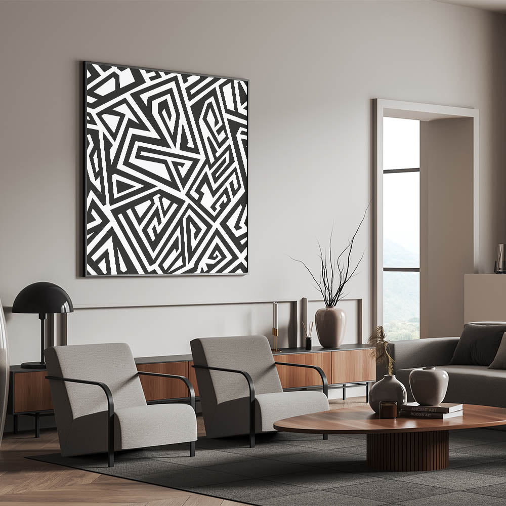 Elevate your decor with this bold black and white abstract art piece. Featuring striking geometric patterns, this monochrome design brings a modern and energetic touch to any room.