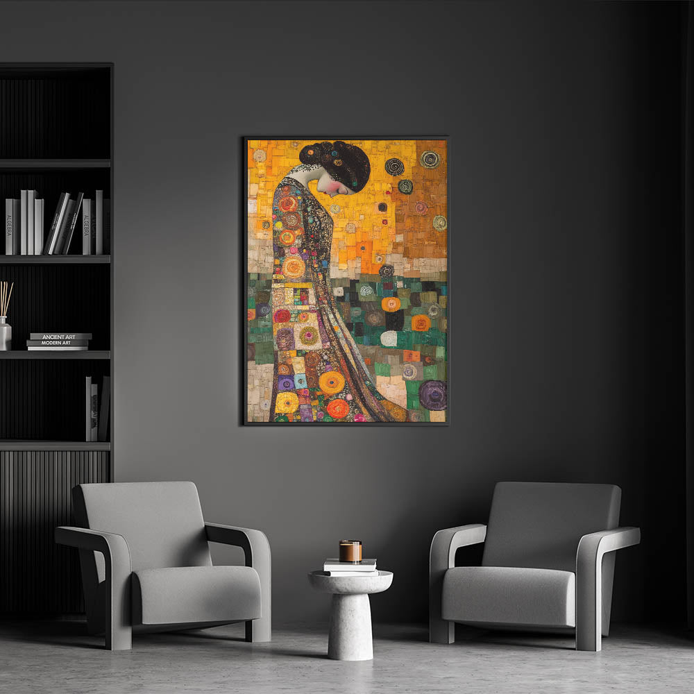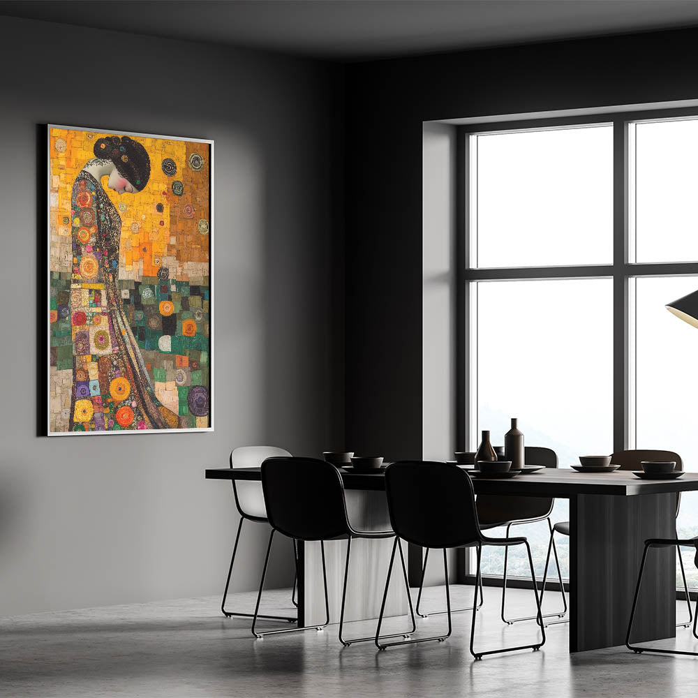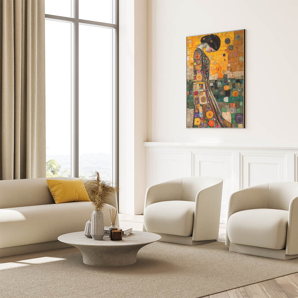 Immerse yourself in the beauty of colorful abstract figurative paintings with this captivating artwork. The gracefully posed female figure, draped in a richly patterned gown, stands against a textured background of warm golds, deep greens, and vibrant oranges. This modern abstract figure painting evokes elegance and mystery, making it a perfect statement piece for contemporary interiors.