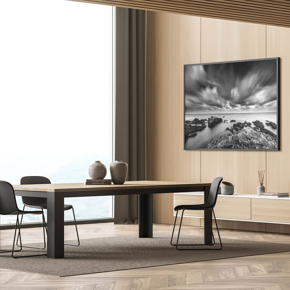 Capture the raw power of nature with this striking black-and-white fine art photograph. Featuring a dramatic stormy sky over rugged coastal rocks, this long-exposure shot transforms the ocean into a misty dreamscape. The interplay of light, shadow, and texture evokes a sense of mystery, solitude, and awe-inspiring beauty.