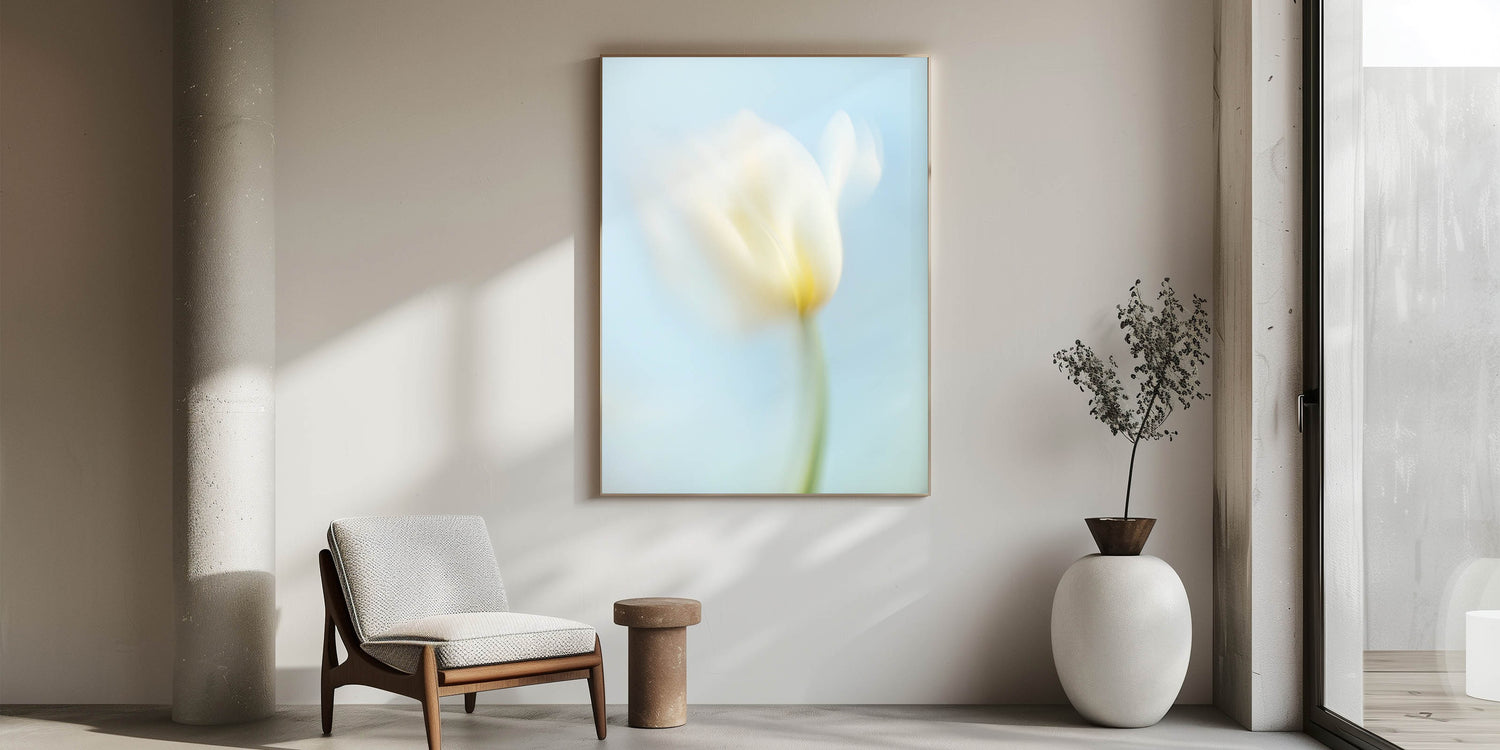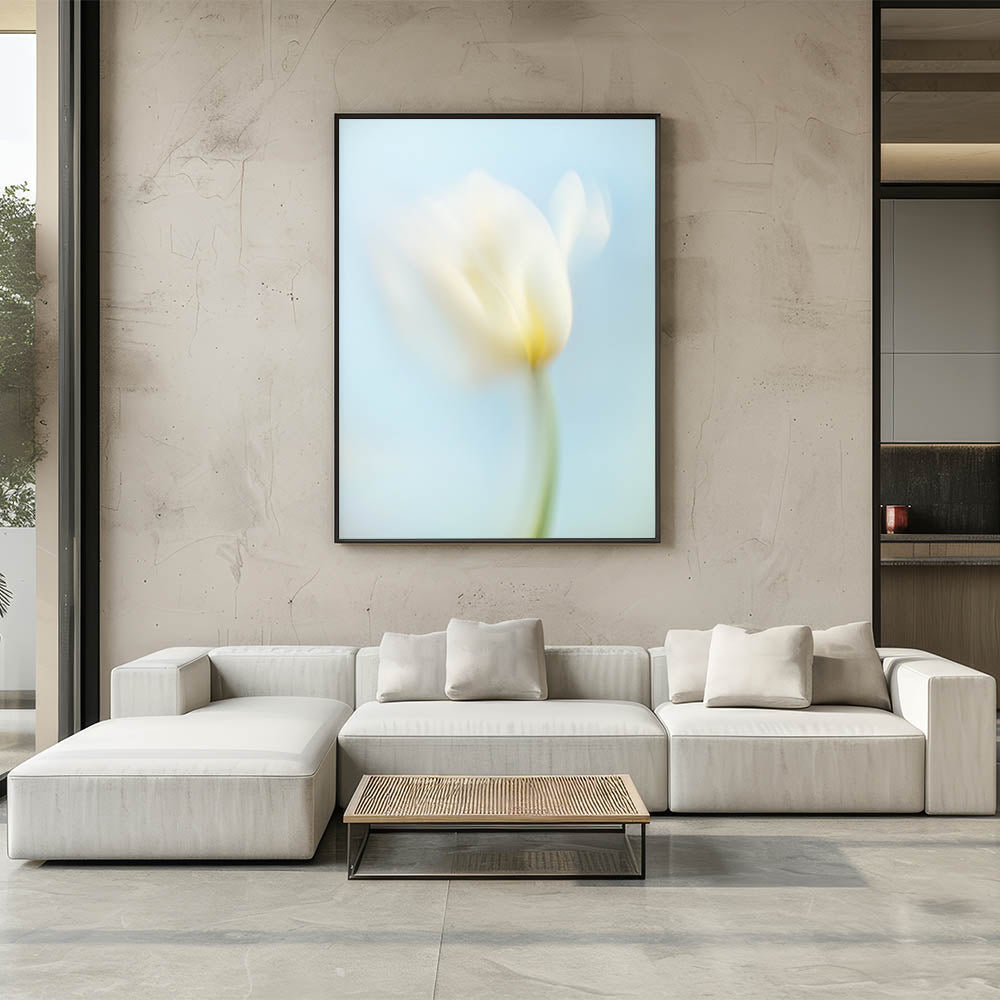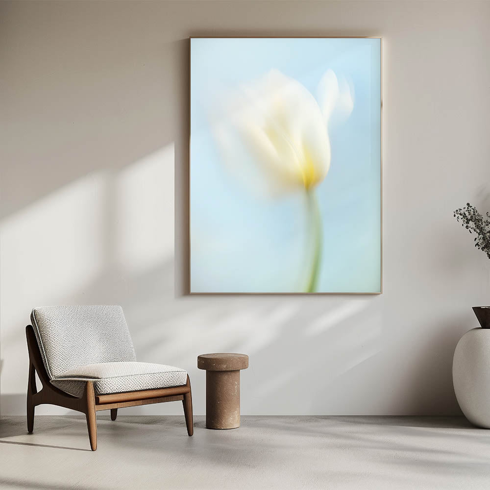 Experience the delicate beauty of nature with this stunning fine art photography print. Featuring a softly blurred tulip against a pastel sky, this ethereal composition captures the fleeting elegance of spring. The dreamy motion effect creates a sense of tranquility, making it a perfect addition to any space.
