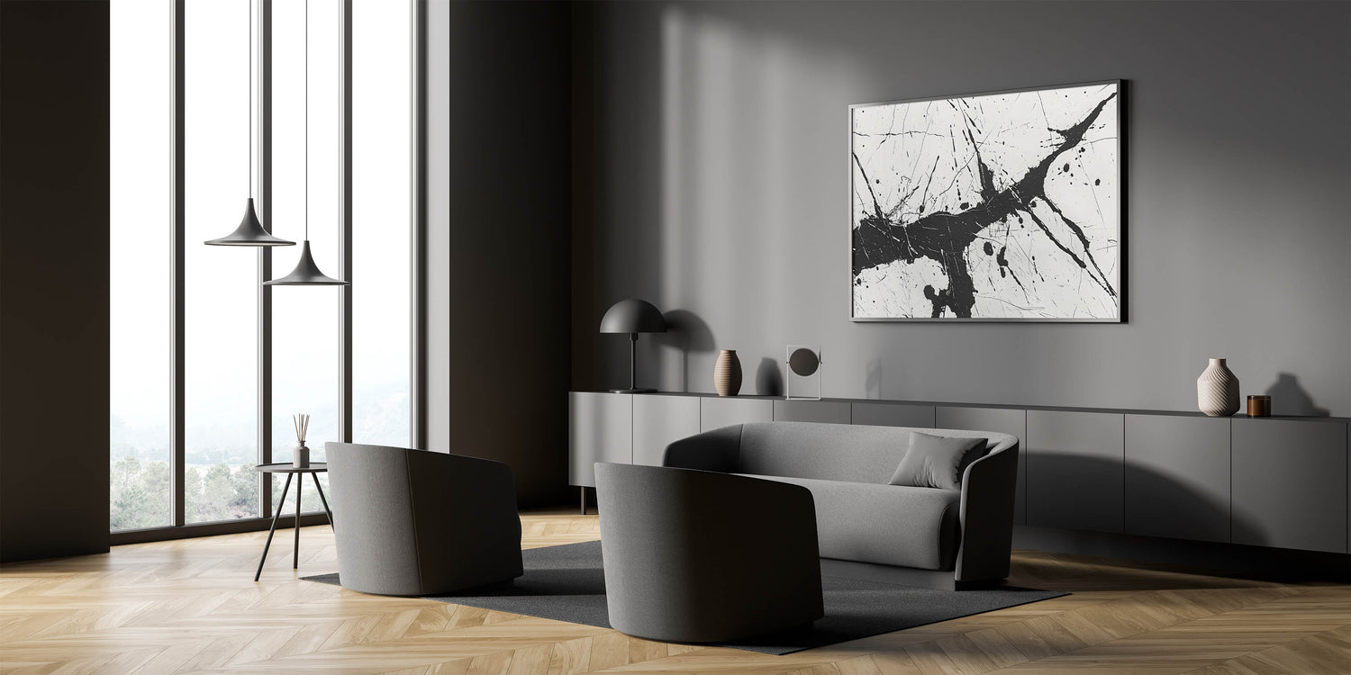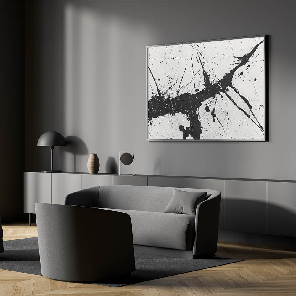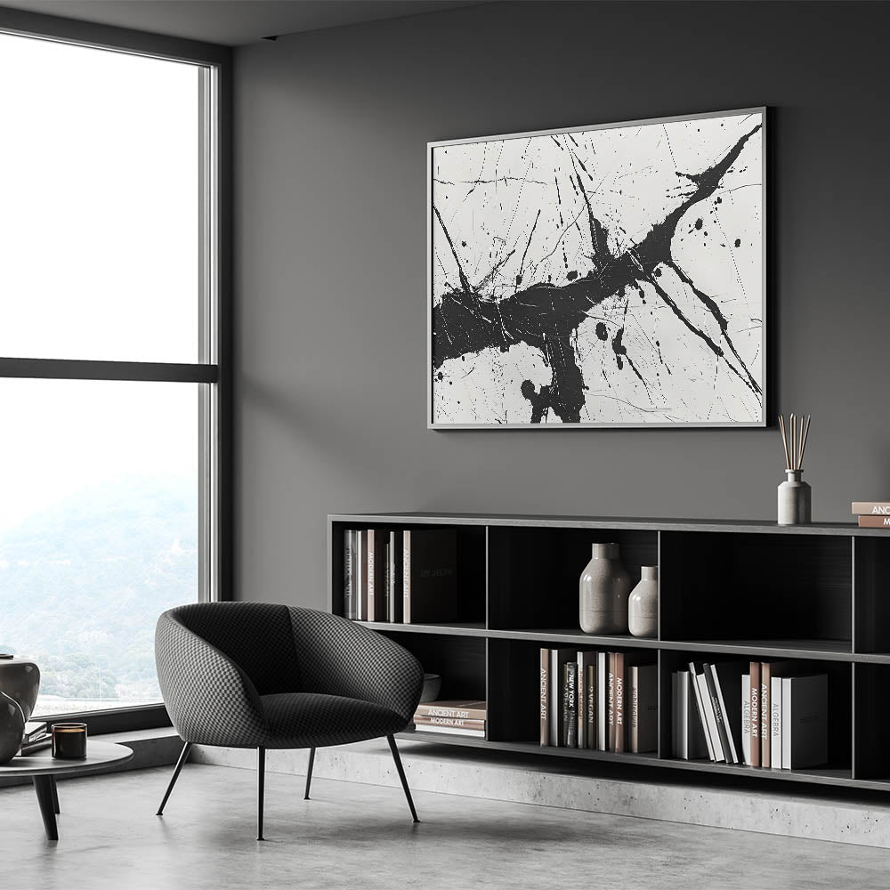 Add a burst of energy to your space with this dynamic black and white abstract art piece. Featuring bold splatter patterns, this monochrome design brings a lively and contemporary touch to any room.
