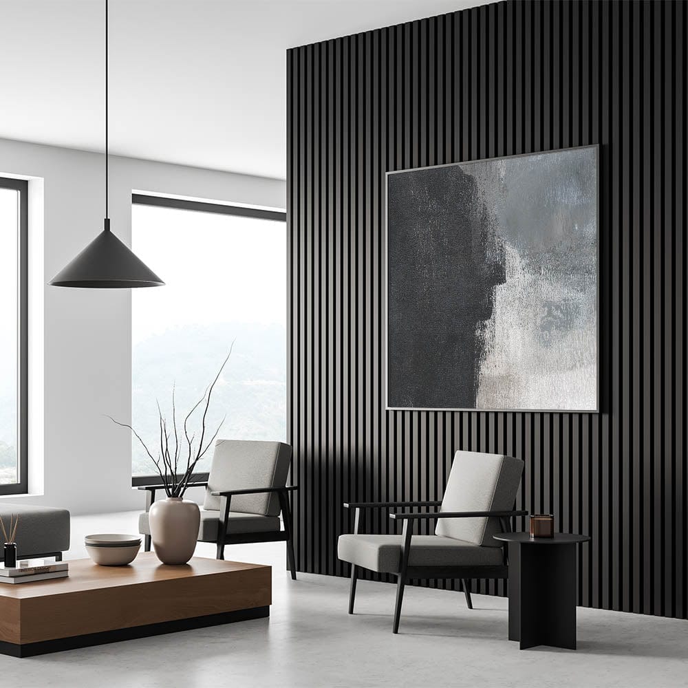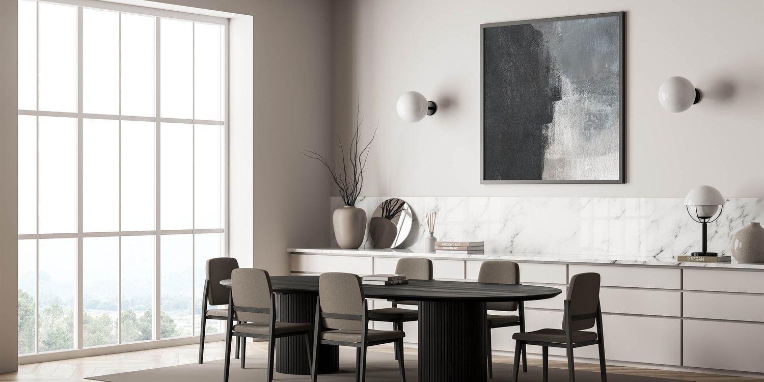 • Bold contrasts of black, gray, and white create a striking neutral color palette