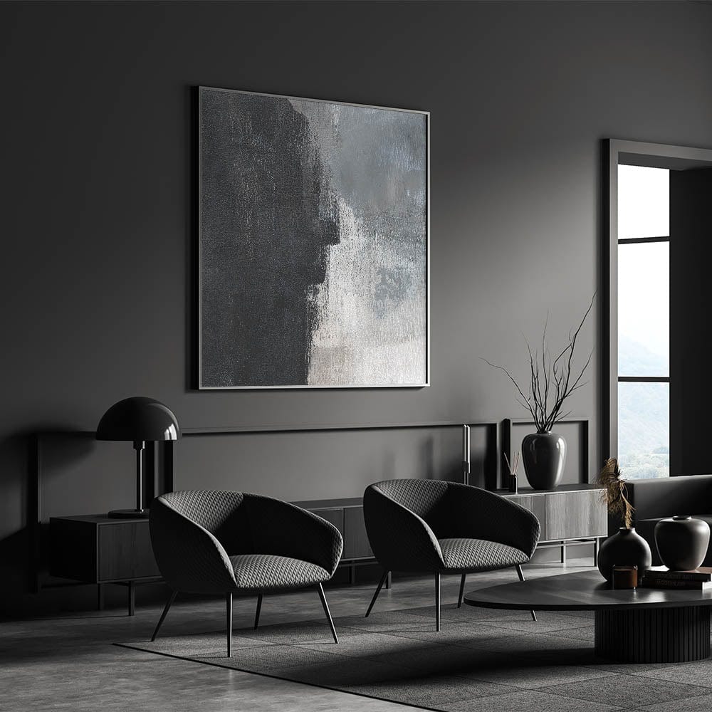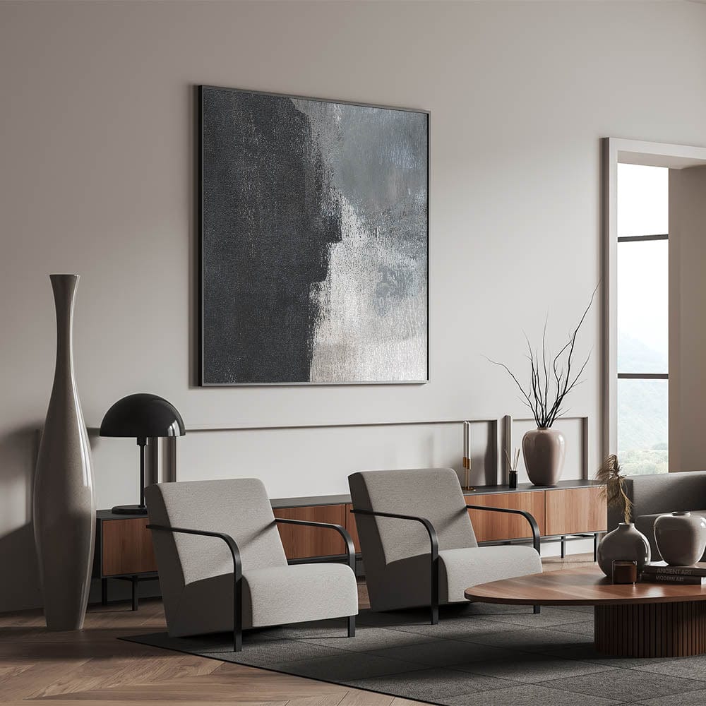 This thought-provoking piece from our Abstracts in Earthen Harmony collection explores the human form through abstract lines and contrasting shades of black, gray, and white. The subtle silhouette of a face is formed through blurred brushstrokes, offering a modern, minimalist design that adds depth and emotion to any space.