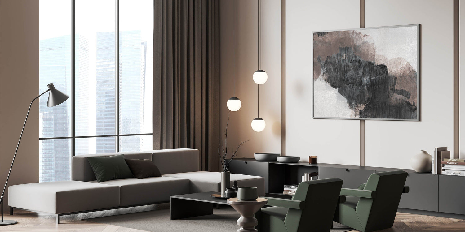 • Rich tones of black, gray, and beige create a balanced and sophisticated color palette