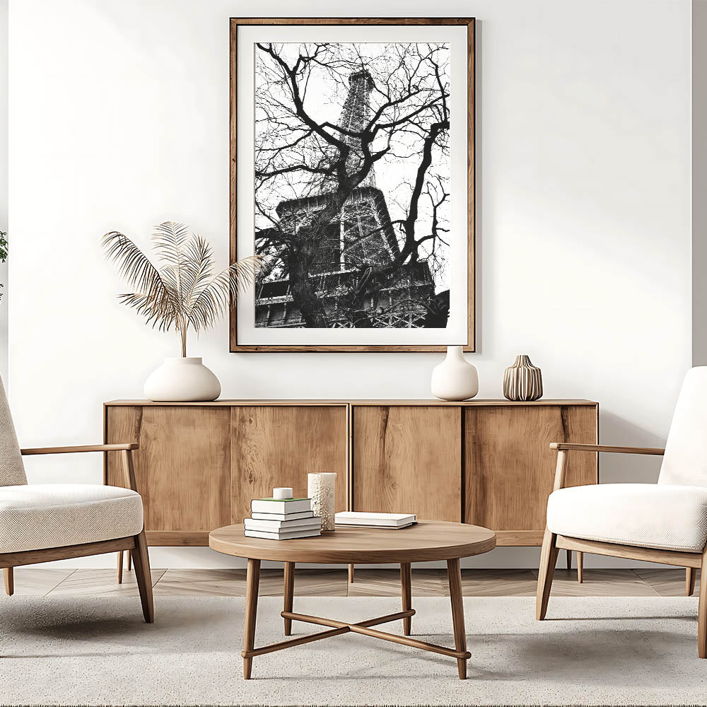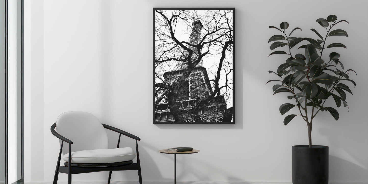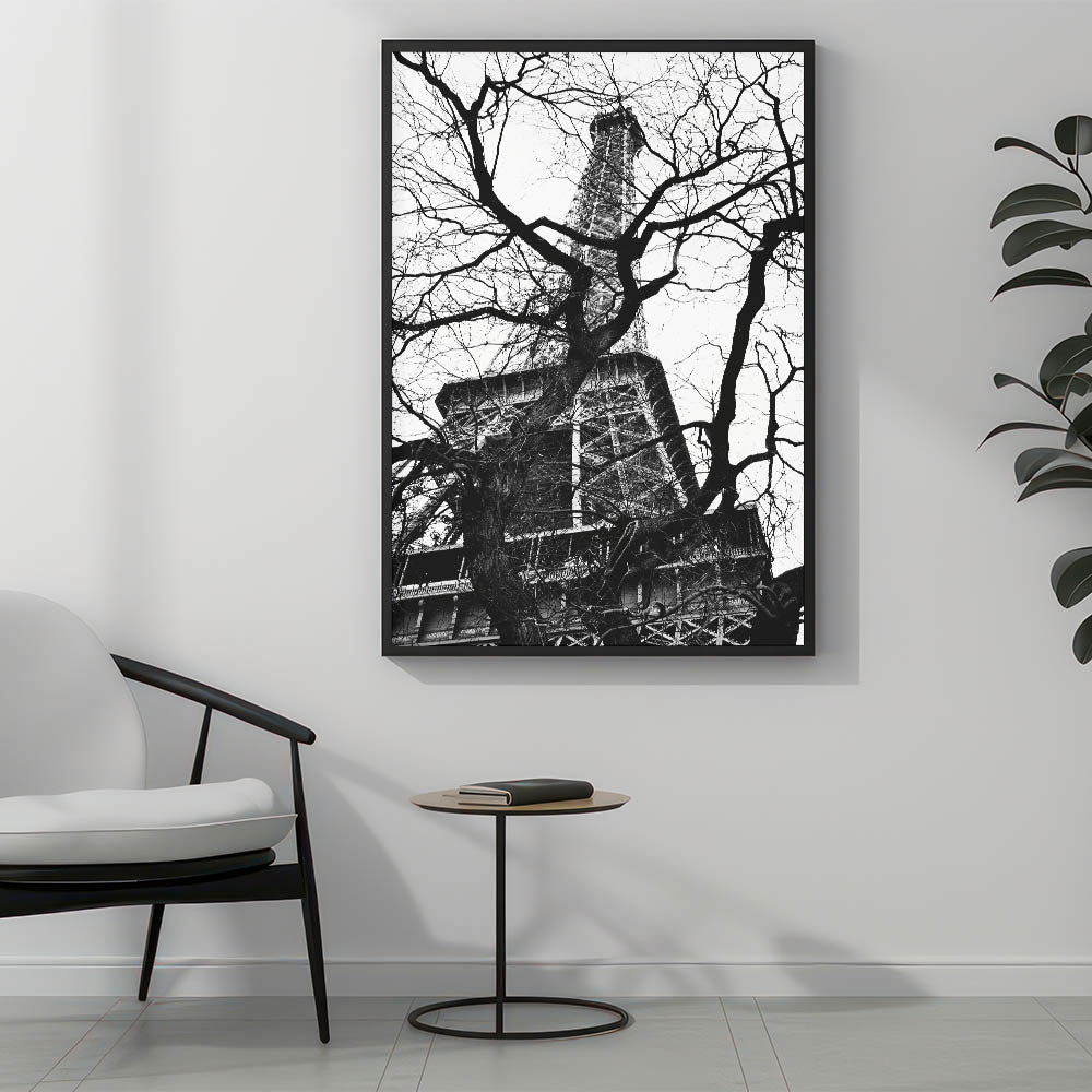 Experience the allure of Paris with this fine art photography framed print. Capturing the Eiffel Tower framed by a web of bare tree branches, this striking black-and-white composition plays with contrast, texture, and depth. The iconic structure stands tall behind the intricate natural forms, creating a unique and captivating visual.