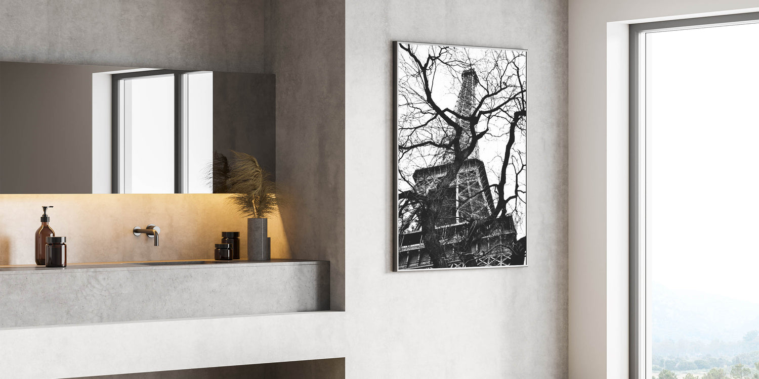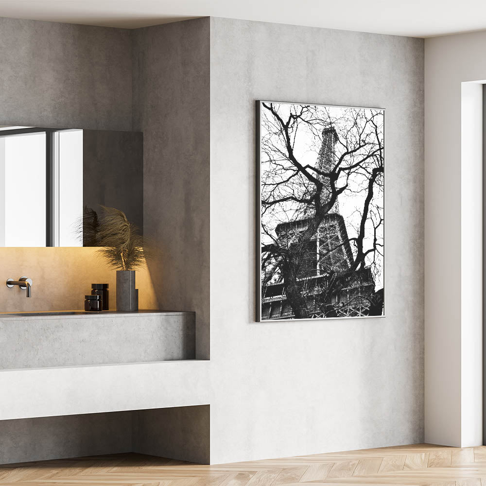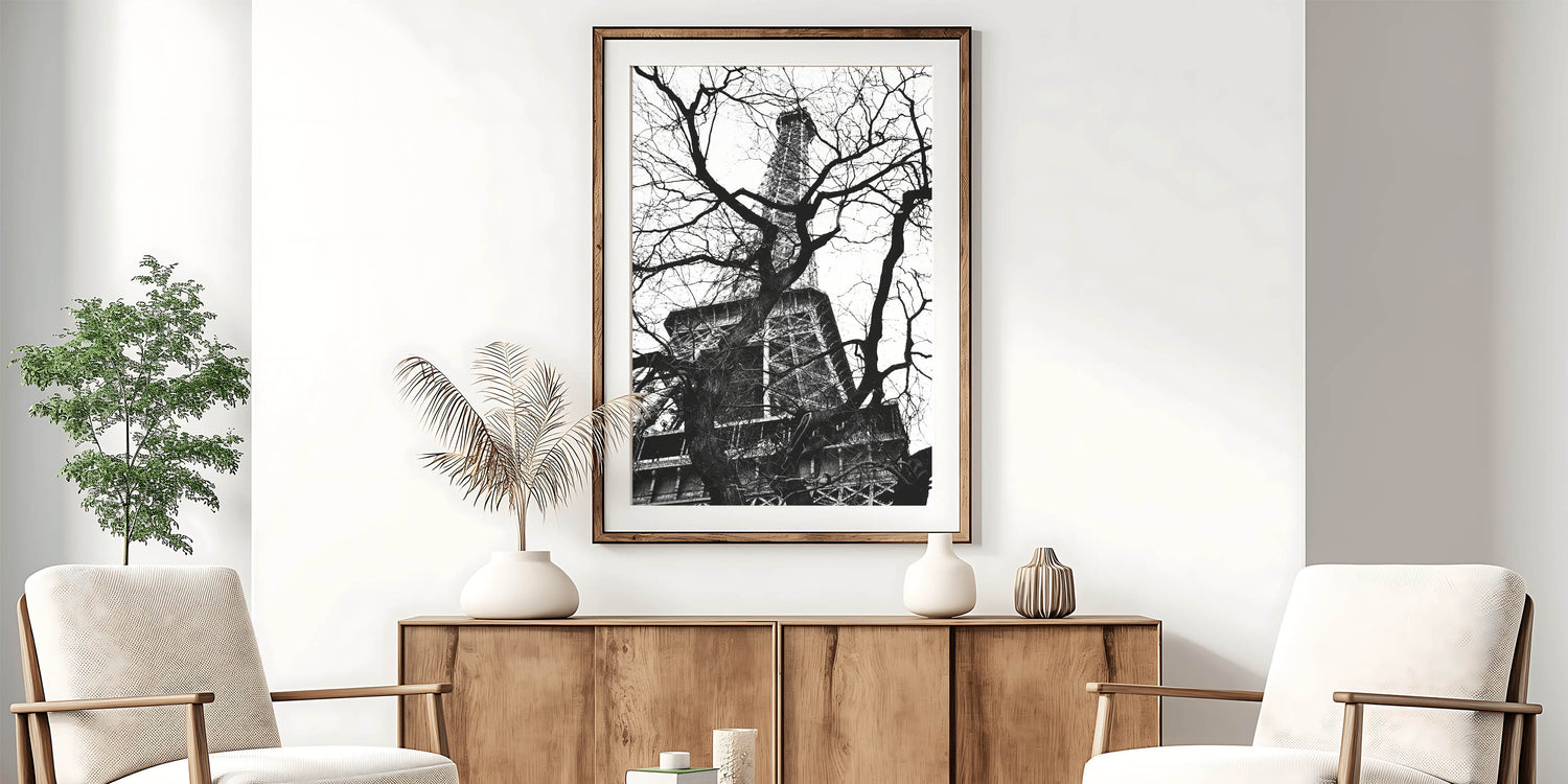 Experience the allure of Paris with this fine art photography framed print. Capturing the Eiffel Tower framed by a web of bare tree branches, this striking black-and-white composition plays with contrast, texture, and depth. The iconic structure stands tall behind the intricate natural forms, creating a unique and captivating visual.