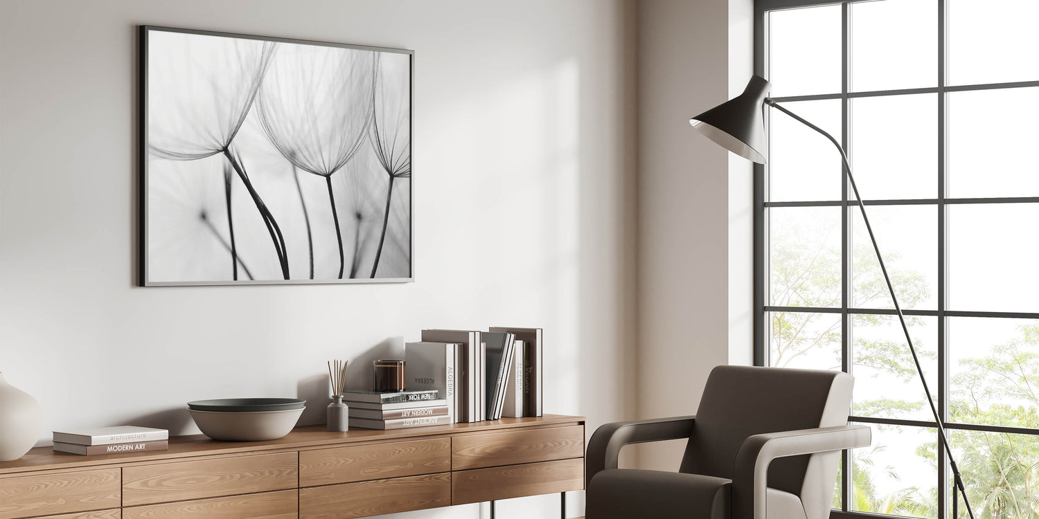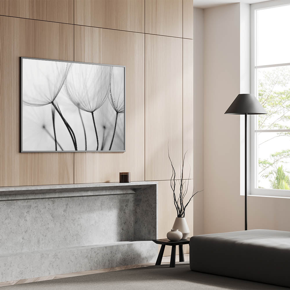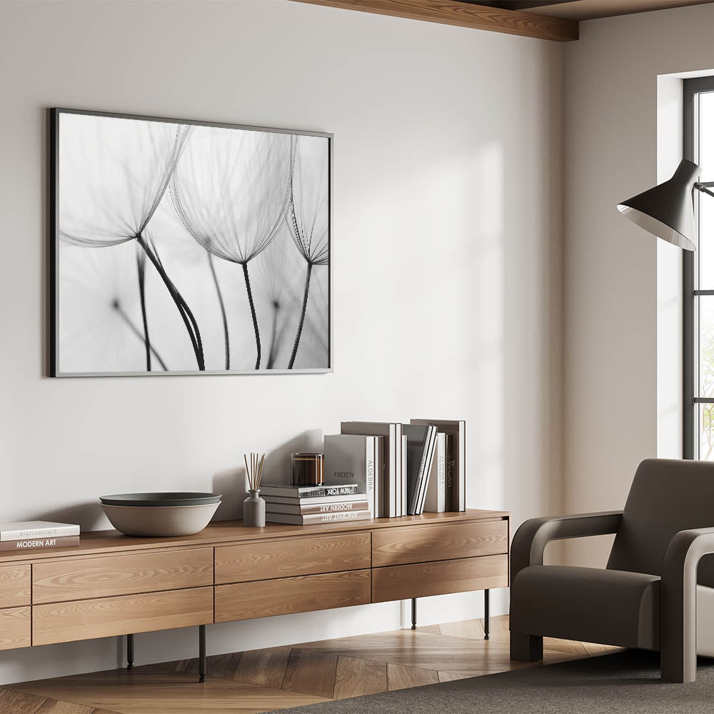 Capturing the delicate essence of nature, this fine art black and white photograph highlights the intricate details of dandelion seeds in a soft and ethereal composition. The minimalist monochrome palette enhances the elegance of each fragile seed, creating a timeless and calming piece ideal for contemporary interiors.