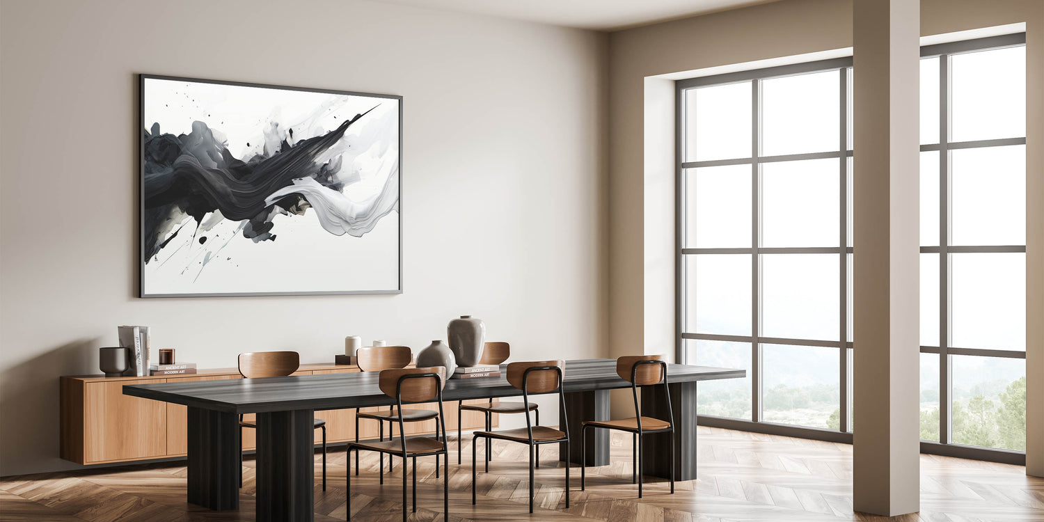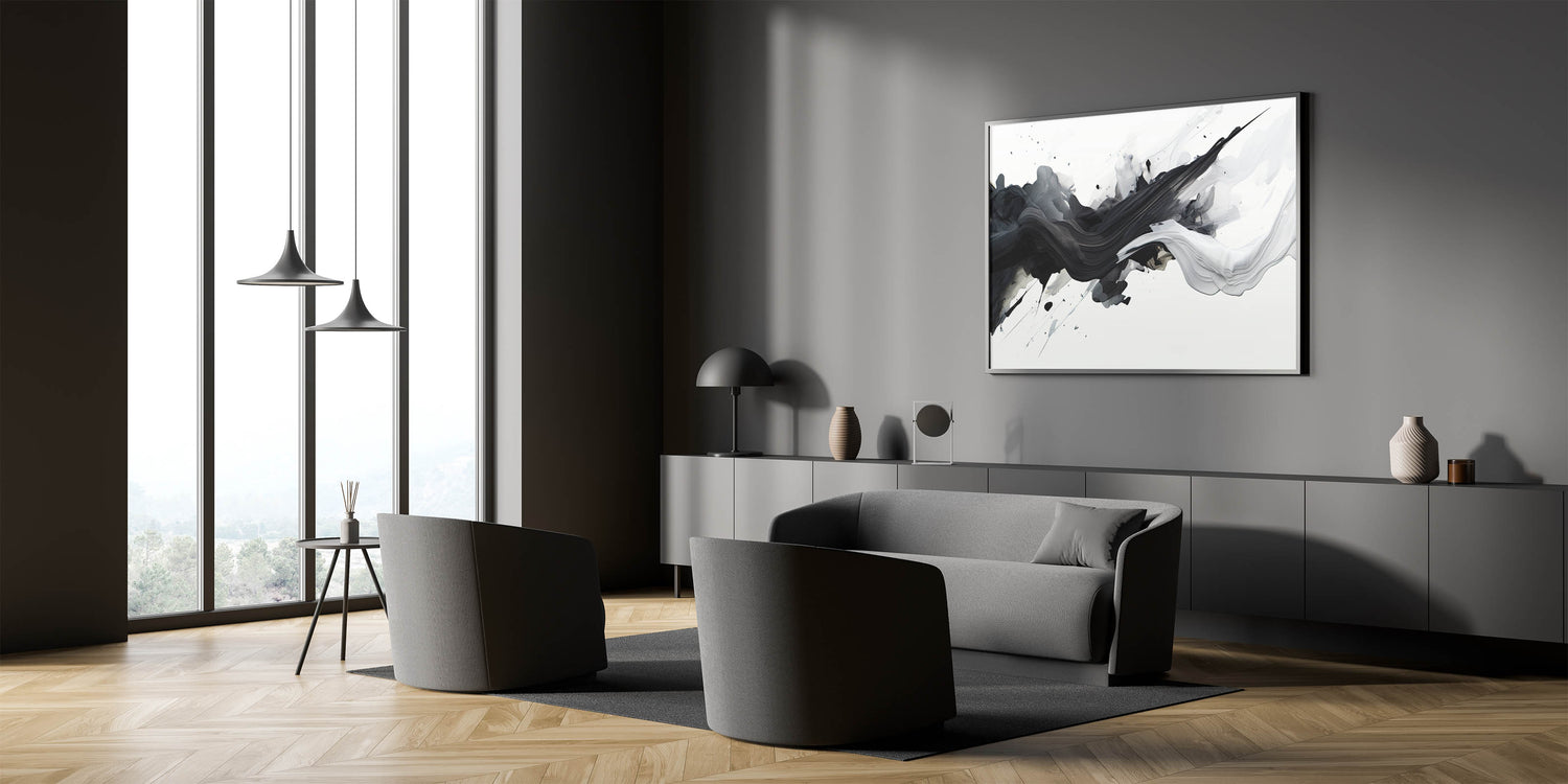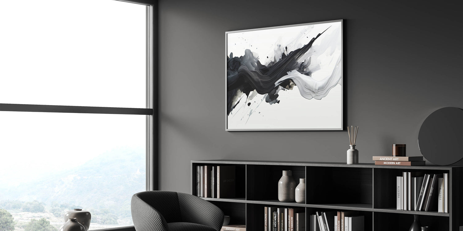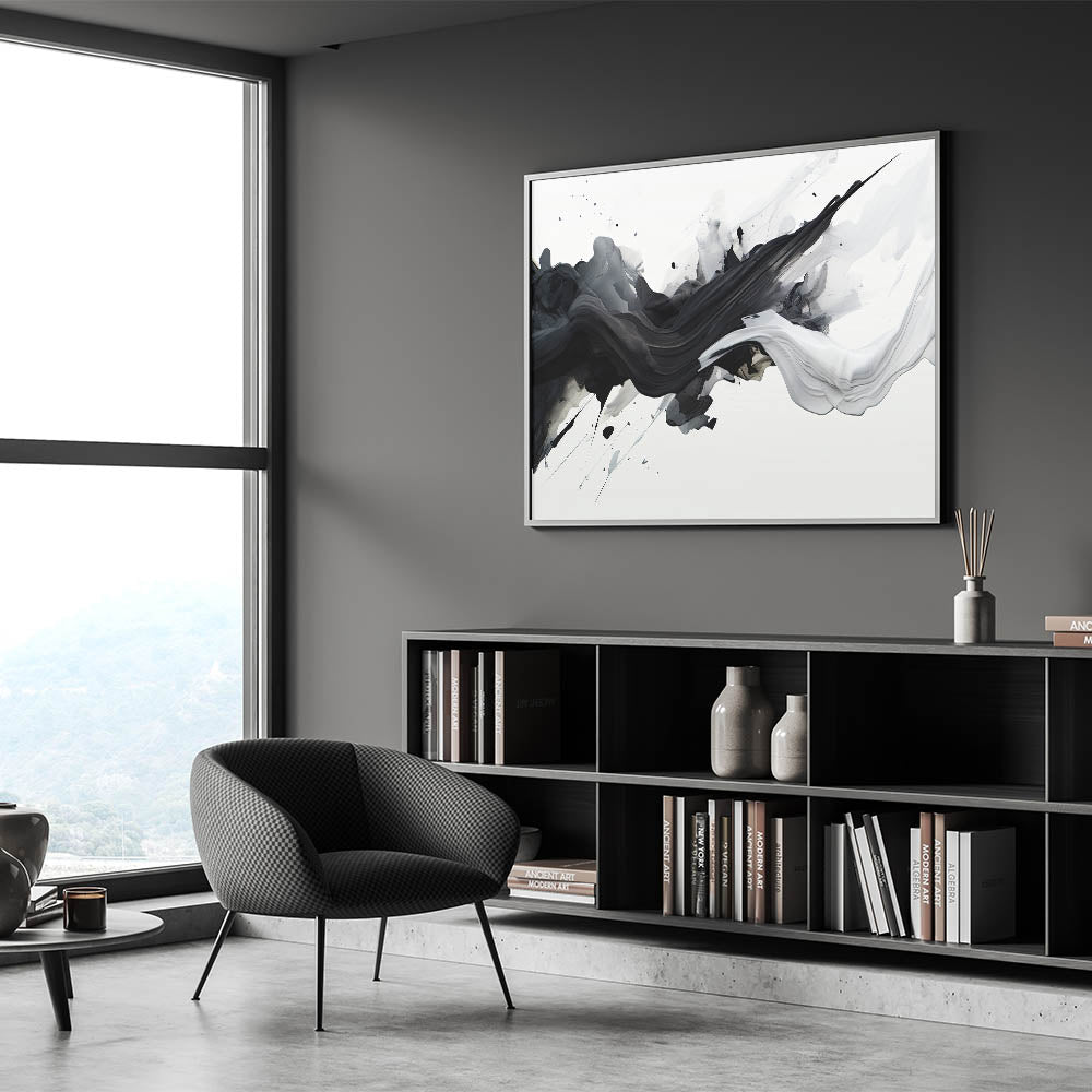 Introduce a sense of fluid elegance to your space with this black and white abstract art piece. Featuring flowing monochrome patterns, this design brings a contemporary and sophisticated touch to any room.