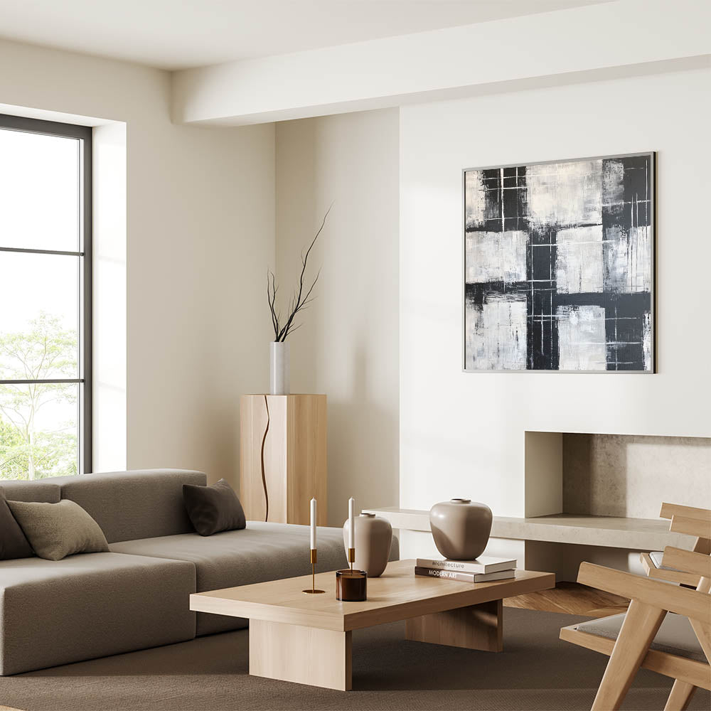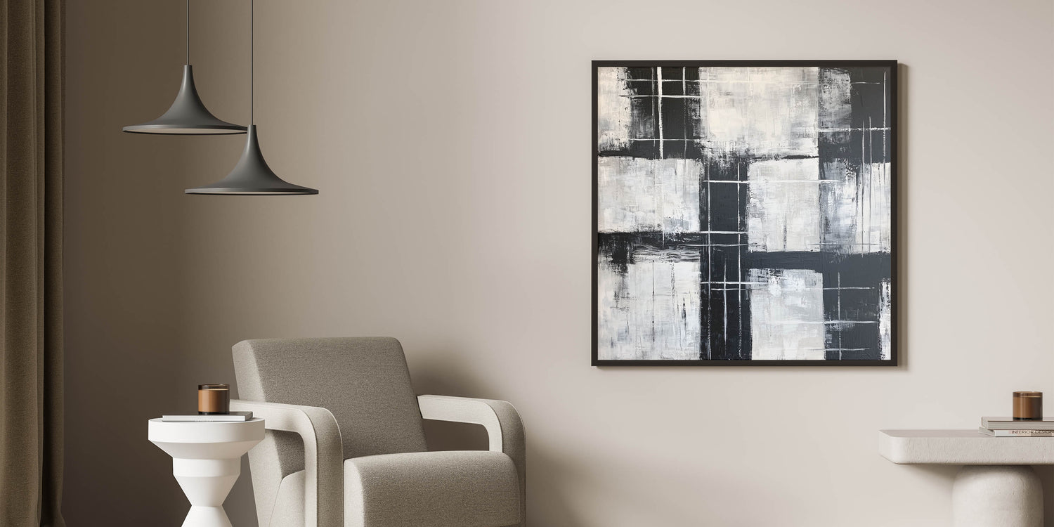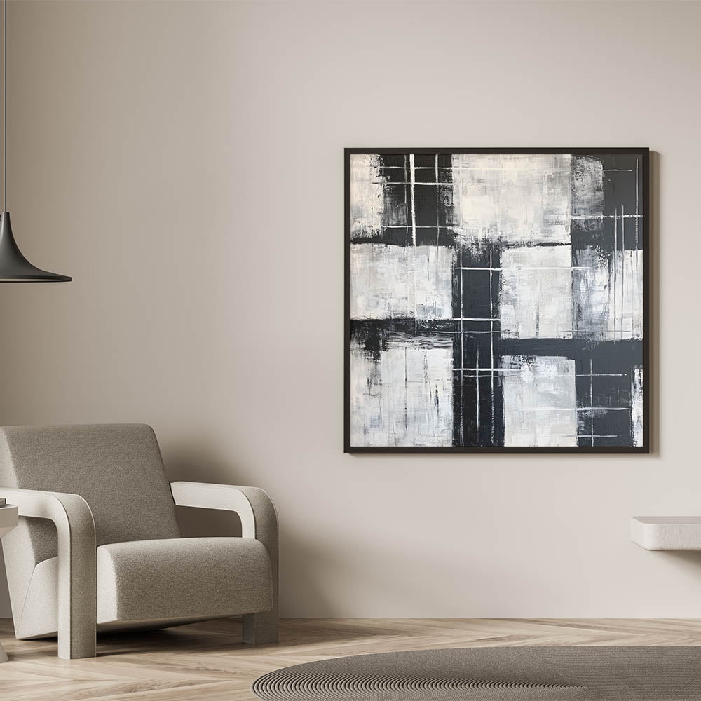 Elevate your interior with this geometric abstract painting, a bold fusion of black, white, and gray tones arranged in a structured yet expressive grid. This modern abstract wall art features a dynamic interplay of textured brushstrokes and intersecting lines, creating a balance of movement and stability. The high-contrast palette adds a contemporary touch, making it an ideal statement piece for modern, industrial, and minimalist interiors.