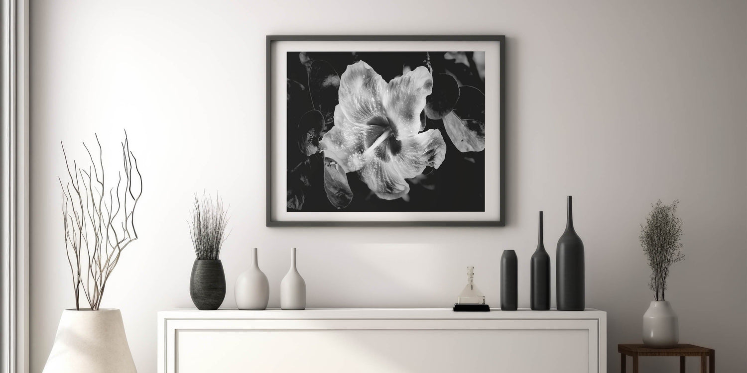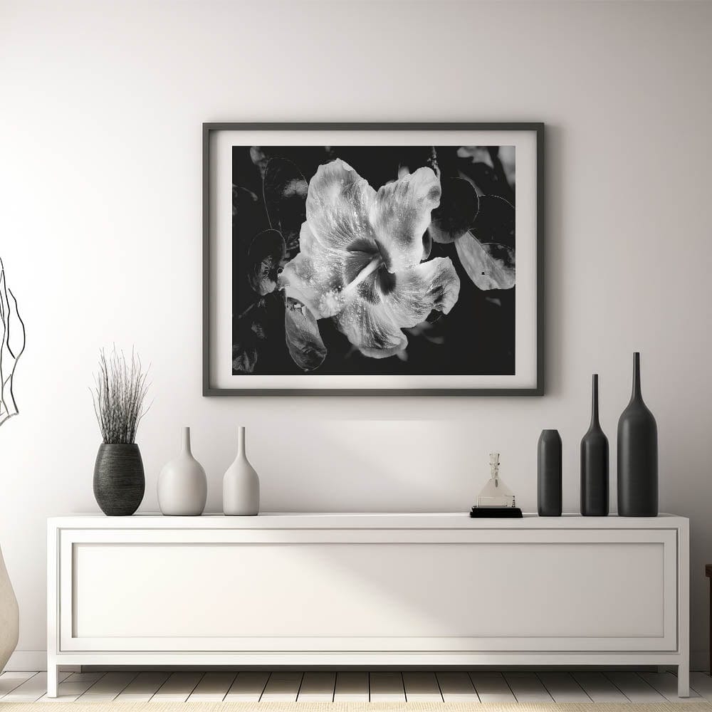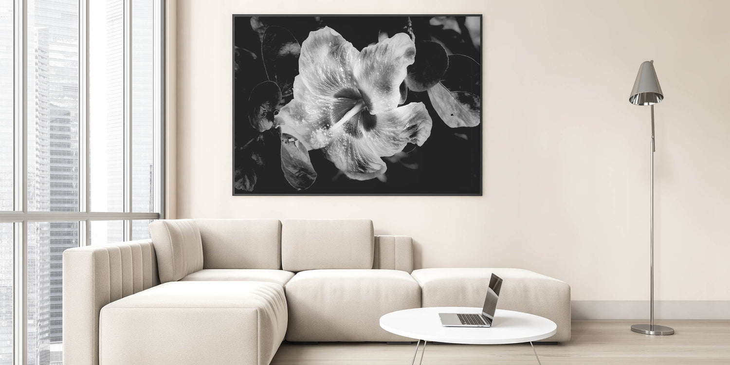 Celebrate the delicate beauty of nature with this exquisite fine art photography canvas print. Featuring a high-contrast black-and-white hibiscus flower covered in water droplets, this piece showcases the intricate details of its petals with stunning clarity.
