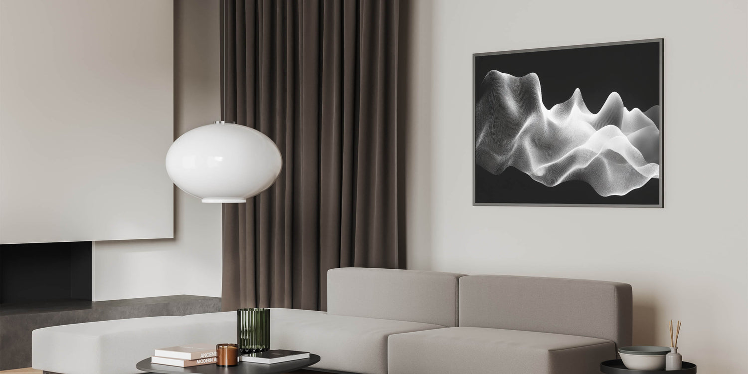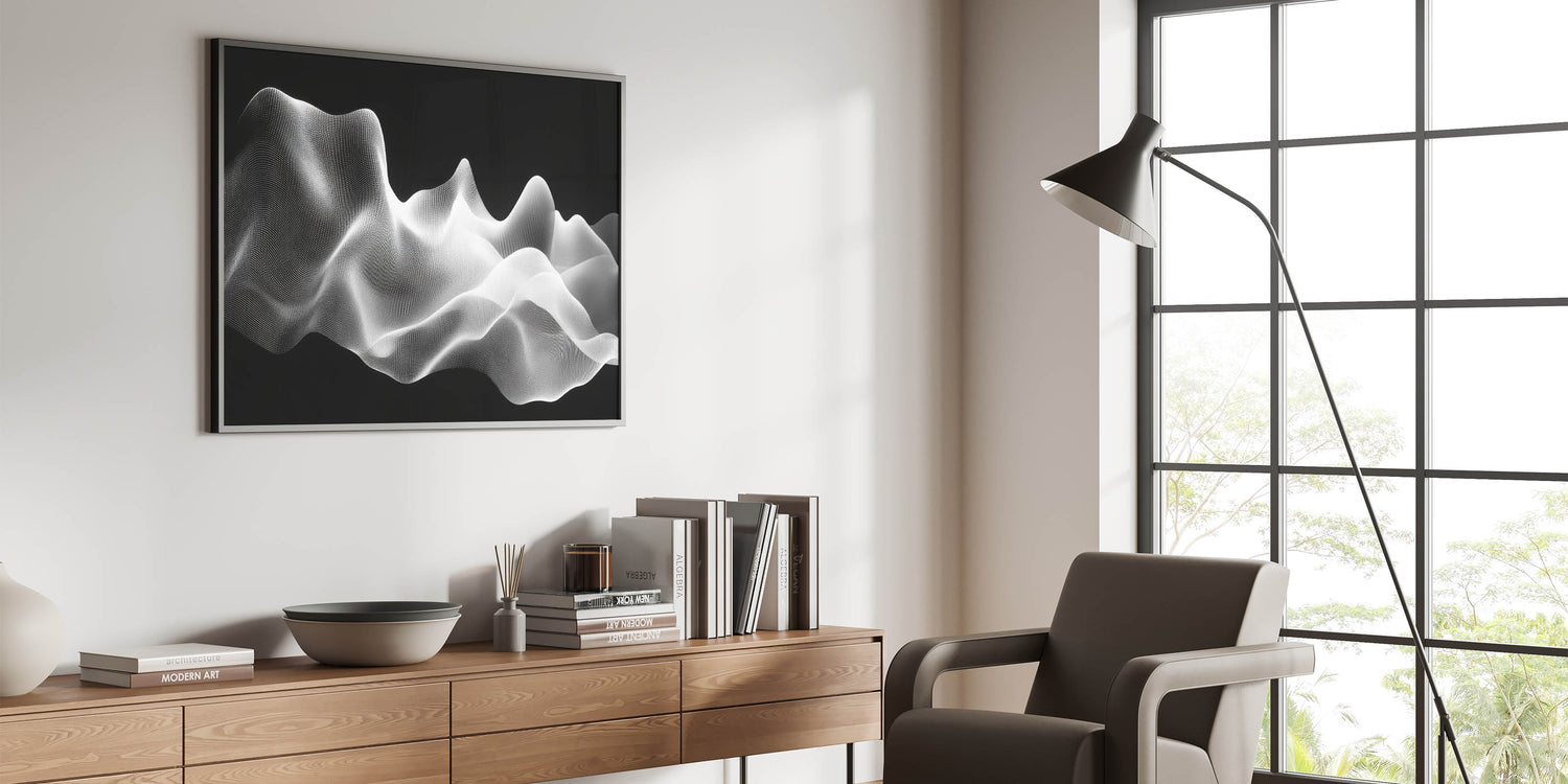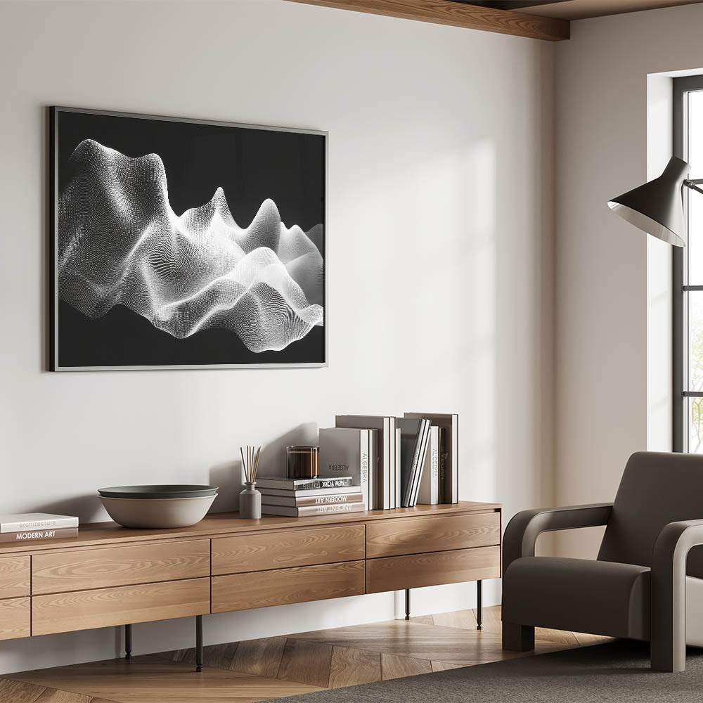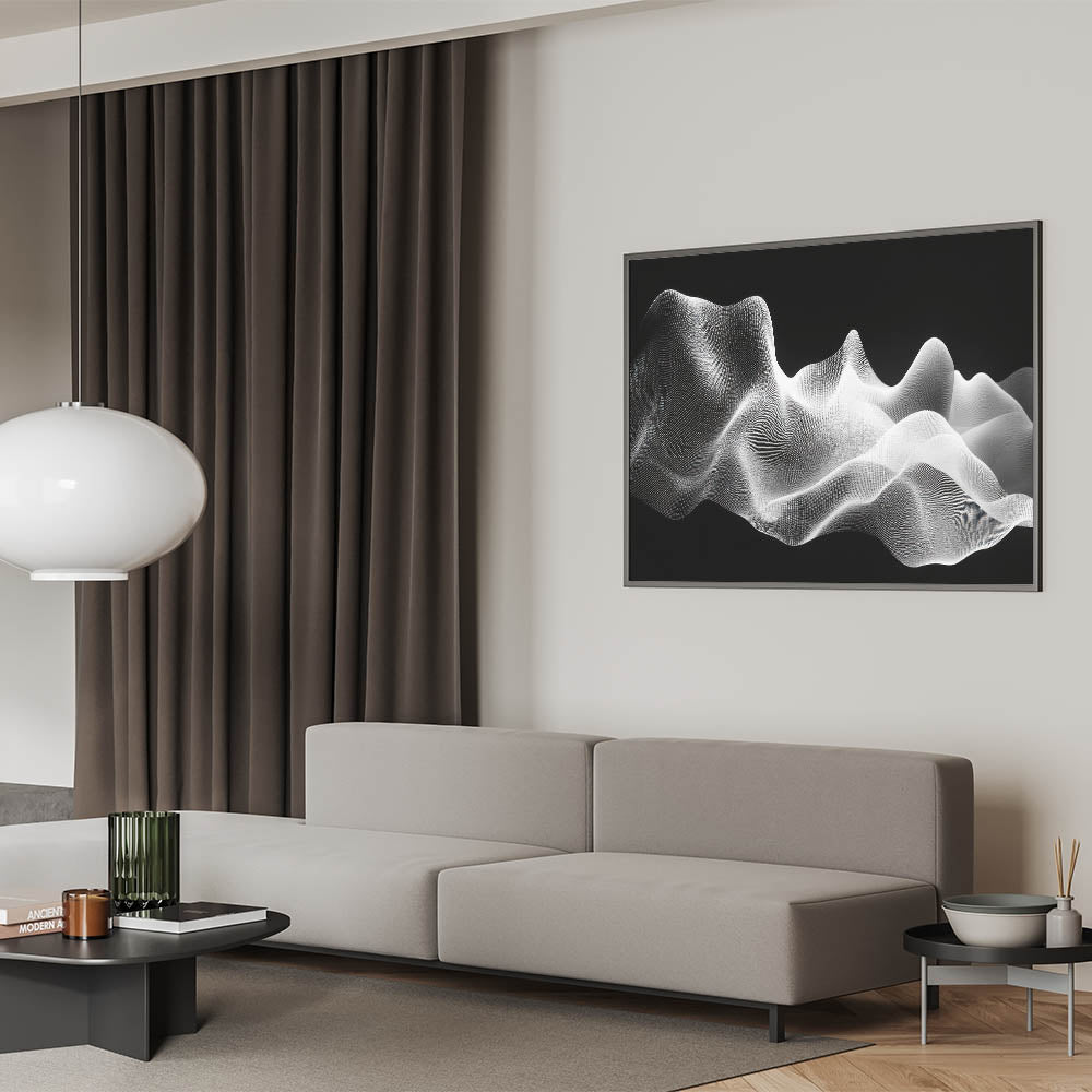 Transform your space with this bold abstract wall art from our High-Contrast Abstracts collection. Featuring delicate mesh-like white waves suspended in darkness, this artwork creates a striking contrast and evokes a feeling of digital motion frozen in time. It’s a modern masterpiece that adds sophistication and visual intrigue.