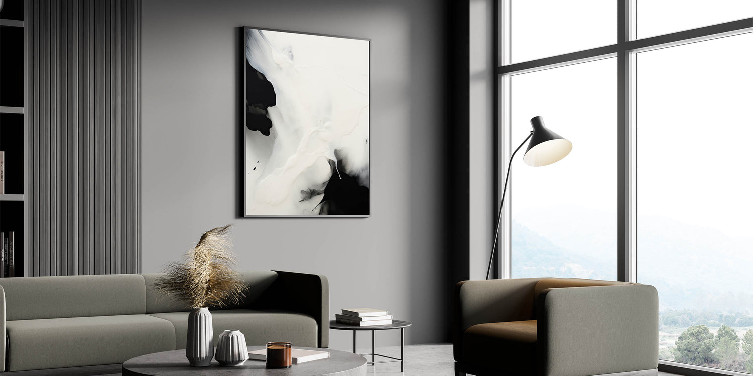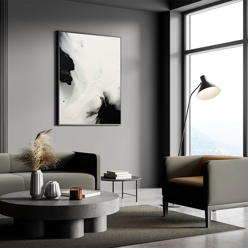 Elevate your space with this minimalist abstract art featuring a dynamic interplay of black and white tones. The flowing design of this piece embodies the essence of modern minimalist art, with soft gradients and smooth transitions between dark and light. Perfect for contemporary interiors, this artwork adds sophistication and style, making it an ideal centerpiece for living rooms, bedrooms, or offices.
