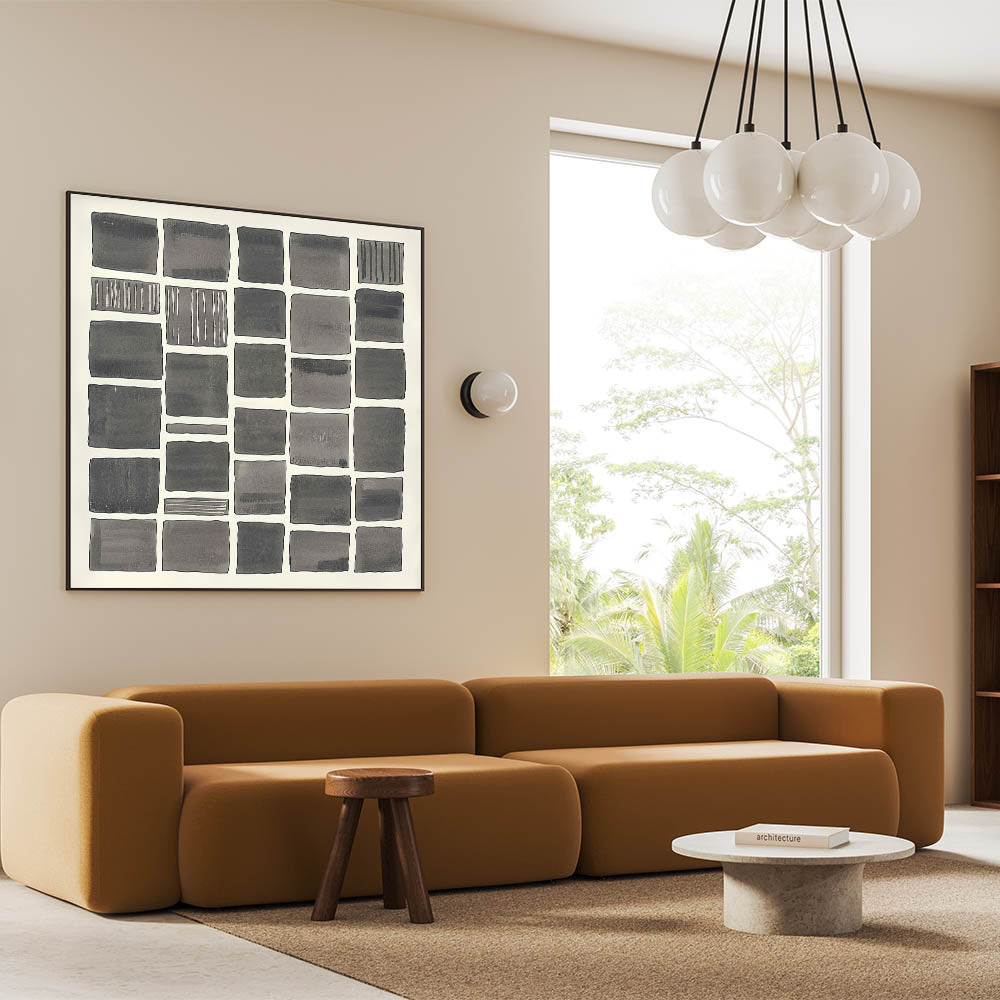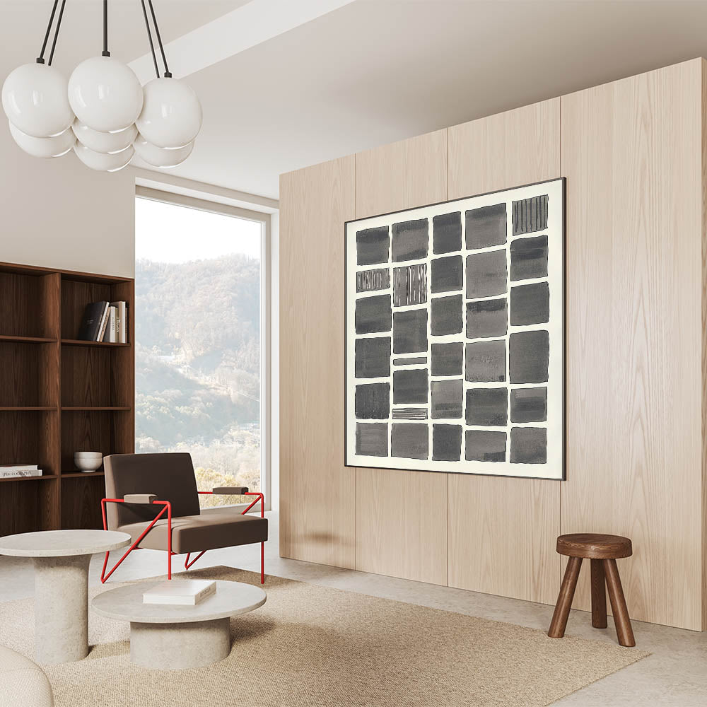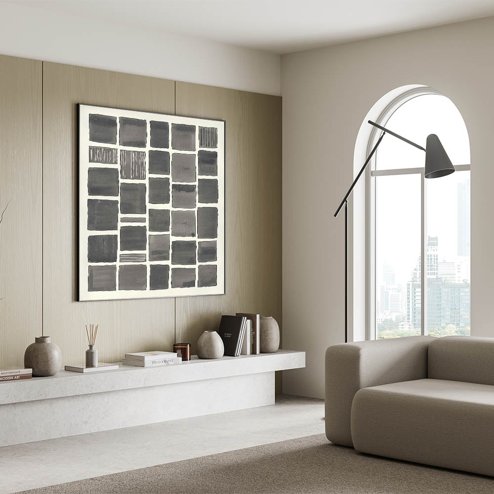 Elevate your interior décor with this minimalist abstract art featuring a grid of geometric squares in varying shades of gray. The subtle variations in tone and texture within each square create depth and interest, while the structured layout adds a sense of order and balance. This artwork is ideal for modern and minimalist spaces, blending seamlessly with contemporary aesthetics.
