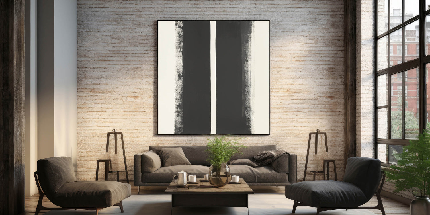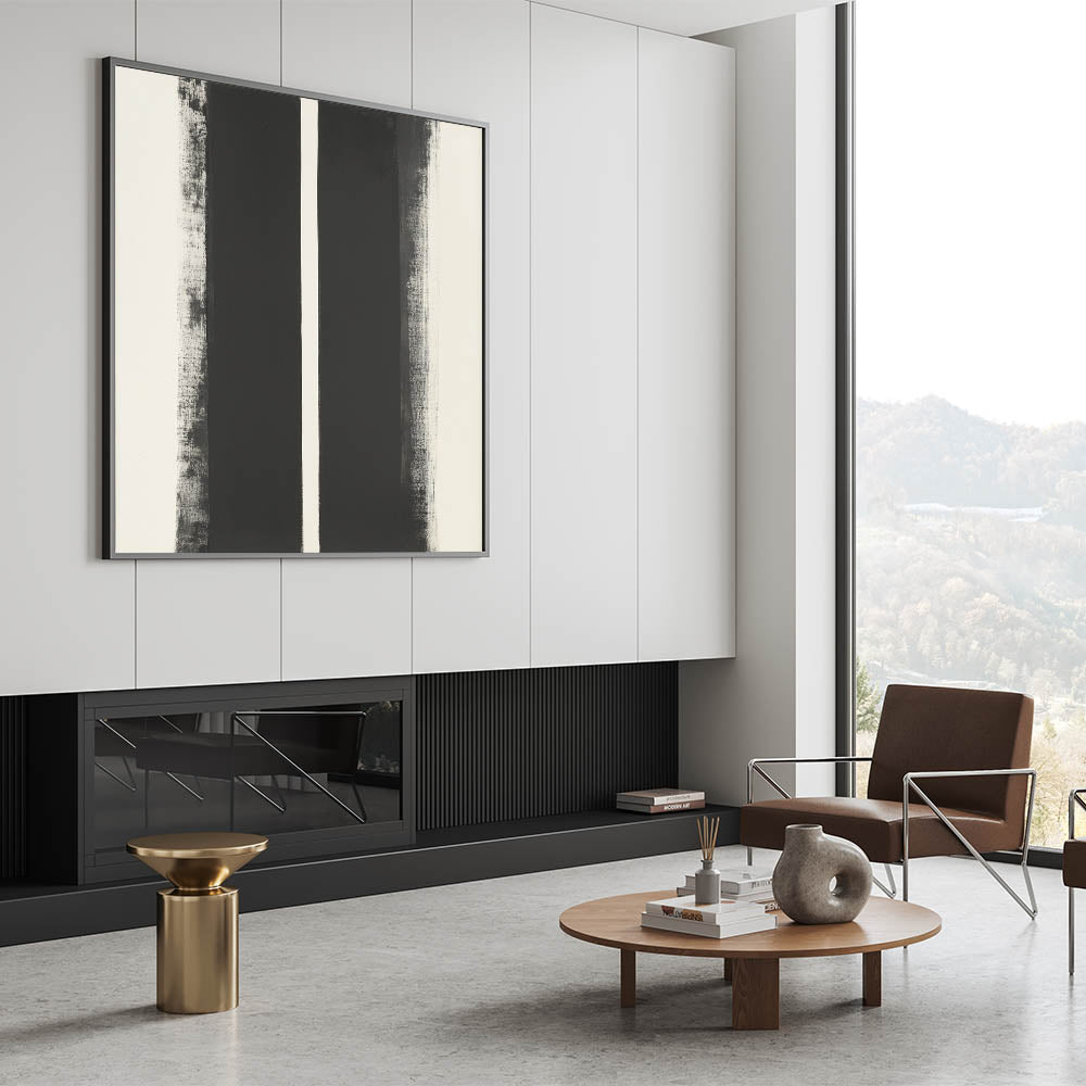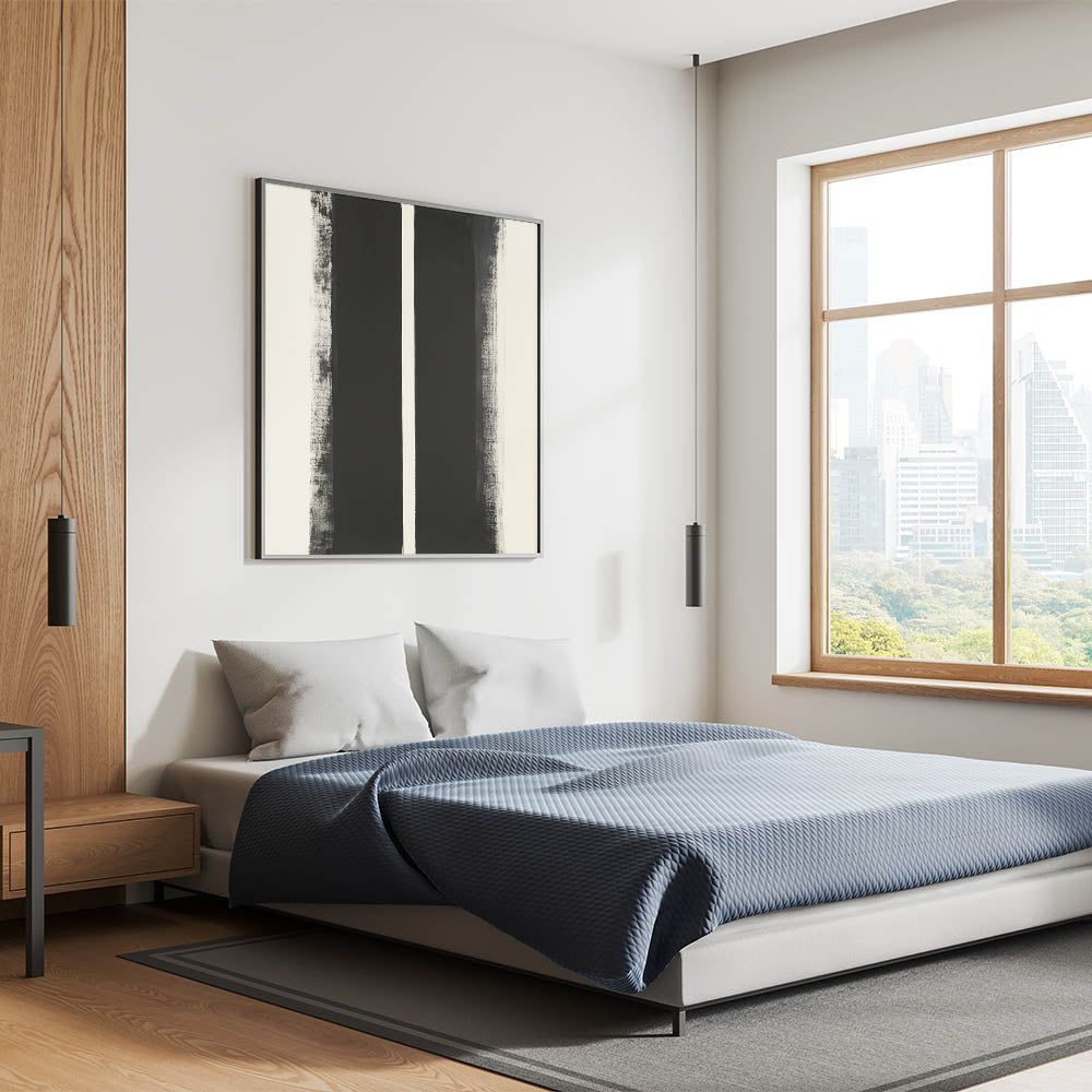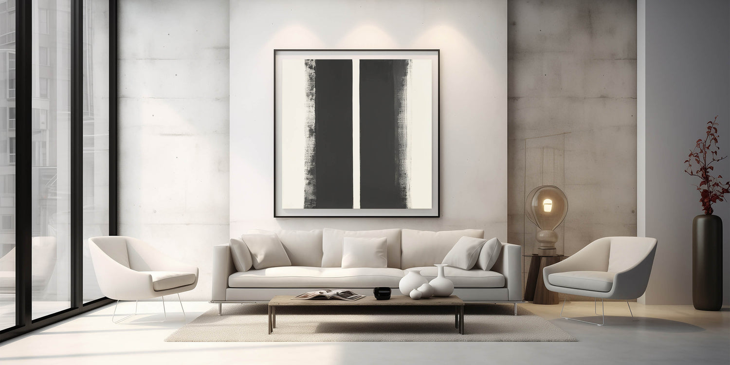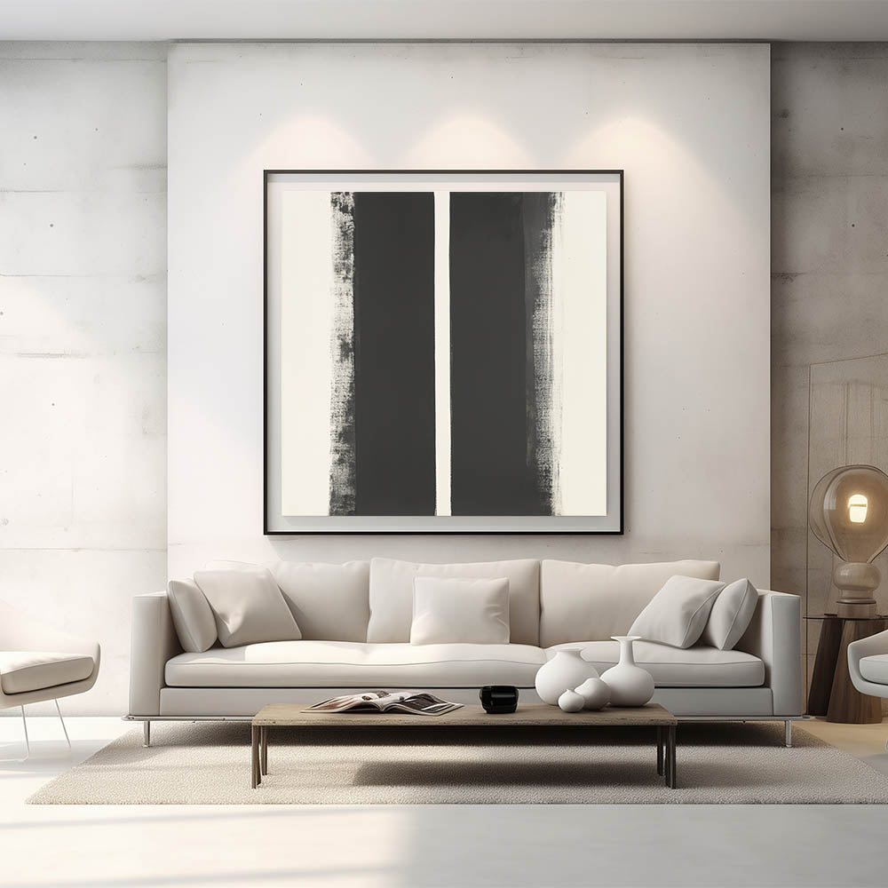 Enhance your space with this abstract geometric wall art, a striking composition that blends modern geometric art prints with minimalist wall decor ideas. Featuring bold black vertical elements against a white background, this piece creates a contemporary abstract pattern that complements any interior style.