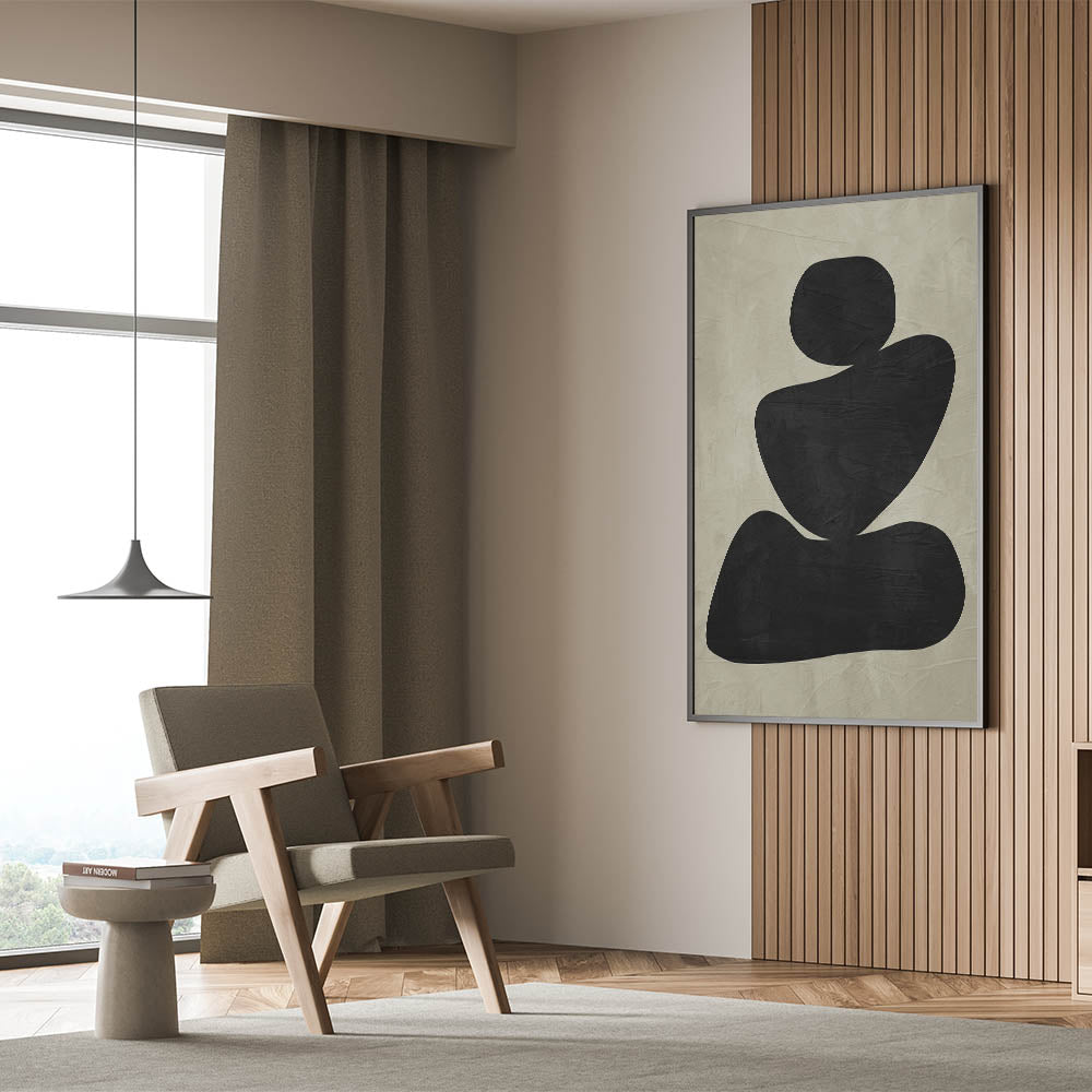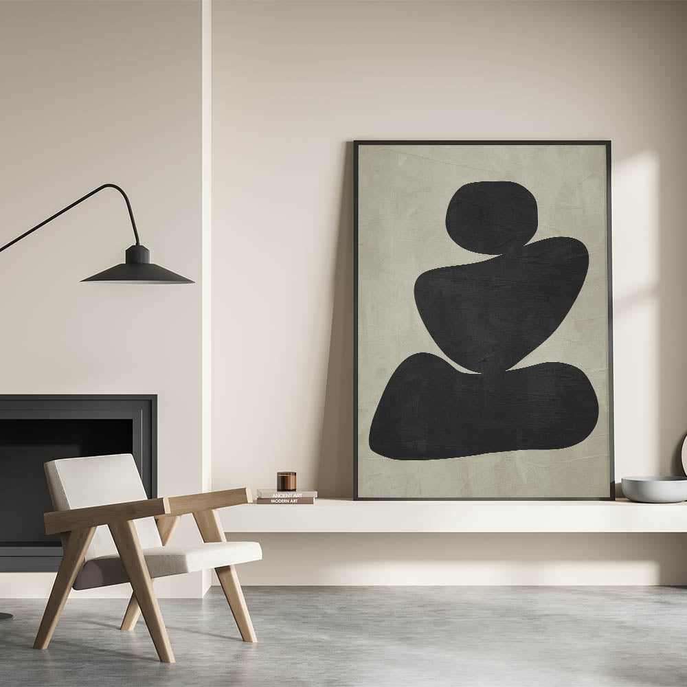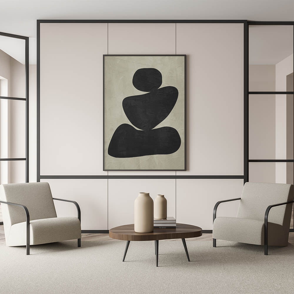 This modern abstract wall art features a serene composition of stacked organic black forms against an earthy olive green background. The minimalist design conveys a sense of balance, calm, and simplicity, making it a perfect piece for modern interiors seeking a tranquil, meditative touch. As part of the modern abstract art collection, this artwork is ideal for those who appreciate geometric patterns in modern art with a natural and harmonious aesthetic.