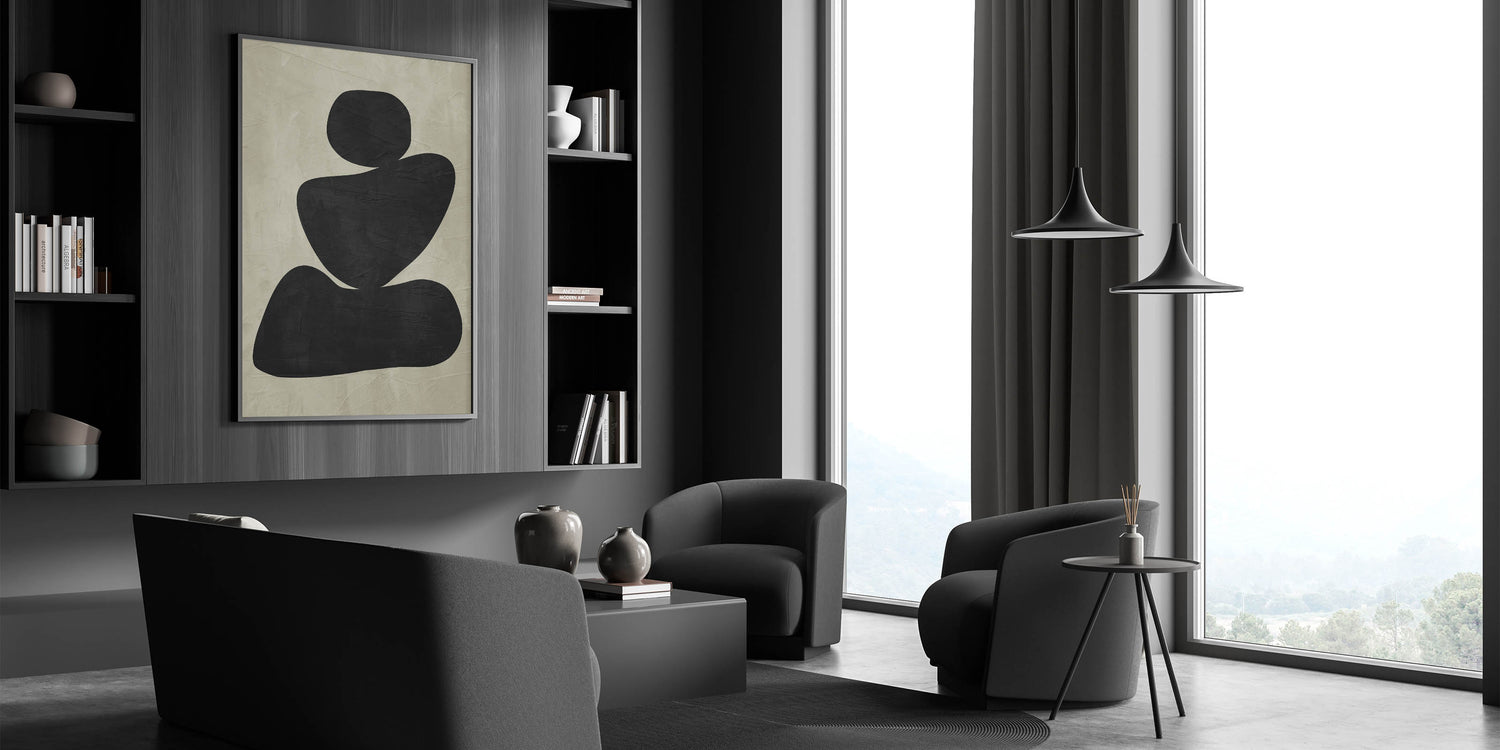 - Earthy Minimalist Palette: Features minimalist abstract paintings in black and olive green, creating a natural yet modern visual appeal.
