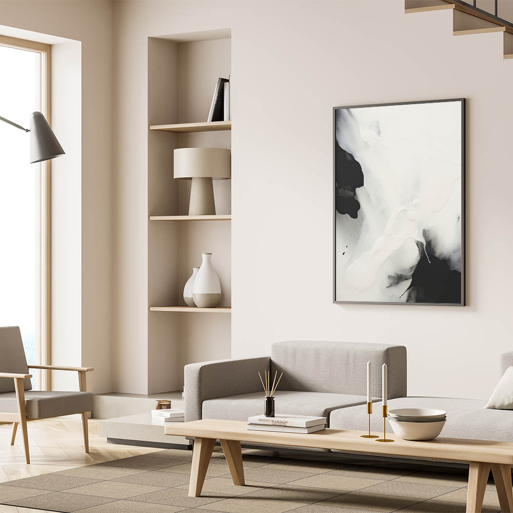 Enhance your space with this captivating minimalist black and white abstract art. This oil painting-inspired piece features fluid shapes and soft gradients, creating a sense of calm and modern sophistication. The contrast of black and white swirls brings an elegant, monochromatic aesthetic that fits seamlessly into any contemporary or minimalist decor.