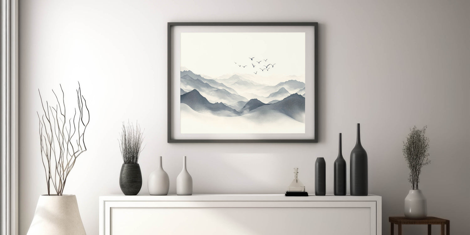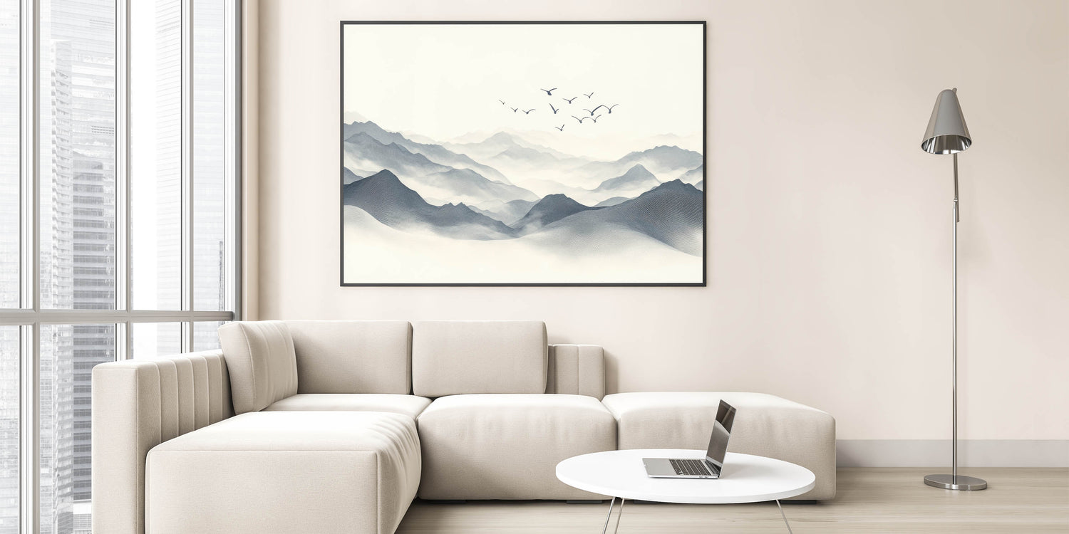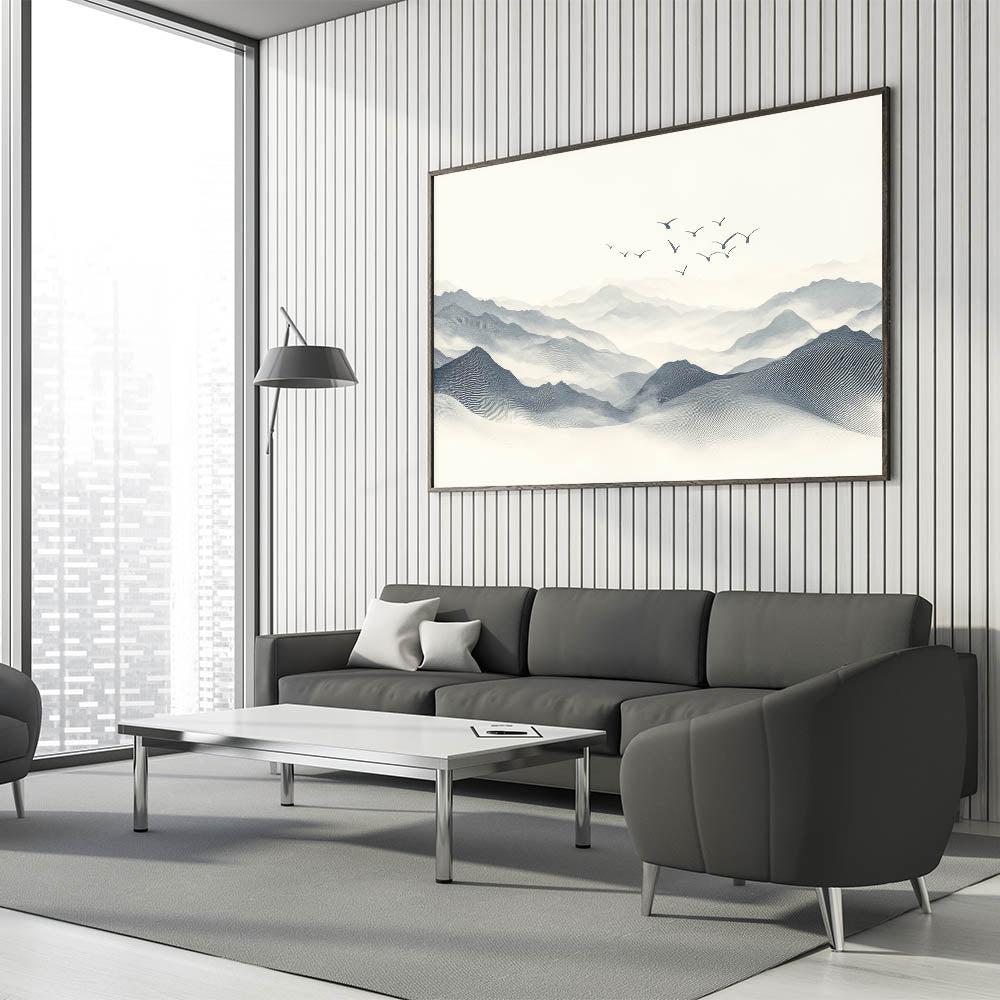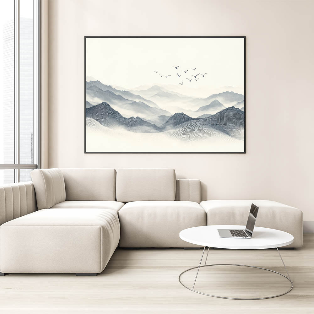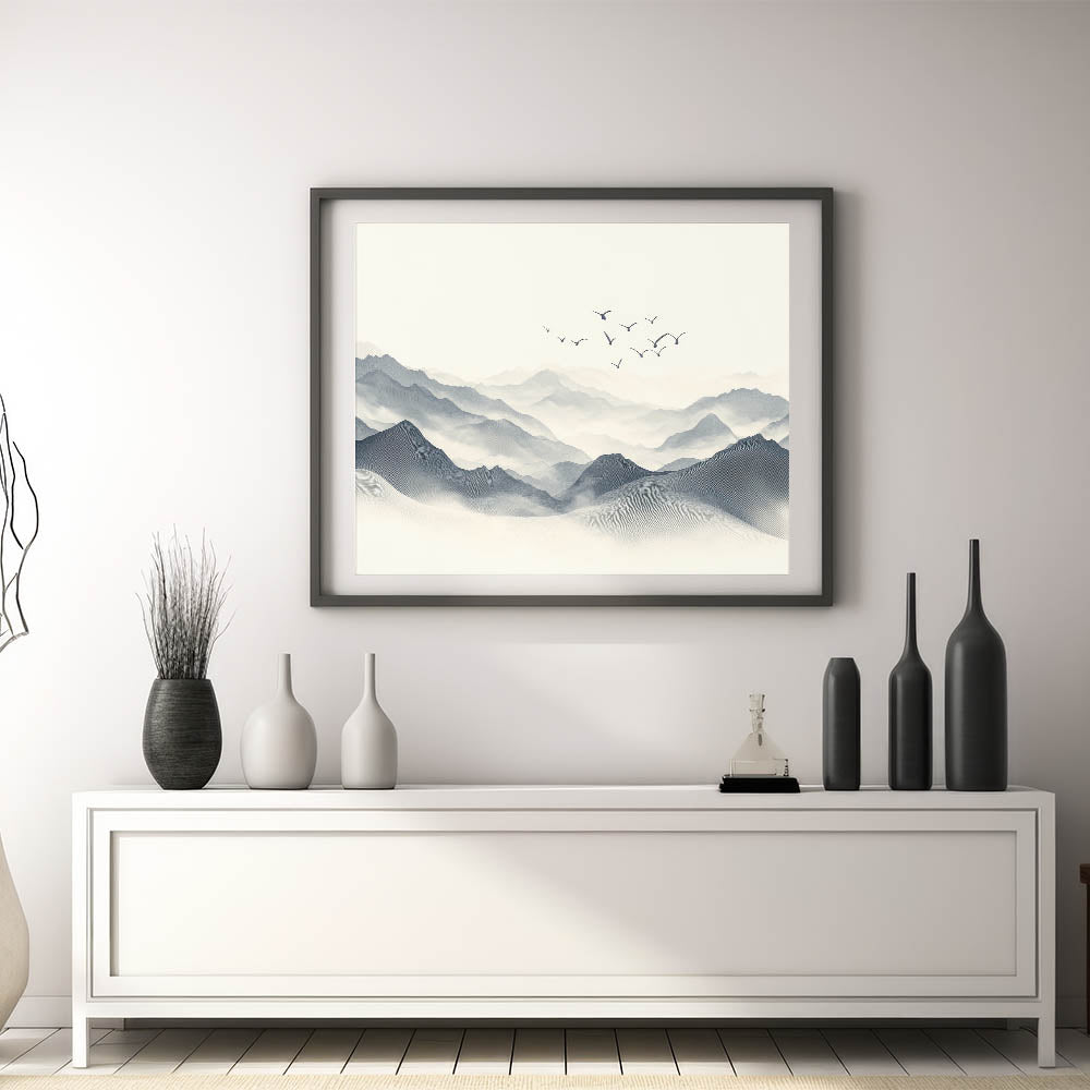 Bring a sense of peace and elegance to your space with this contemporary black and white abstract art piece. Featuring a misty mountain landscape with delicate birds soaring in the distance, this artwork embodies tranquility, balance, and nature-inspired minimalism. The soft gradient of grayscale tones creates a calming effect, making it a perfect choice for modern, Scandinavian, and Zen-inspired interiors.