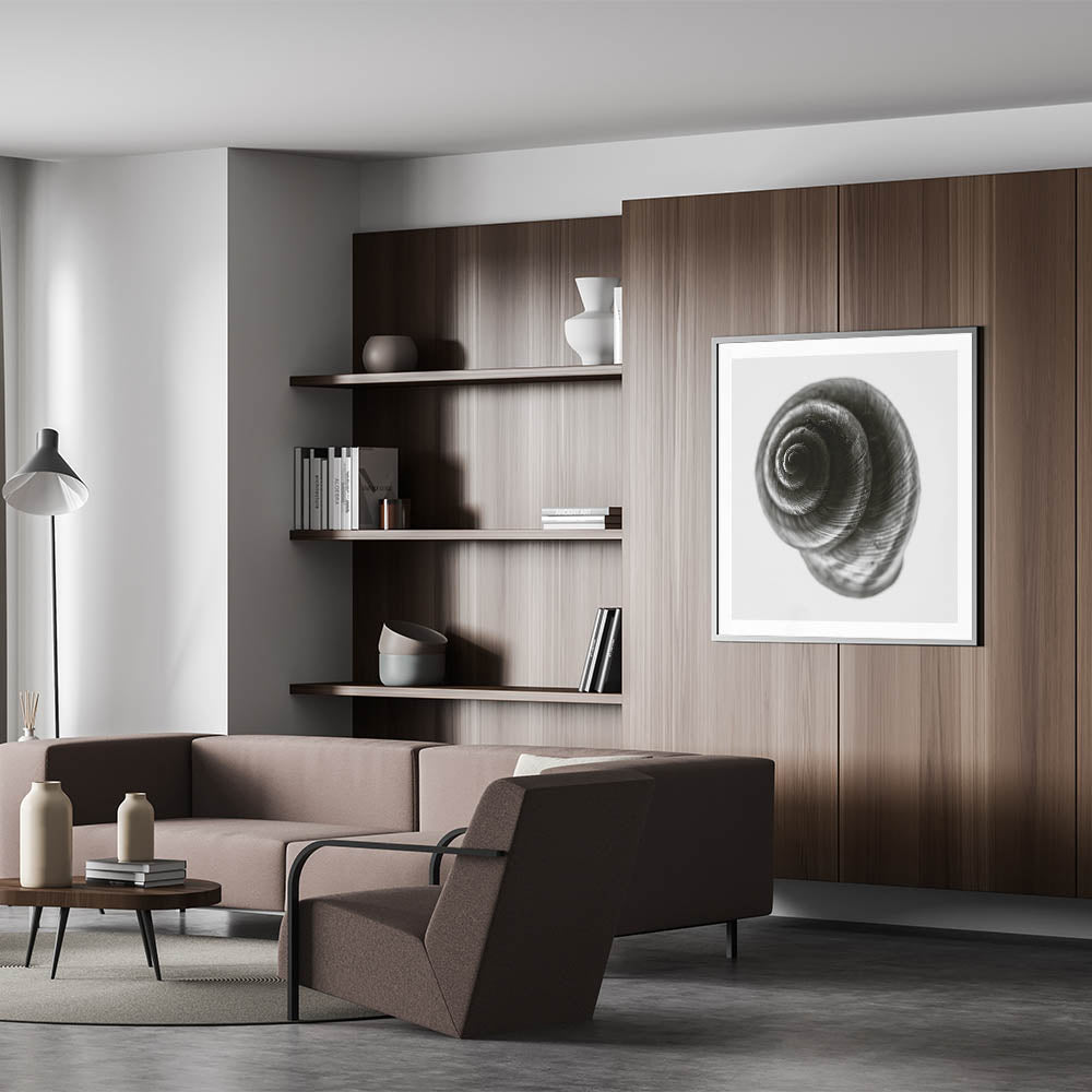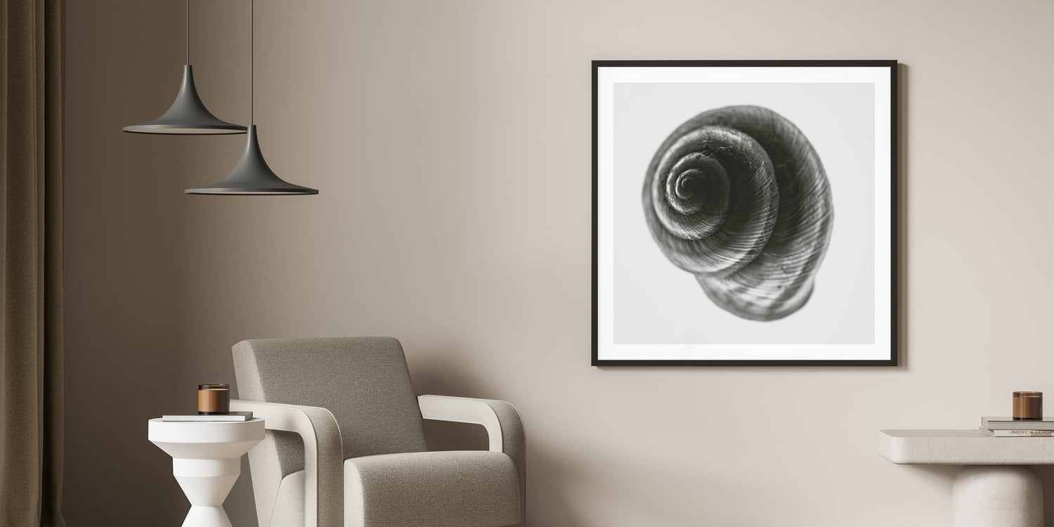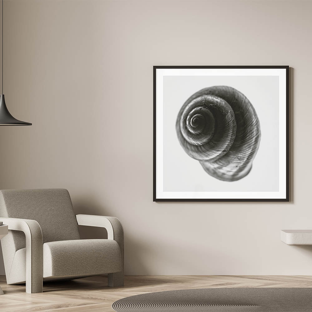 Explore the mesmerizing beauty of nature’s design with this black-and-white fine art photograph. Capturing the delicate spiral of a shell in stunning detail, this high-contrast image highlights the intricate textures and natural symmetry.