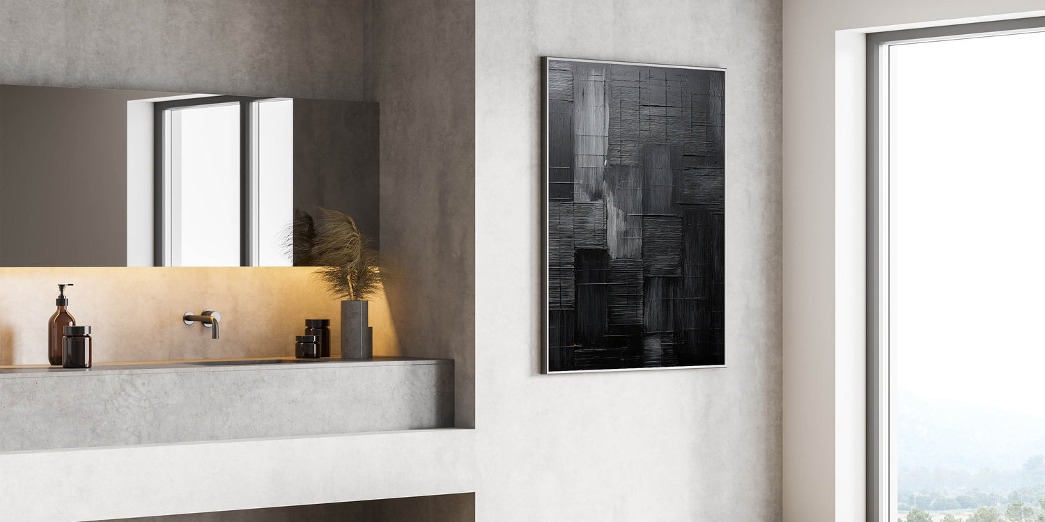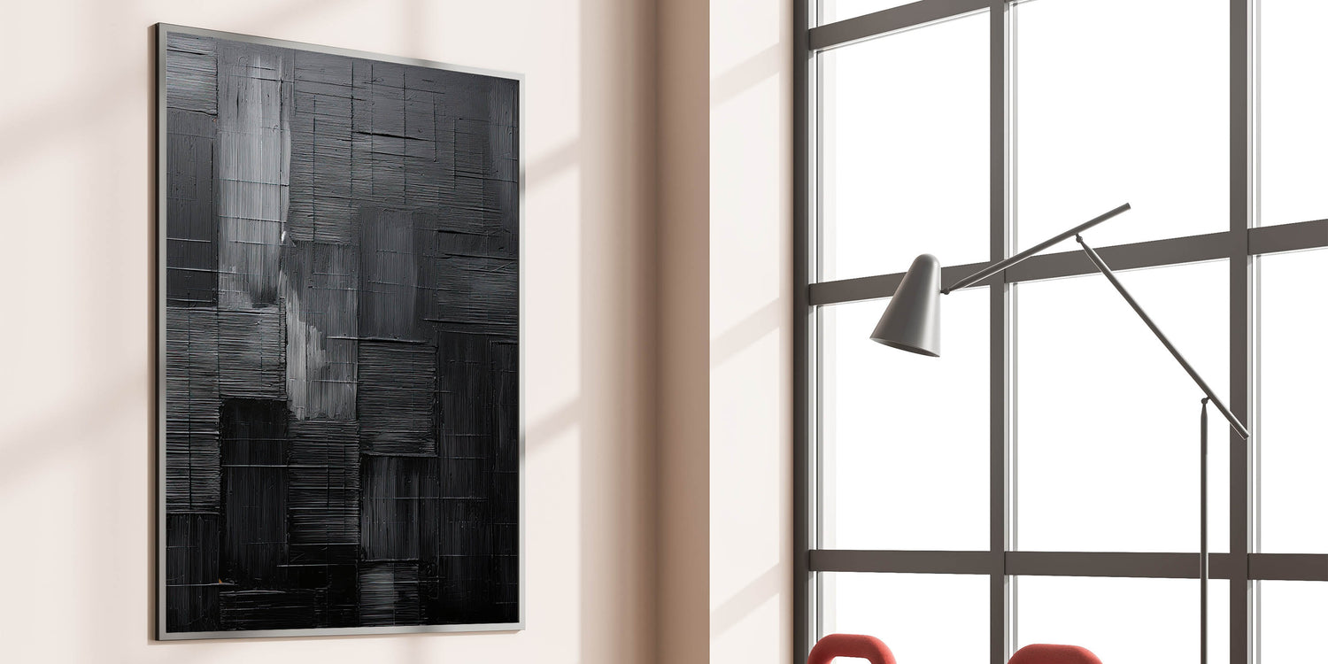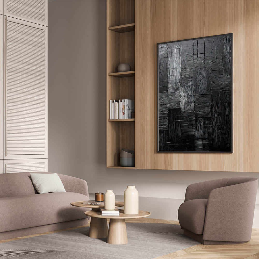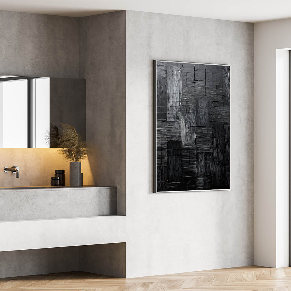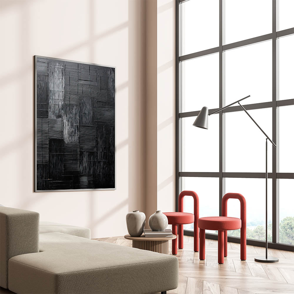 This textured abstract wall art provides a striking focal point for any room, with its deep black tones and intricate geometric design. The subtle gray accents offer contrast while maintaining a sleek, minimalist look. It’s an excellent choice for those seeking a modern and sophisticated wall decor option that stands out while remaining versatile.