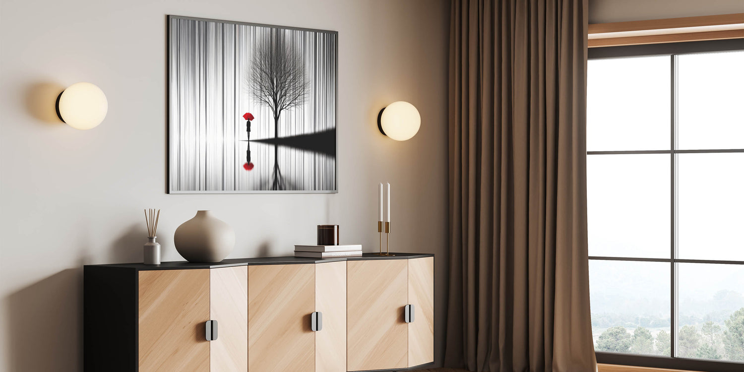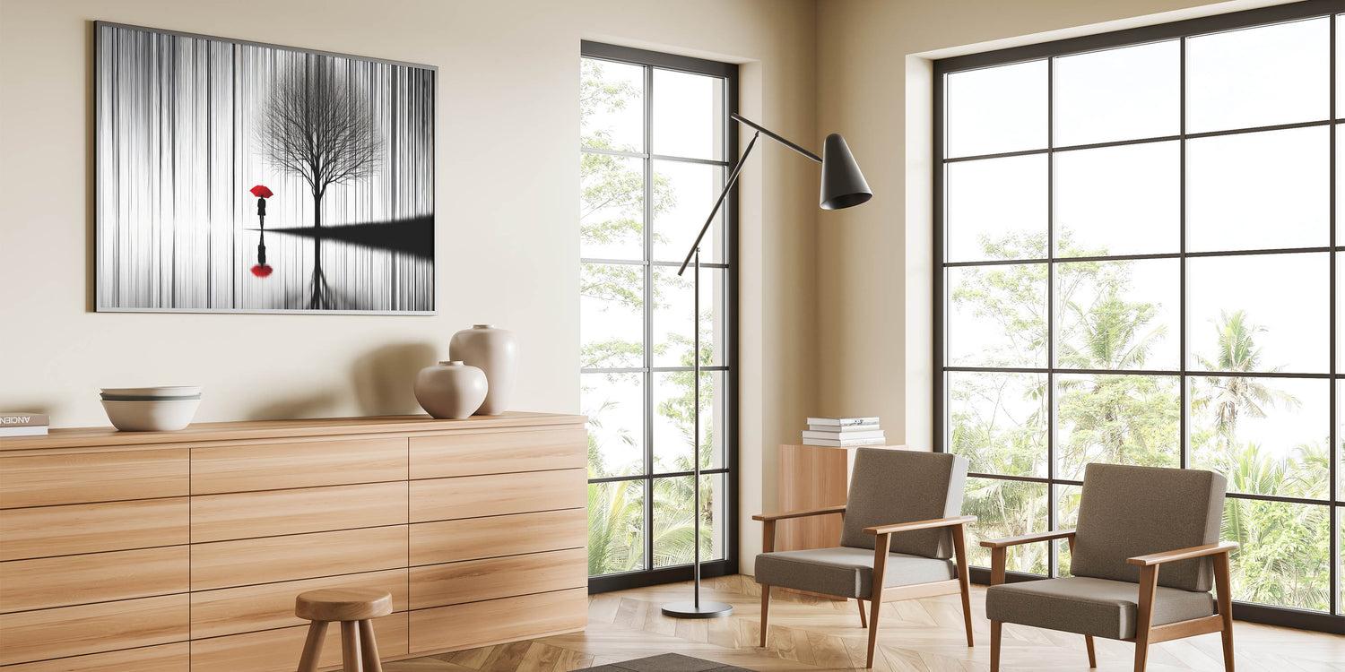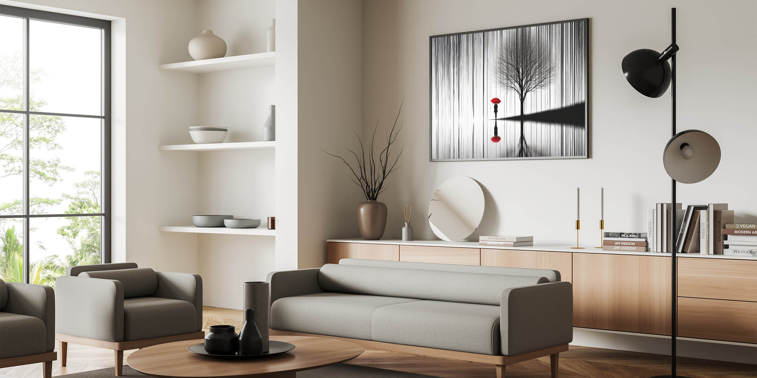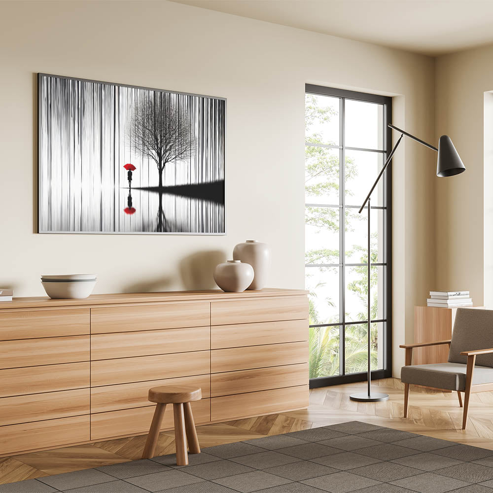 This captivating minimalist artwork presents a striking contrast between black and white with a vivid splash of red. Featuring a solitary figure holding a red umbrella beside a bare tree, the image is set against abstract vertical lines that mimic falling rain. The reflection of the figure and umbrella adds depth, creating a sense of solitude and quiet contemplation. This modern and elegant piece makes a bold statement in any space, perfect for those who appreciate minimalist and abstract art.