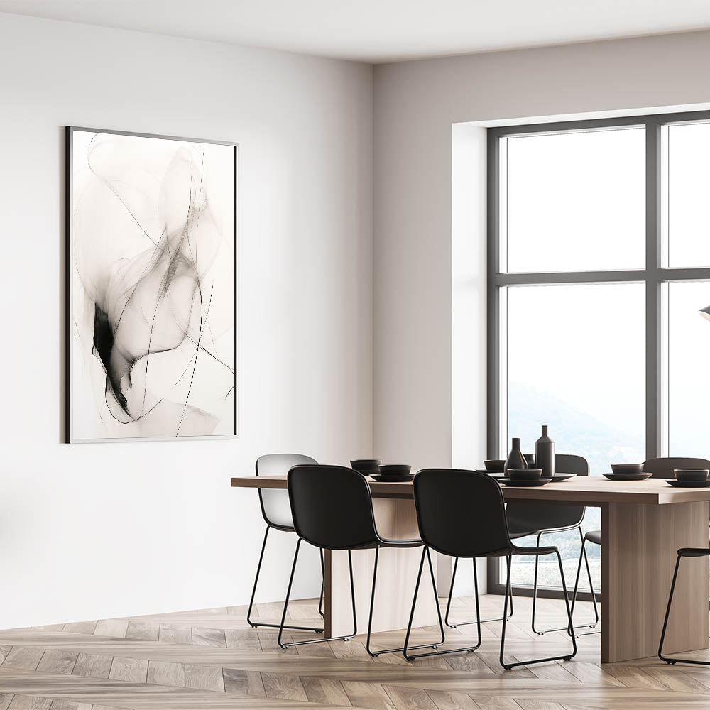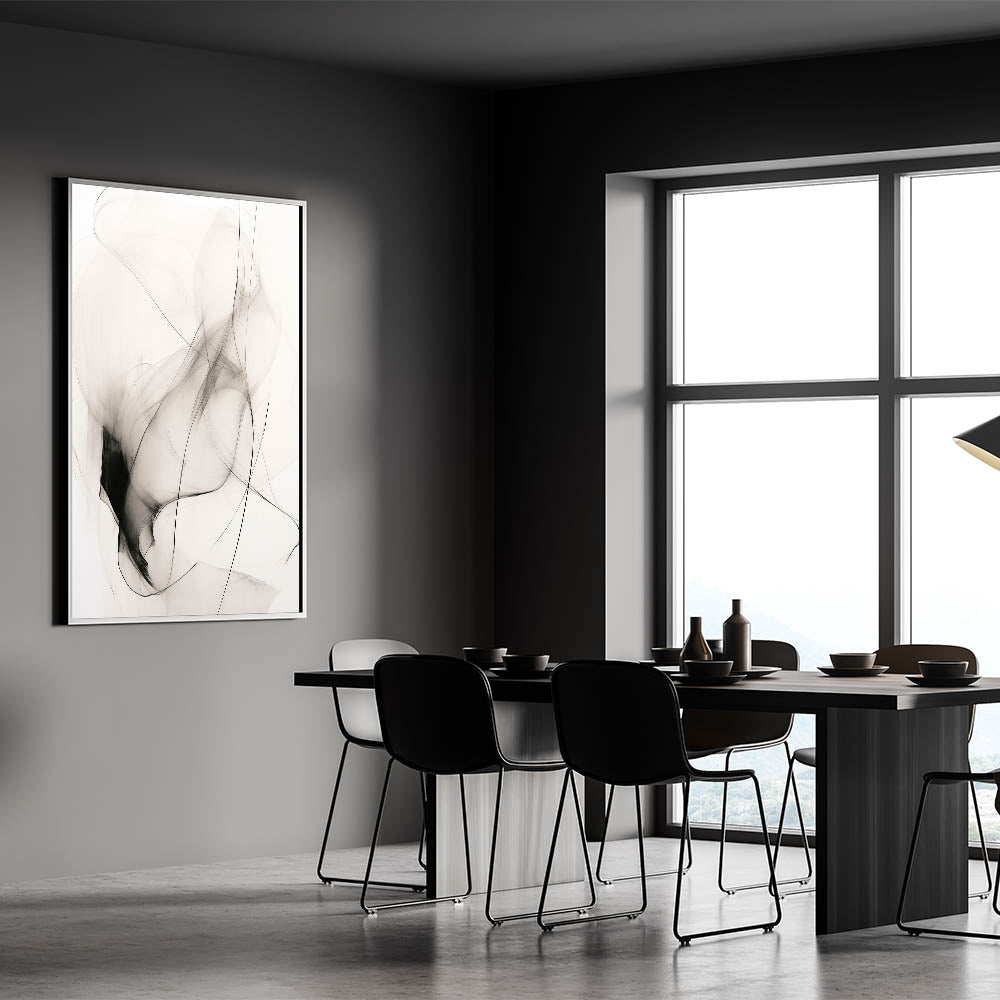 Bring a sense of fluidity and elegance to your living space with this abstract minimalist wall art. Featuring delicate black lines that intertwine gracefully across a white background, this piece embodies the minimalist art style. The soft, flowing forms create a calming and ethereal feel, making it a perfect addition to modern and minimalist home decor. The simplicity of the design is striking, offering a stylish wall decor option for those looking to add a subtle yet impactful art piece to their living room, bedroom, or office.