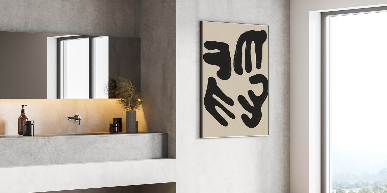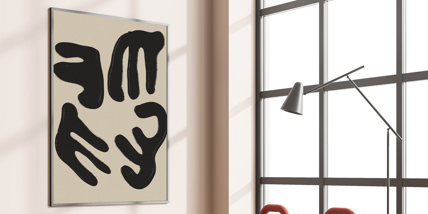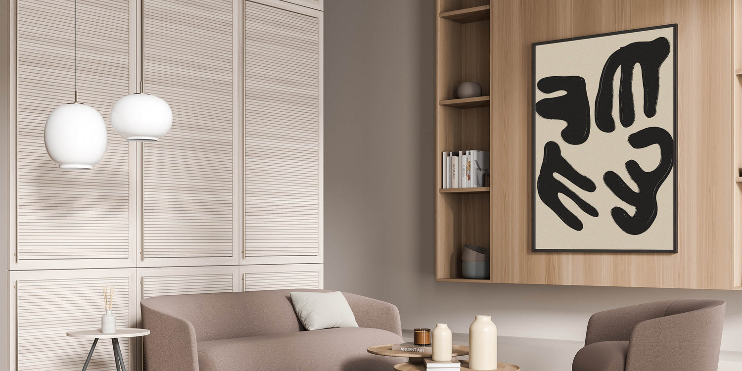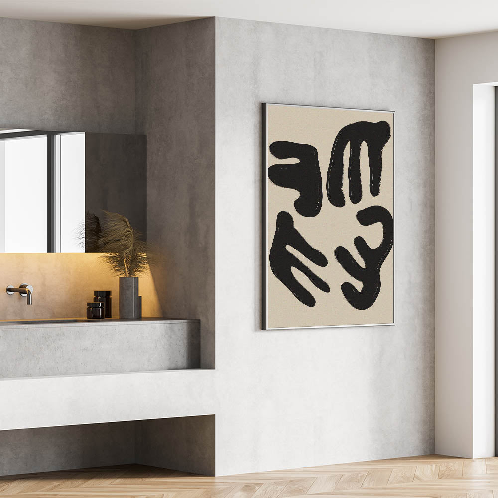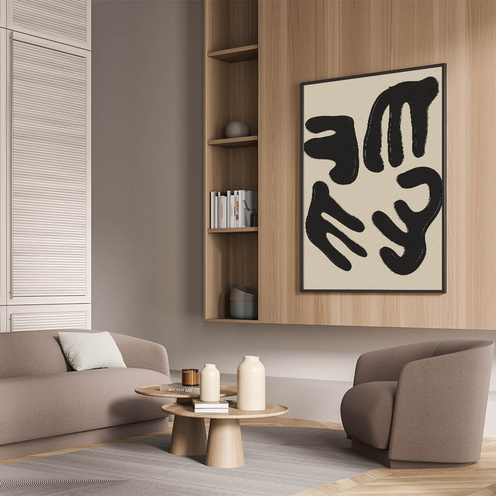 Elevate your space with this captivating minimalist wall art. Featuring a striking composition of abstract black forms on a soft beige background, this modern minimalist art piece embodies simplicity and elegance. Its clean lines and bold shapes make it a perfect choice for contemporary spaces, providing a stylish focal point for your living room, bedroom, or office.