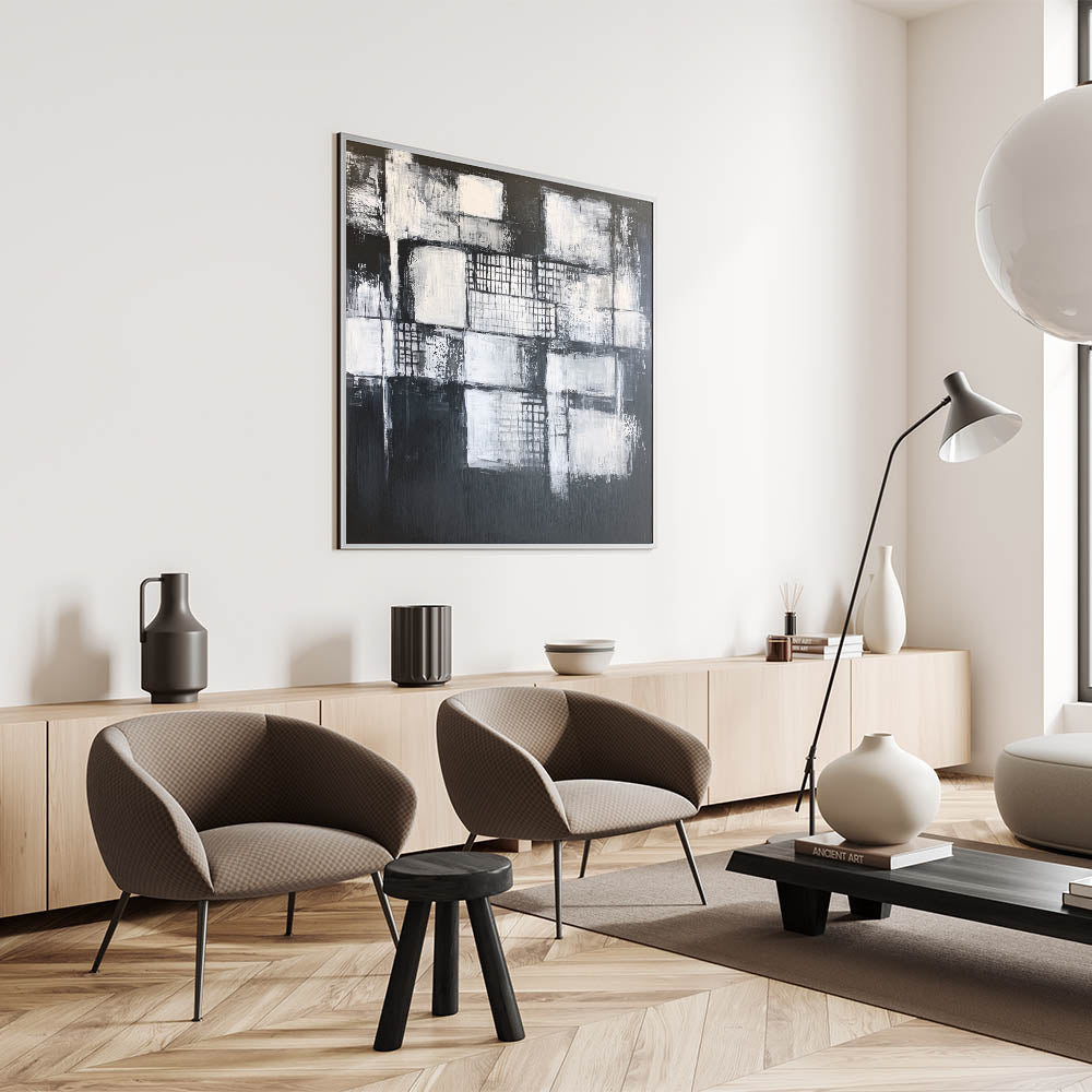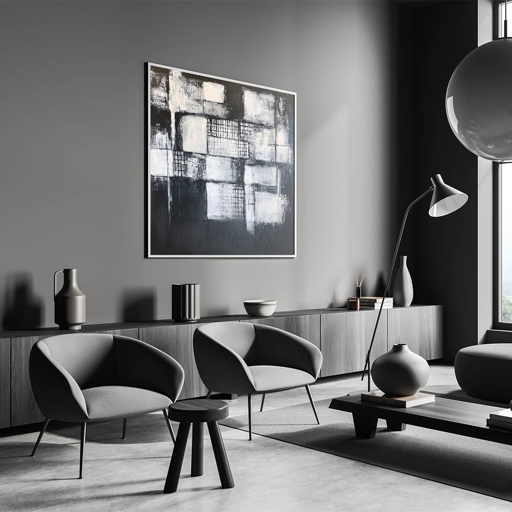 Add a bold yet sophisticated touch to your space with this minimalist wall décor, featuring an expressive blend of black, white, and gray geometric forms. This modern abstract wall art presents a structured yet organic arrangement of textured squares and intersecting lines, creating a visually captivating contrast. The monochrome palette ensures versatility, making it an ideal addition to contemporary, industrial, and minimalist interiors.